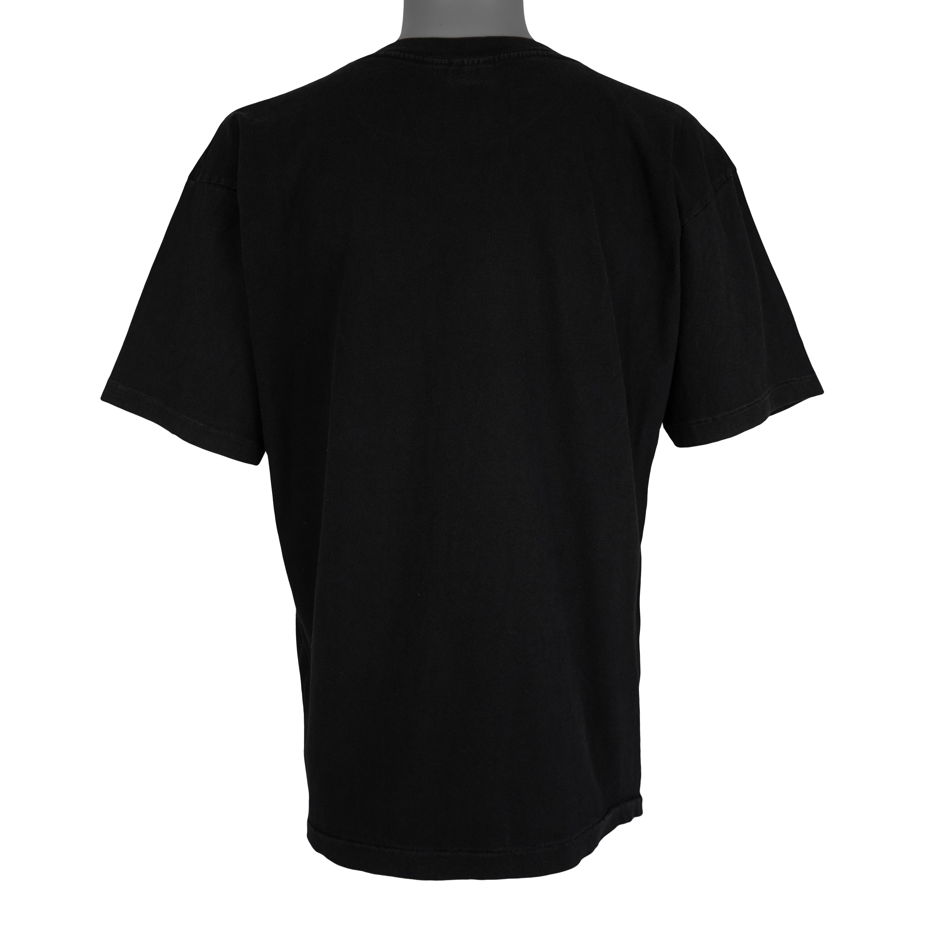 1990s Vintage NFL Kansas City Chiefs T-Shirt. Black in color with spell-out and logo, fitting a large size with signs of wear, shows aging on screen-print and is otherwise in very good condition.