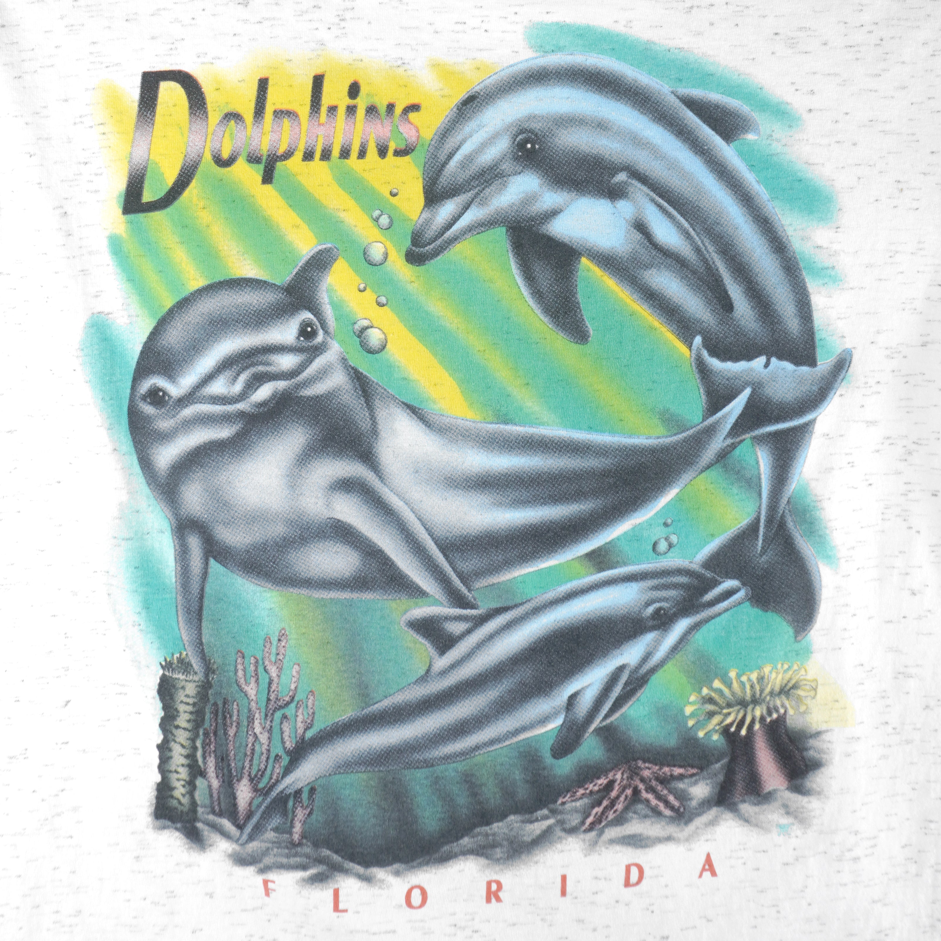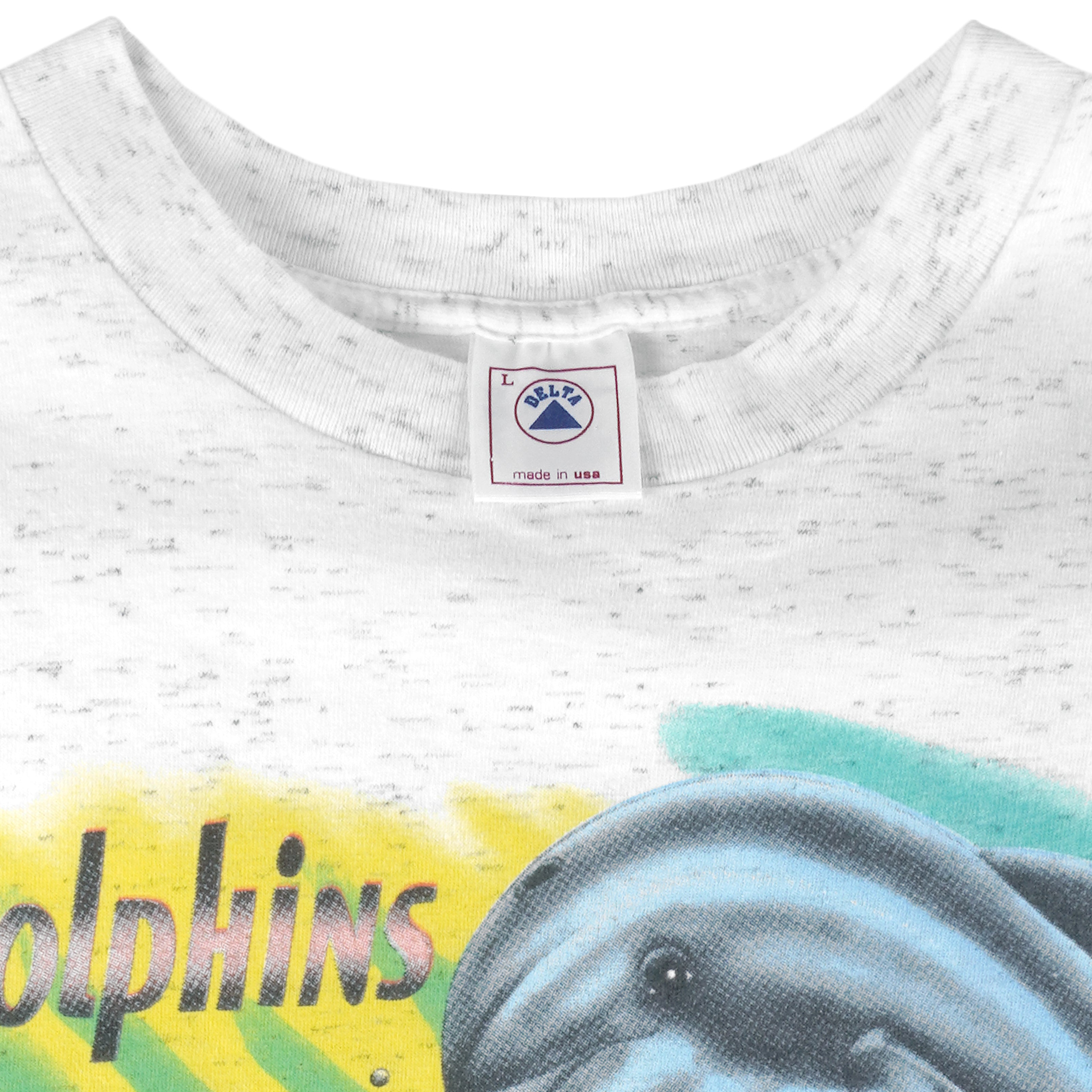 1990s Vintage Florida Dolphins Ocean Life Animal Printed T-Shirt by Delta. Light grey in color, fits medium to large size and is in excellent/new condition.