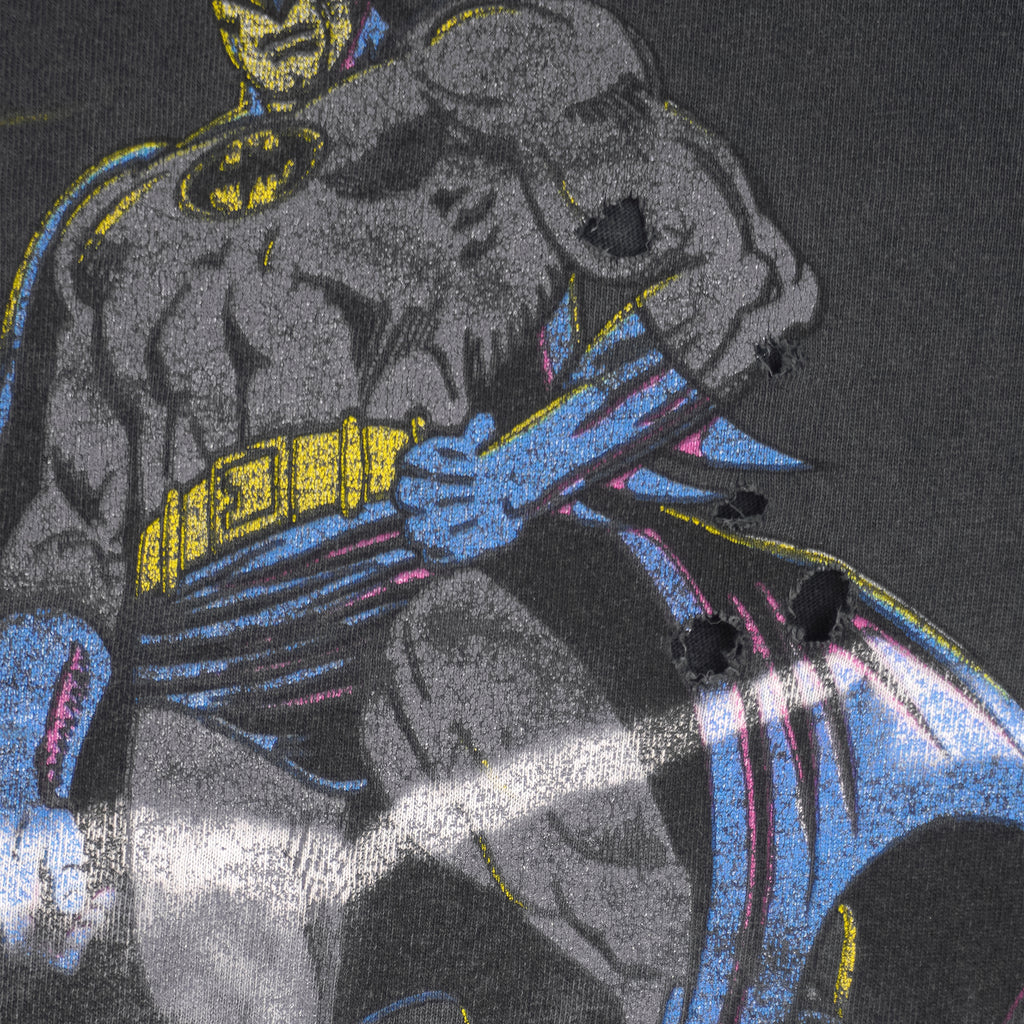 1989s Vintage DC Comics Batman Tie Dye T-Shirt. Black & white in color, fitting a large size with marks, worn collar, holes on front, some fading and is otherwise in good condition.