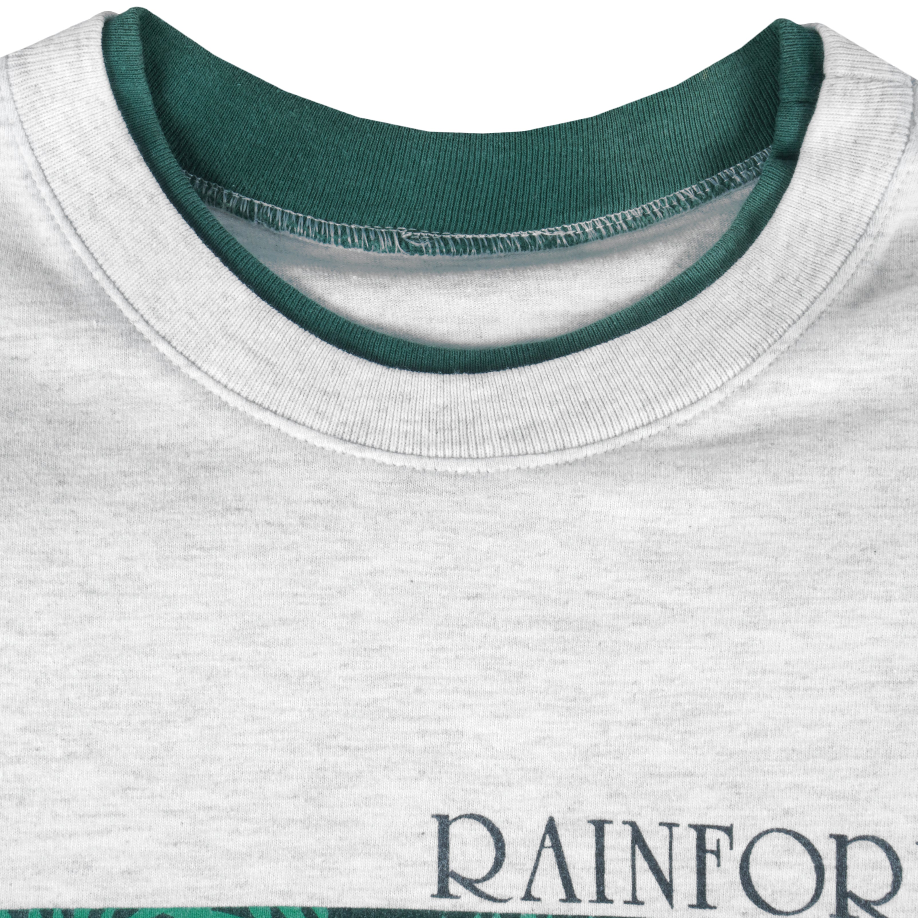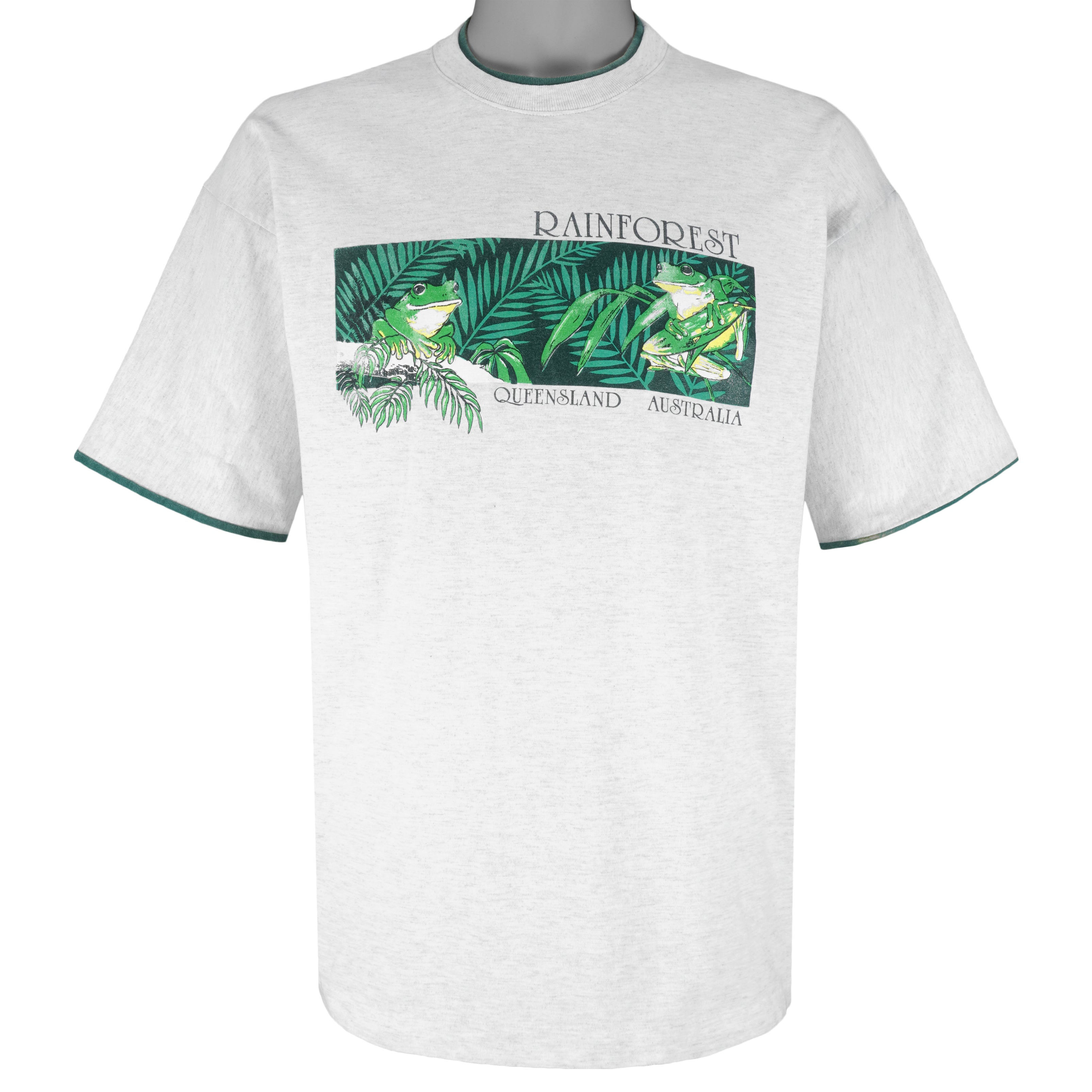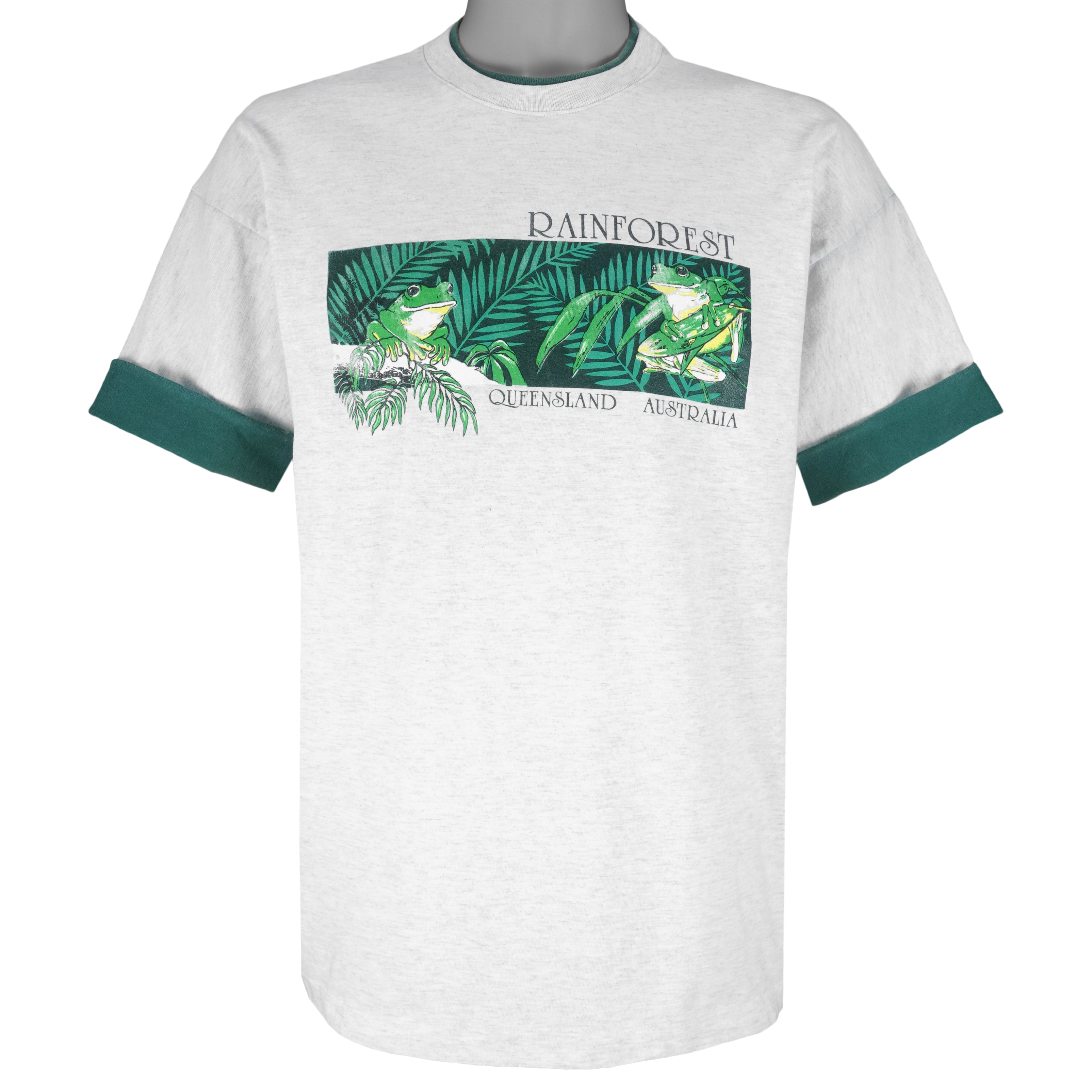 1993 Vintage Rainforest Frogs Queensland, Australia Roll Up Sleeves T-Shirt. Grey with green in color, tag is X-large but fits like large size and is in very good condition.