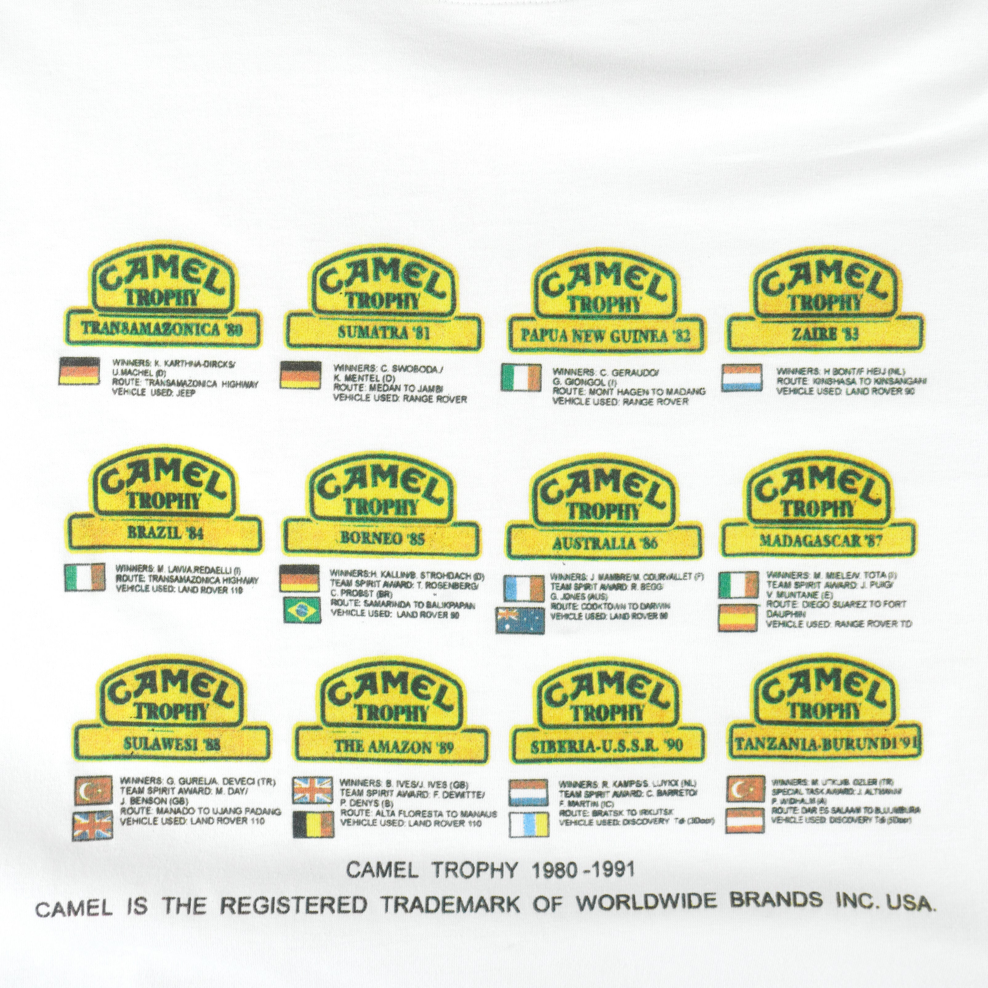 1991 Vintage Marlboro Camel Trophy World Wide Brand Single Stitch T-Shirt. White in color, fits a large size with minor marks on sleeve and is otherwise in excellent condition.
