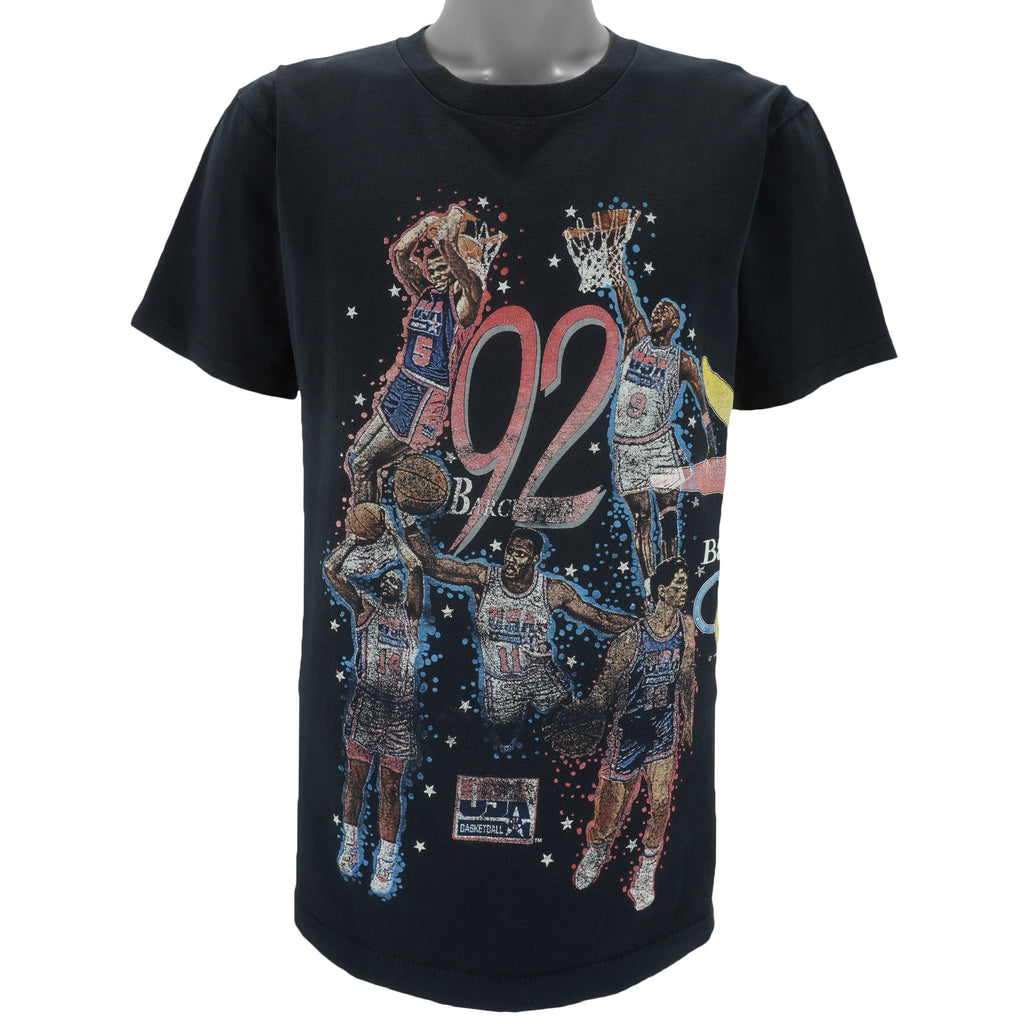 1992 Vintage USA Basketball Dream Team Barcelona Chris Mullin, Michael Jordan, Magic Johnson, Patrick Ewing, etc T-Shirt by Salem. Black in color, fits large tall size with signs of wear, marks and faded and is otherwise in fair/good condition.