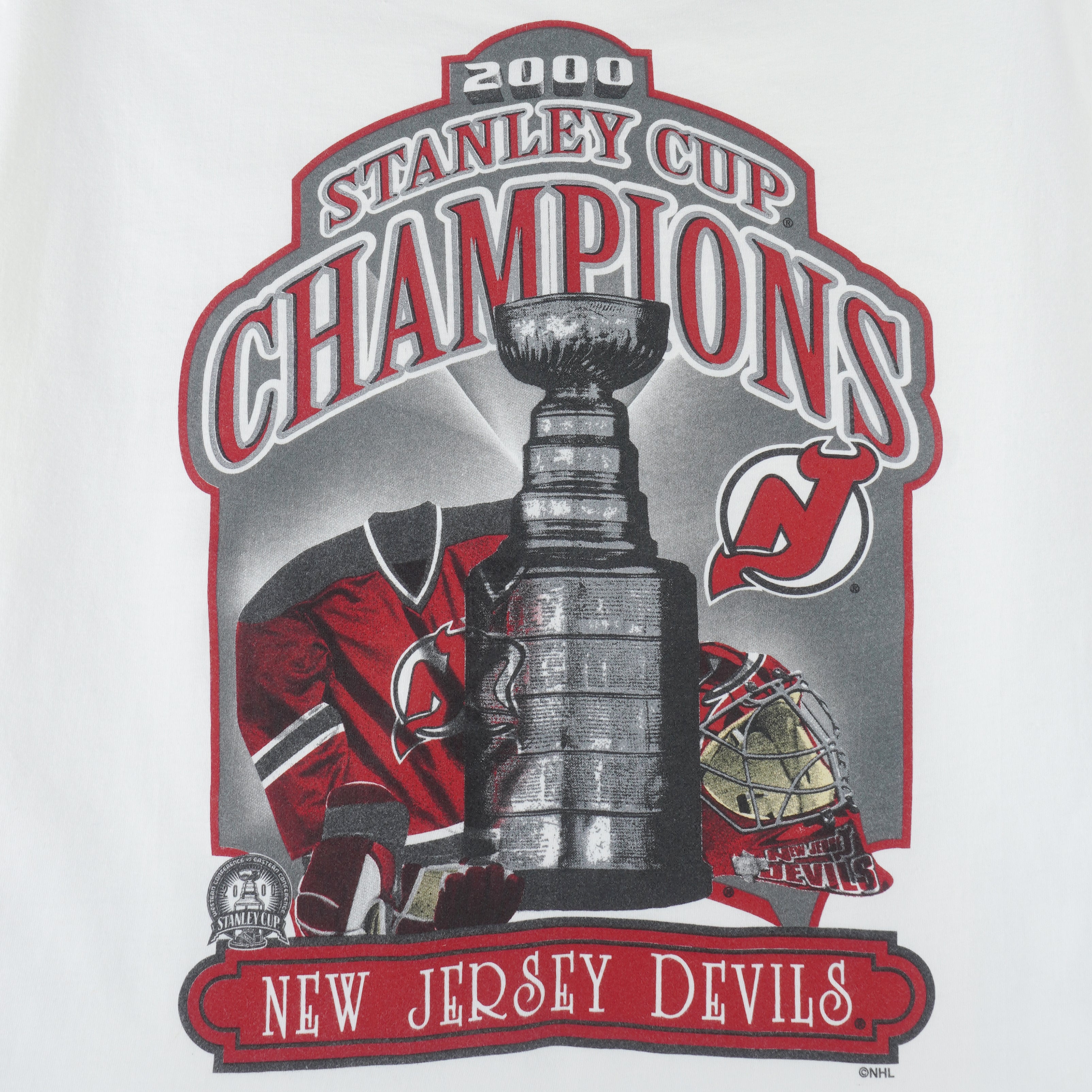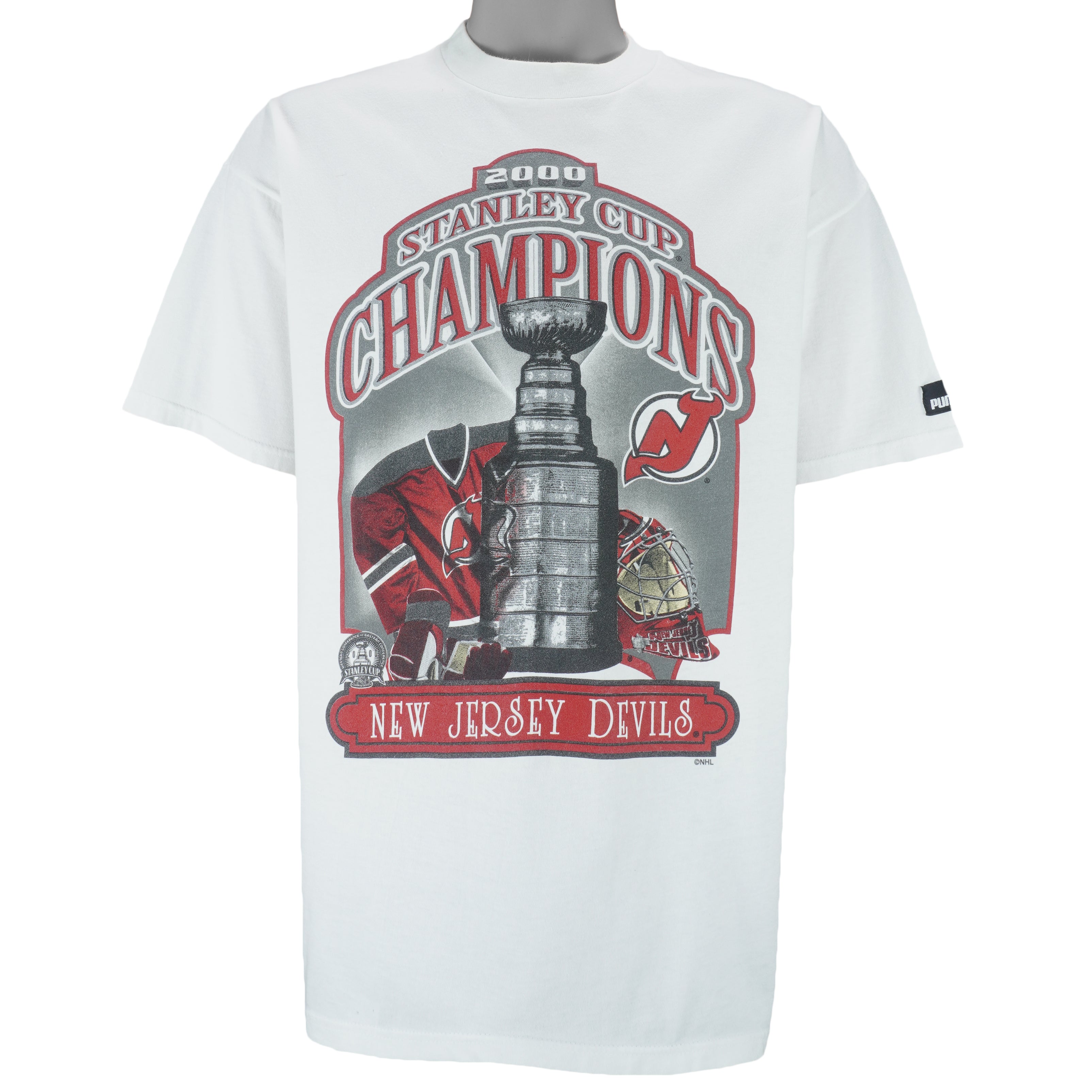 2000 Vintage Puma NHL New Jersey Devils Stanley Cup Champions Colin White No. 5 T-Shirt. White in color, tag shows large but fits like an X-large size with signs of wear, worn-out on 'W' logo and is otherwise in very good condition.