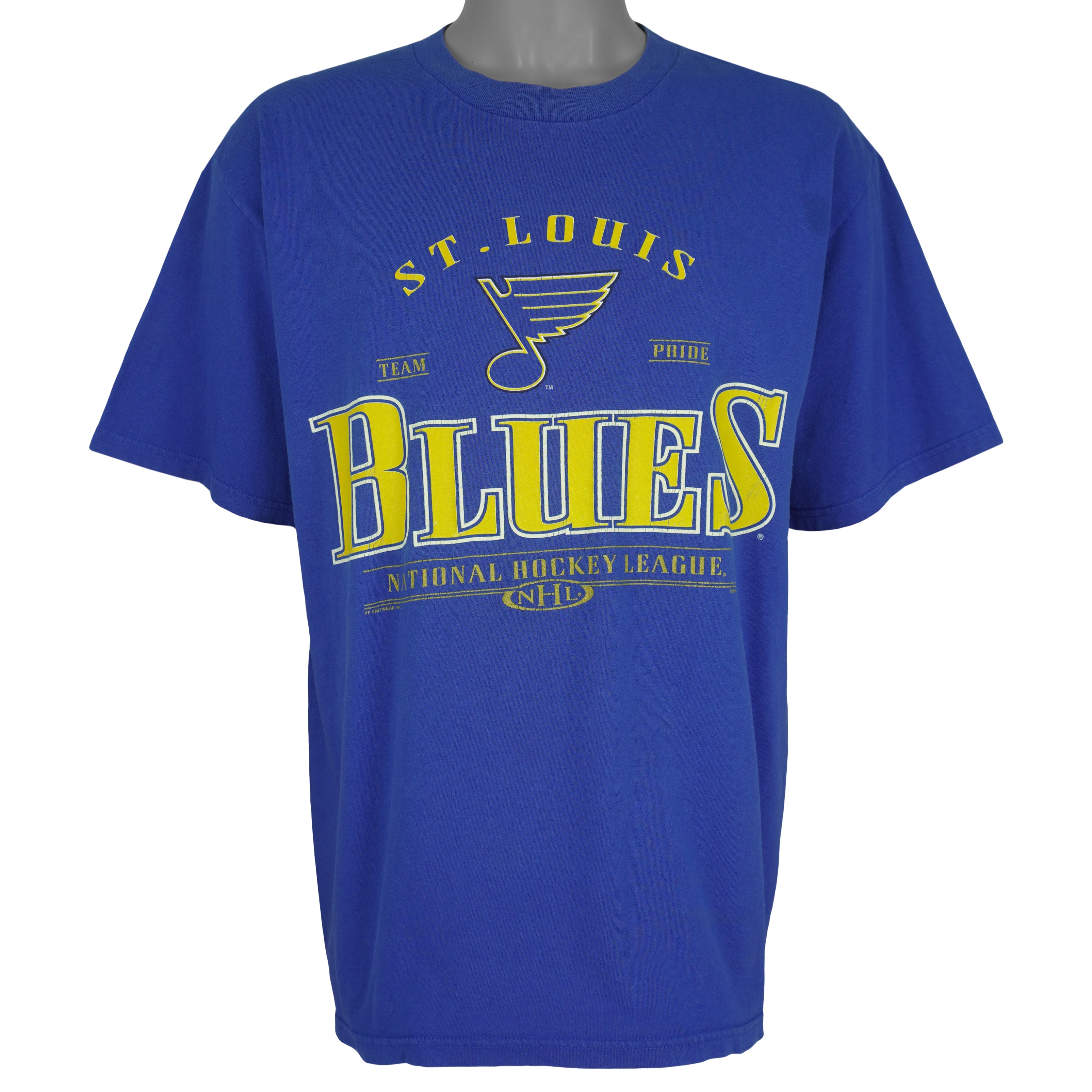 1990s Vintage NHL St. Louis Blues Team Pride T-Shirt by CSA. Blue in color with big logo & spell-out, fits a large size with signs of wear - minor marks and is otherwise in very good condition.