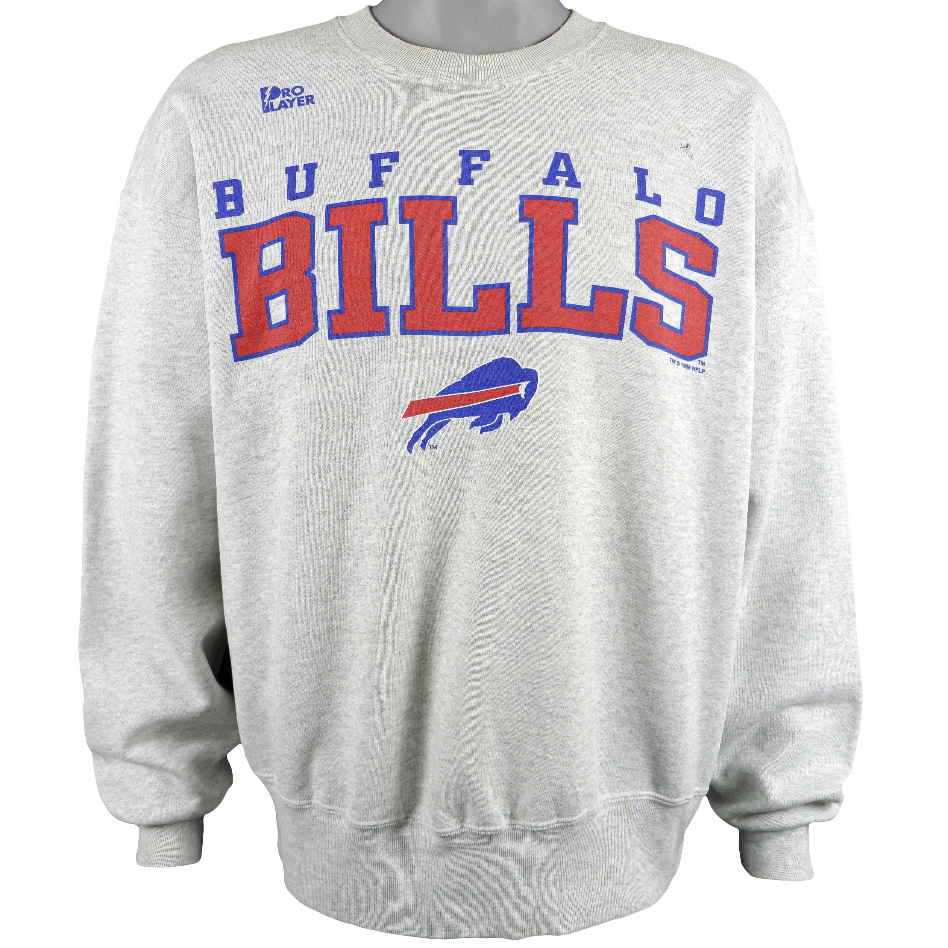 1996 Vintage NFL Buffalo Bills Crew Neck Sweatshirt by Pro Player. Grey in color with big spell-out and logo, fitting large size and is in excellent condition.