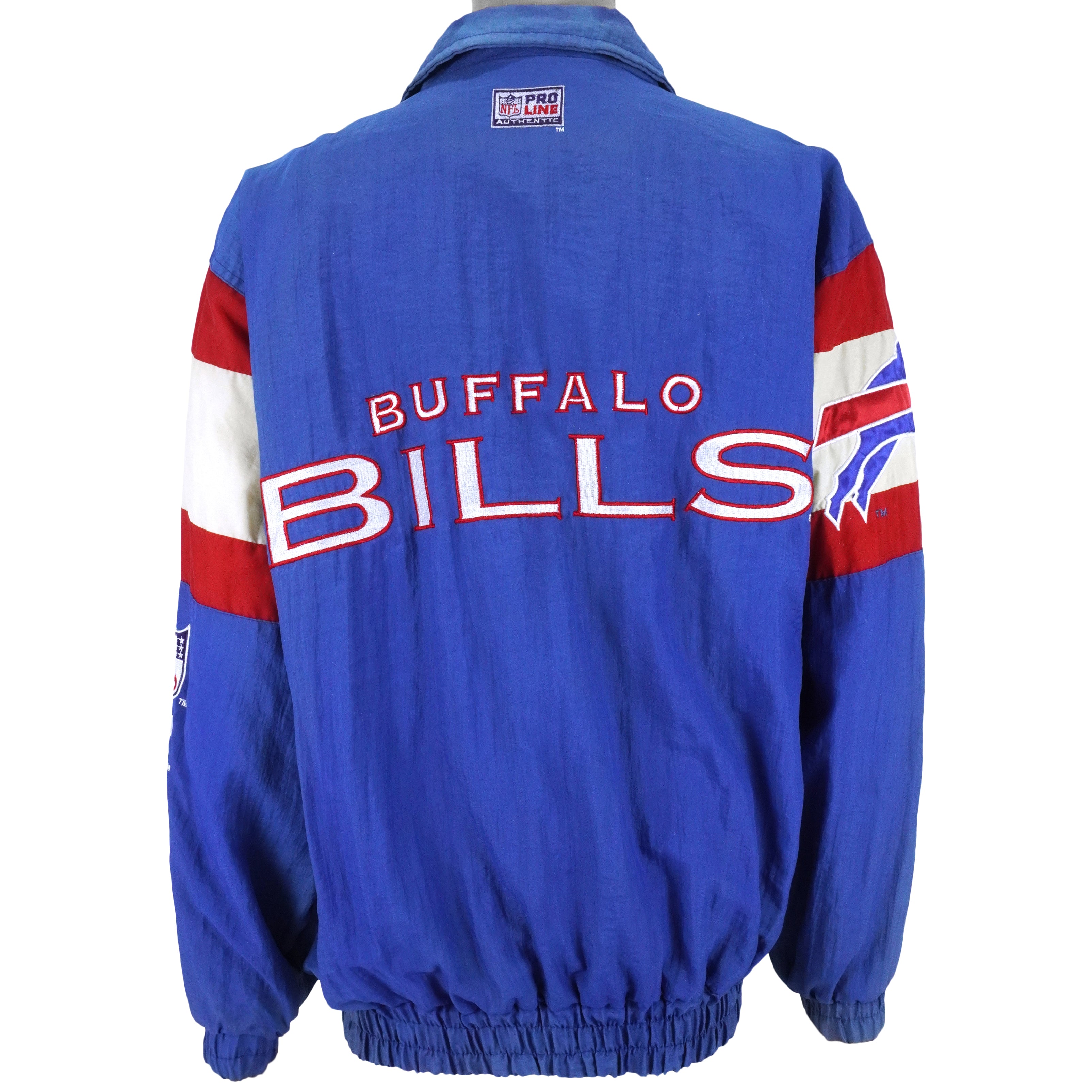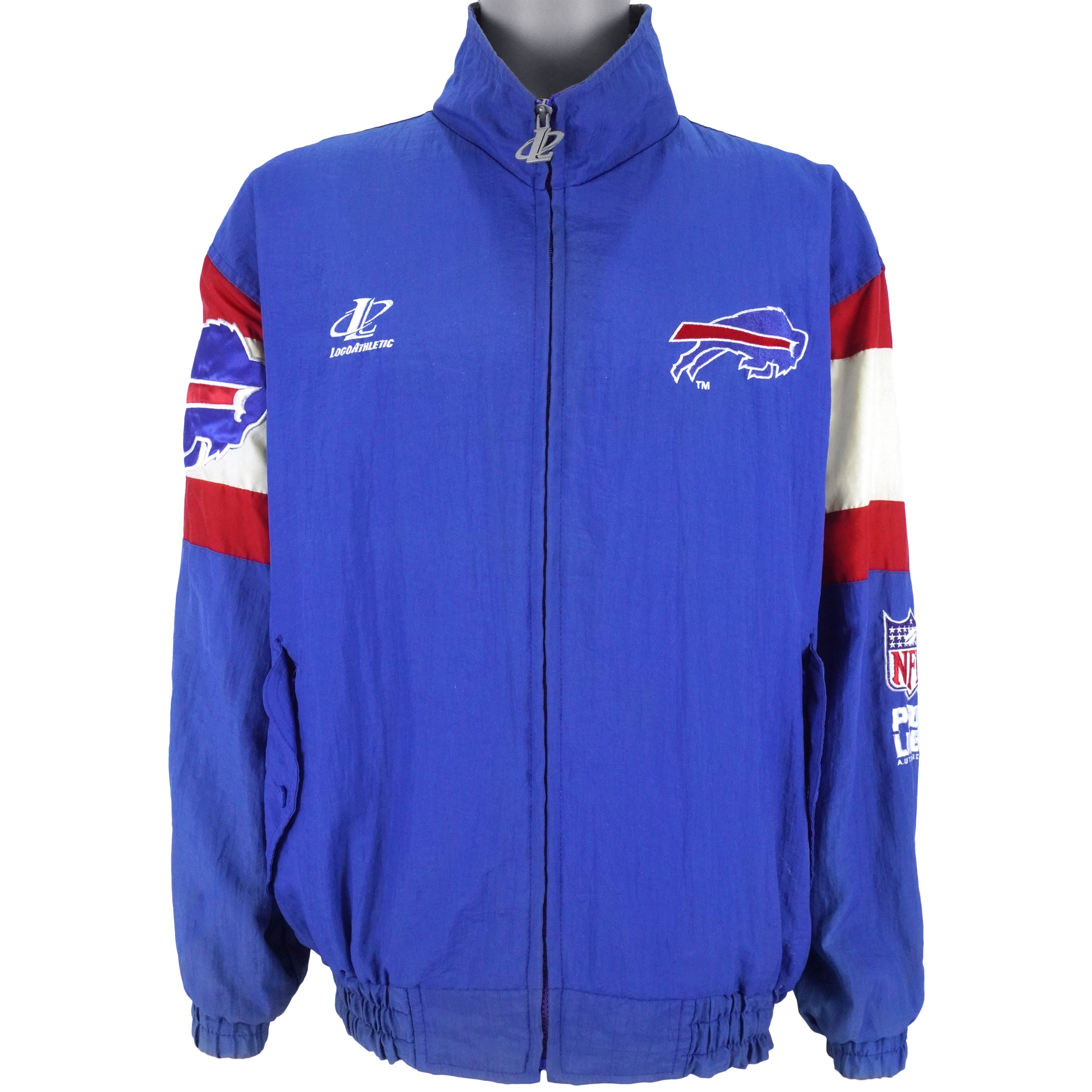 1990s Vintage NFL Buffalo Bills Spell-Out & Big Logo Embroidered Windbreaker by Logo Athletic. Blue with white and red in color, fits large size and in excellent condition.