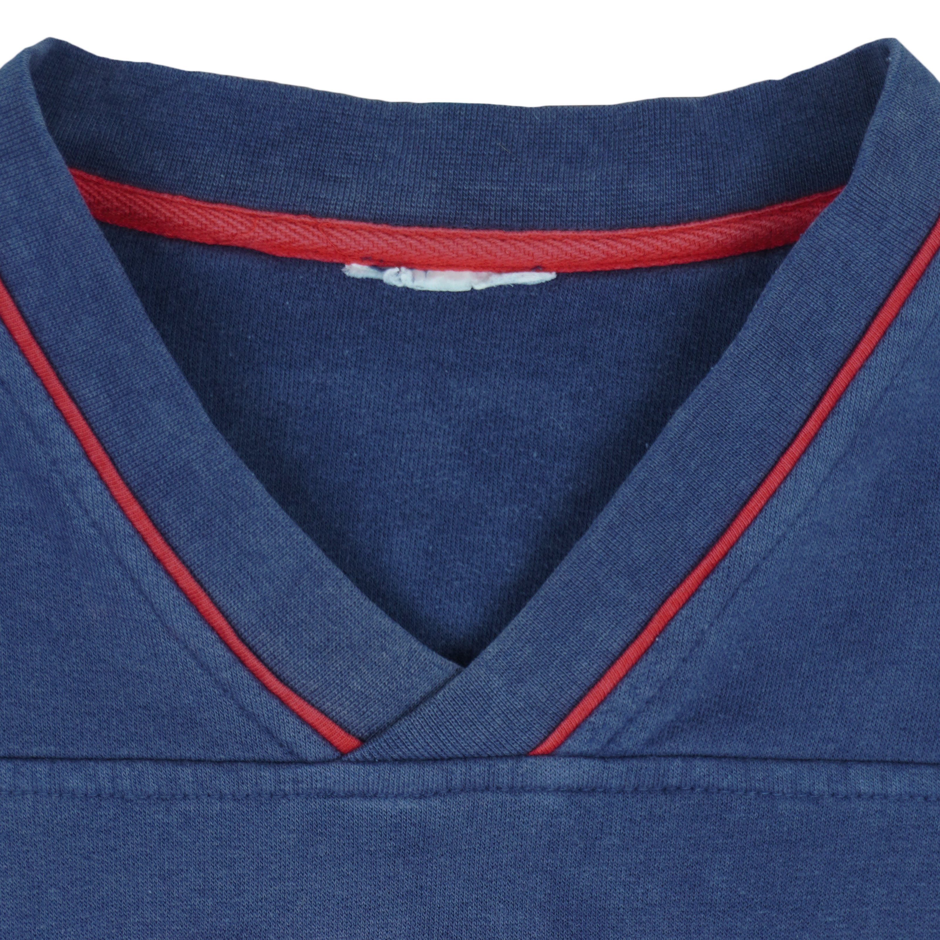1990s Vintage NFL New England Patriots Crewneck Sweatshirt. Navy blue in color with bold red embroidered "Patriots" lettering and logo, fits X-large size with discoloration and is otherwise in very good condition.