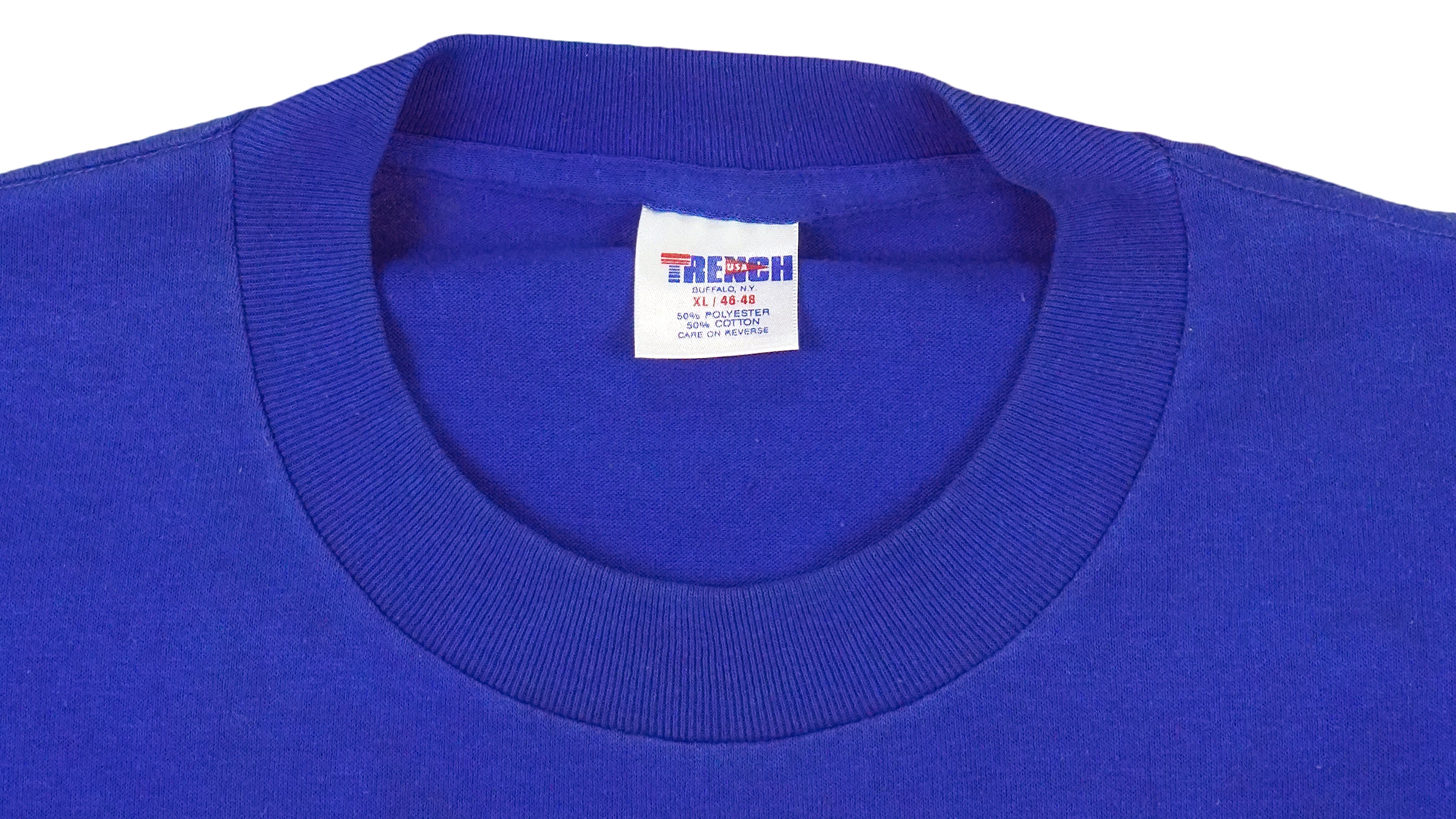 1990s Vintage NFL Buffalo Bills T-Shirt by Trench. Blue in color, big spell-out and logo, fits X-large and is in excellent condition.