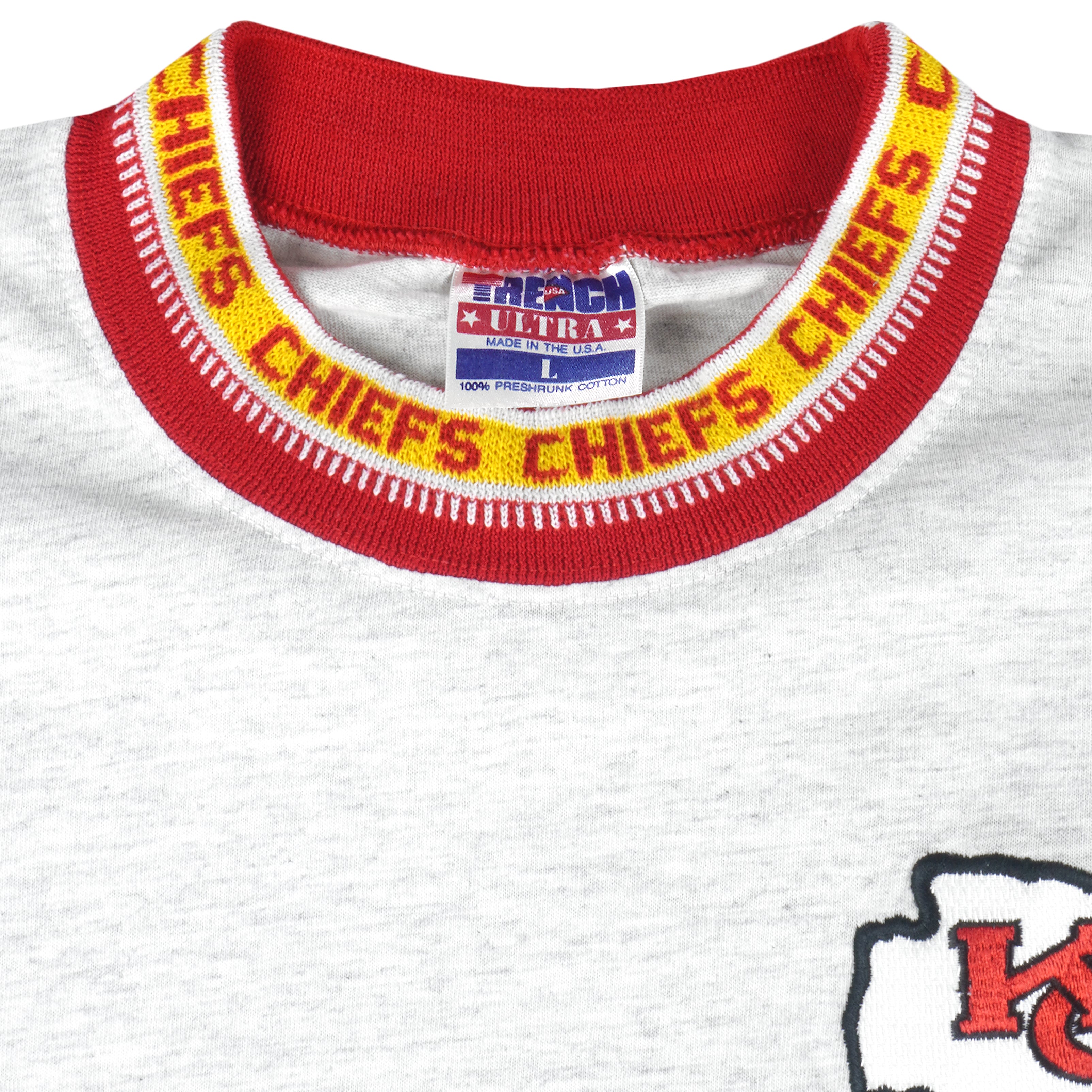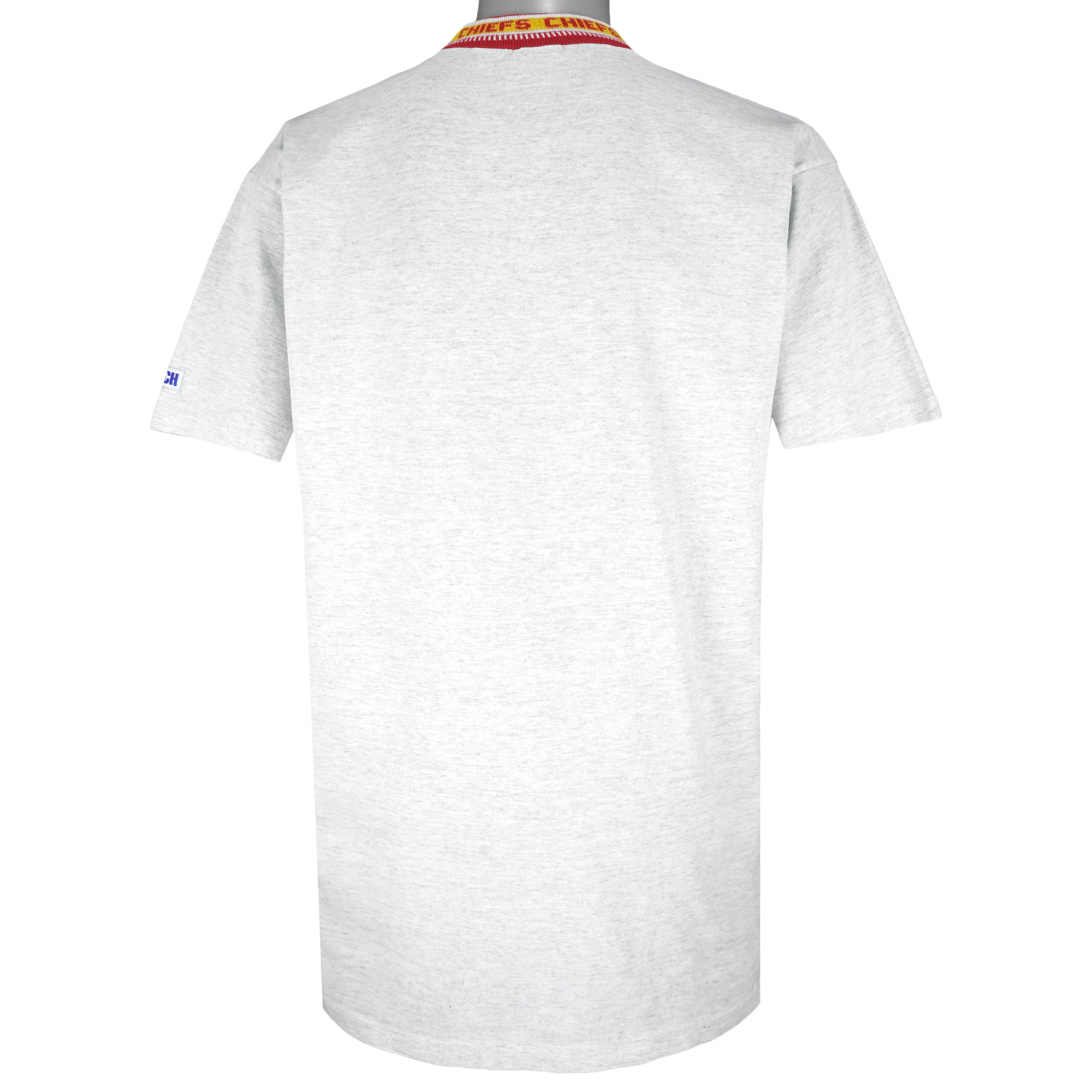 1990s Vintage NFL Kansas City Chiefs T-Shirt by Trench. Grey in color, spell-out and logo on right chest, fits large and is in excellent condition.