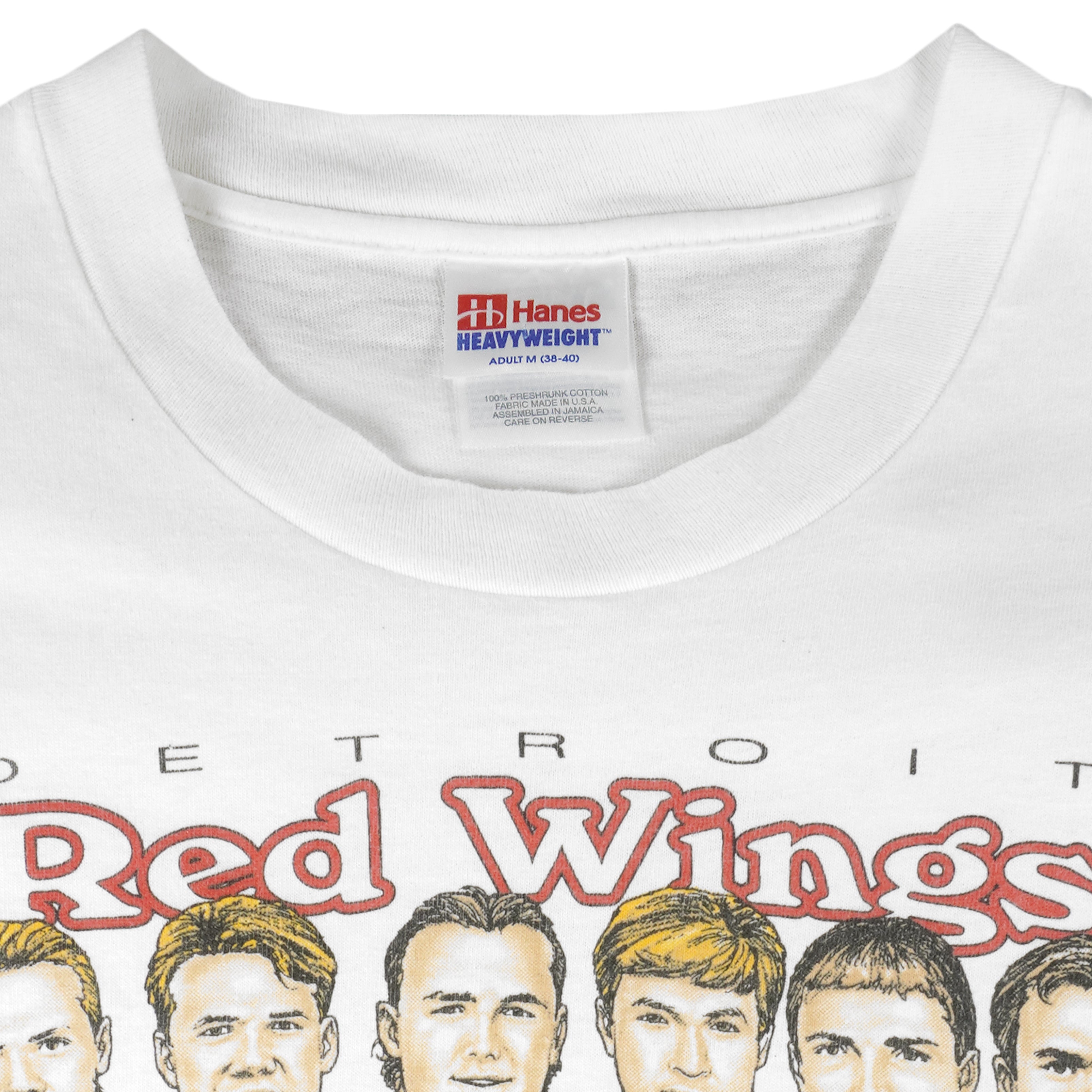 1997 Vintage NHL Detroit Red Wing Stanley Cup Champions Caricature T-Shirt By Hanes. White in color, big spell-out and logo. Fits medium size and is in excellent condition.