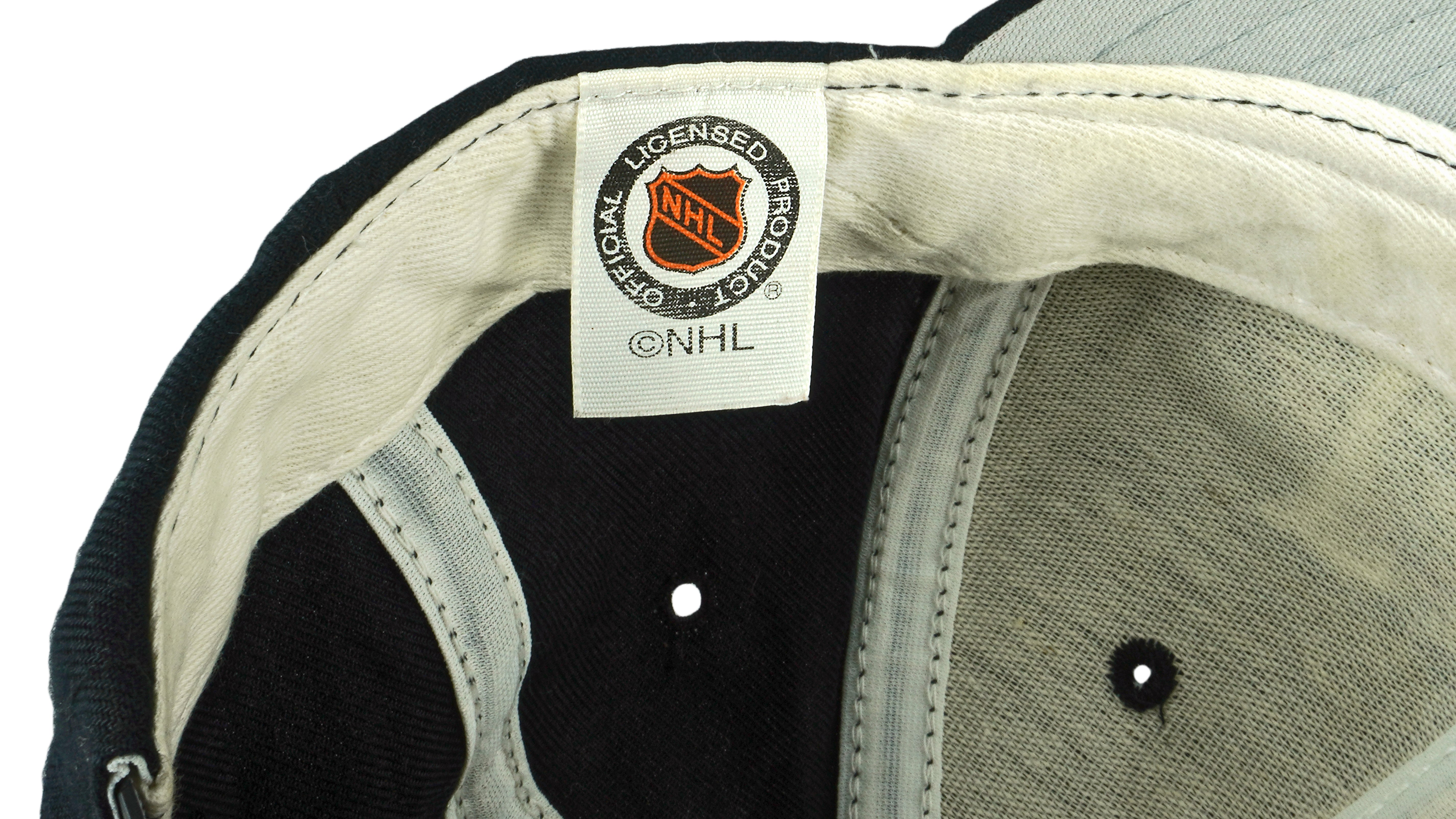 1990s Vintage NHL New Jersey Devils Spell-Out Snap Back Hat with giant center logo by New Era. Black in color, adjustable size and is in excellent condition.