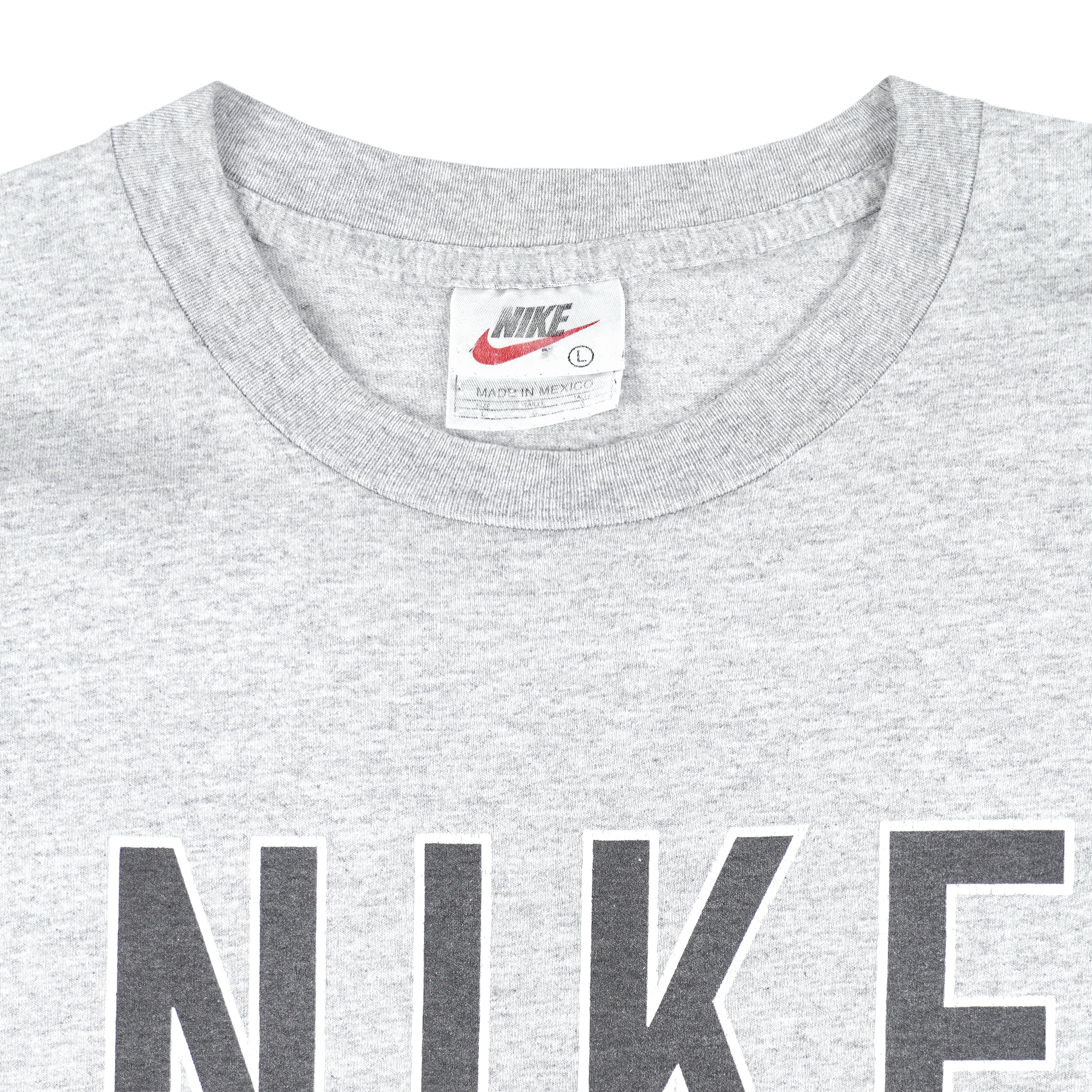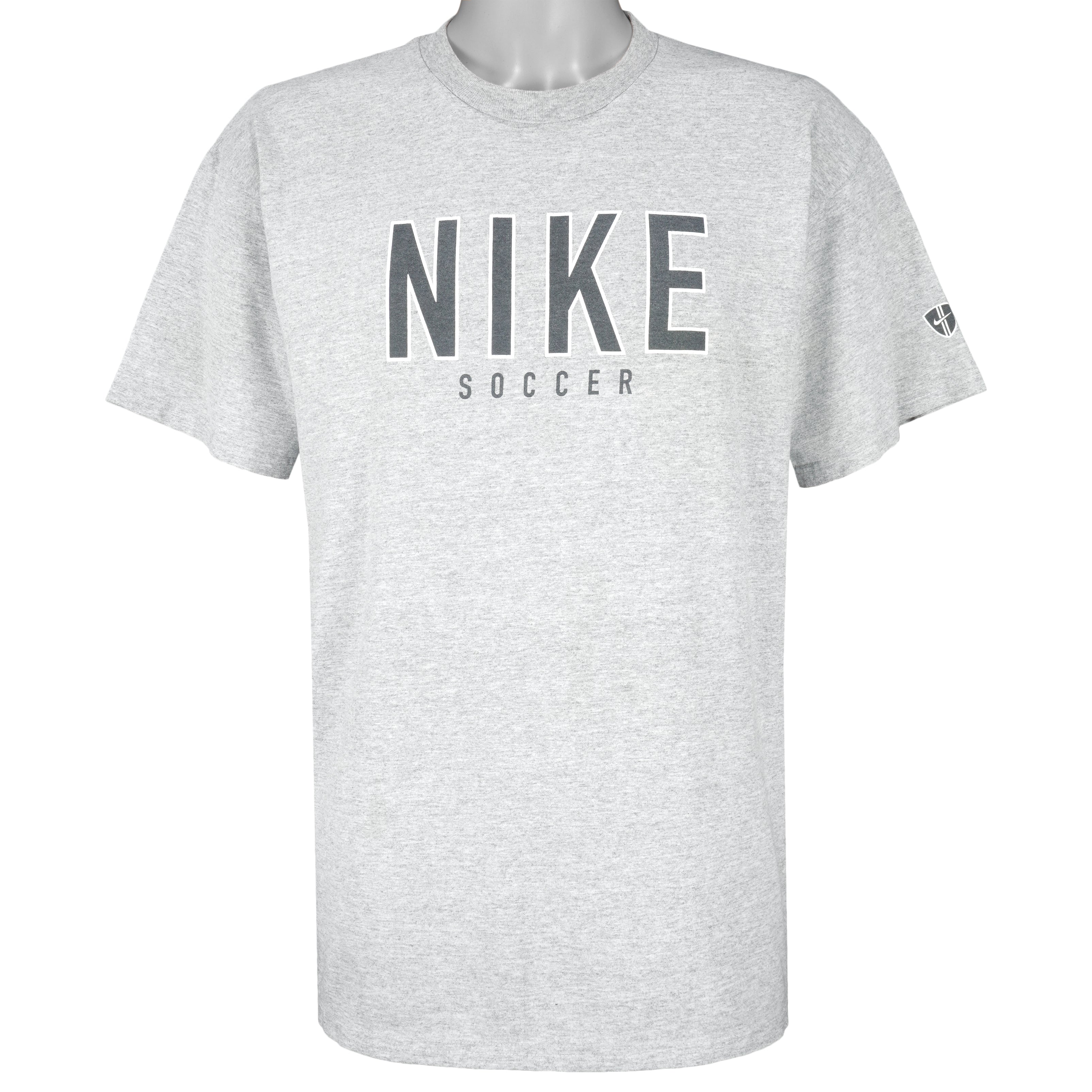 1990s Vintage Nike Grey Tag Soccer T-Shirt. Grey in color with big spell-out and logo. Fits large size and is in excellent condition.