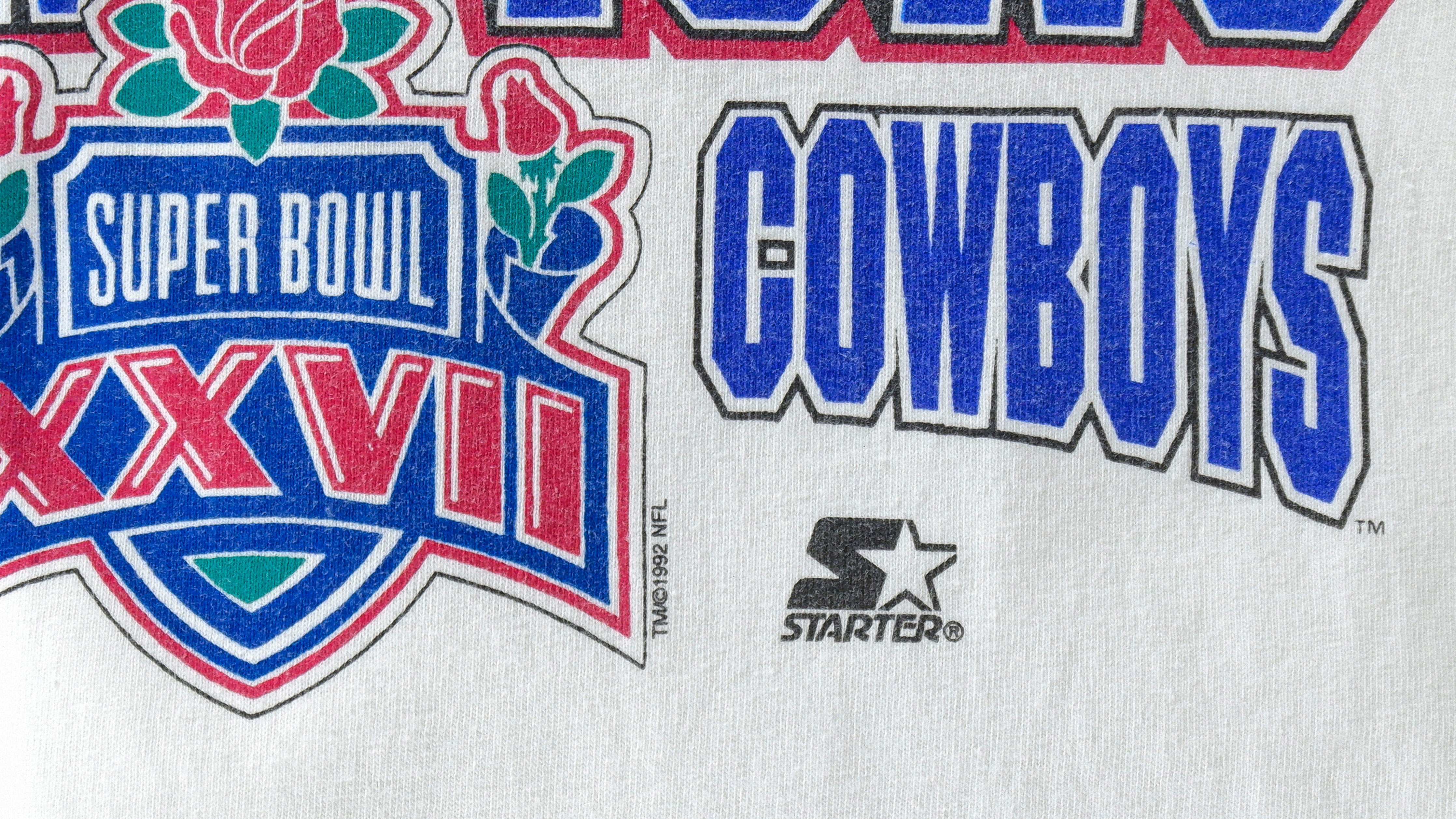 1992 Vintage Starter NFL Dallas Cowboys Super Bowl Champions T-Shirt. White in color, with big logo and spell-out. Fitting large size, and is in excellent condition.
