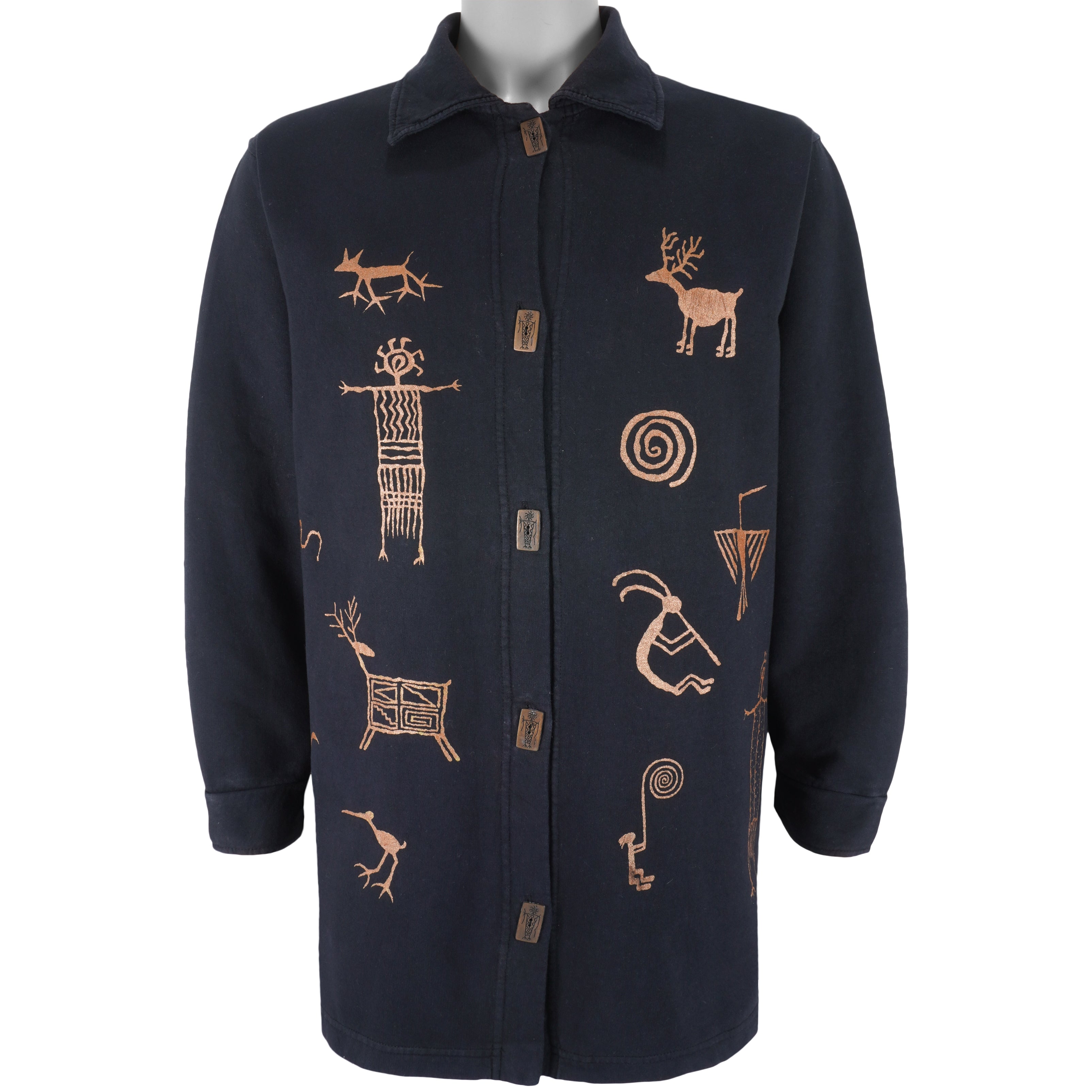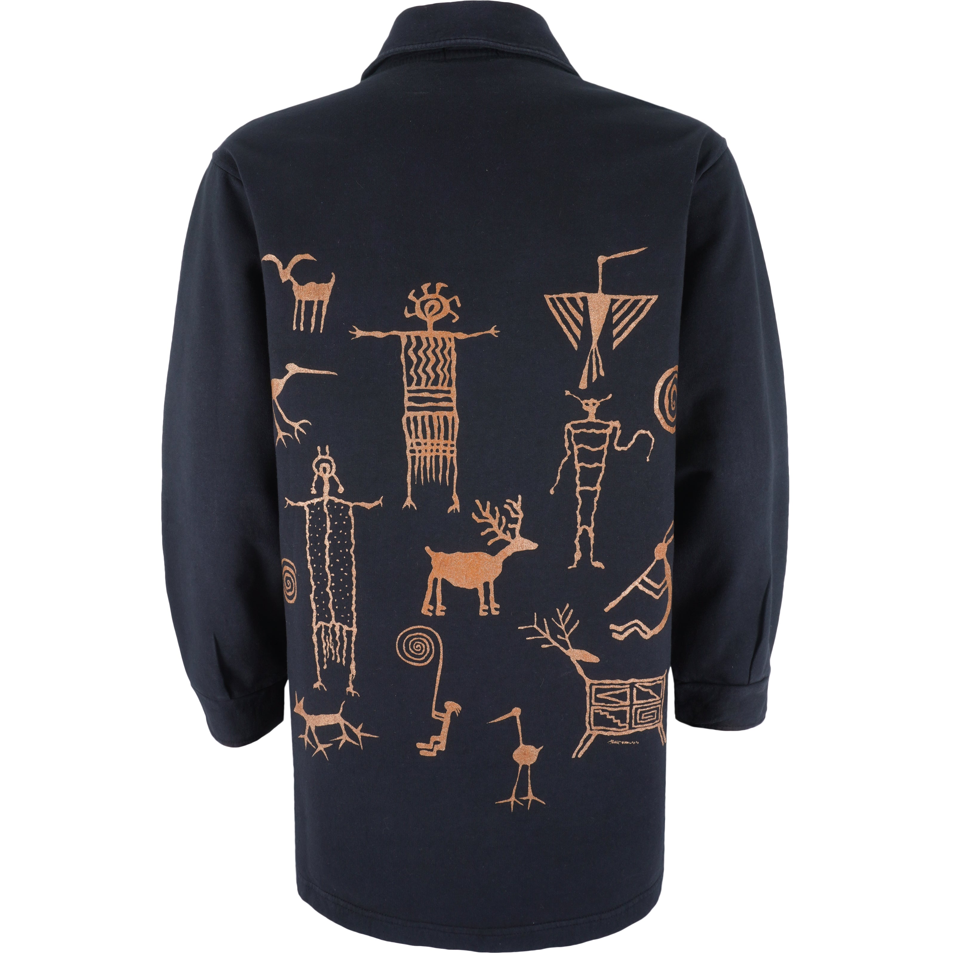 1990s Vintage Native Petroglyph Tribal Art Animals Drawing Jacket. Black in color, fits X-large size and is in excellent condition.