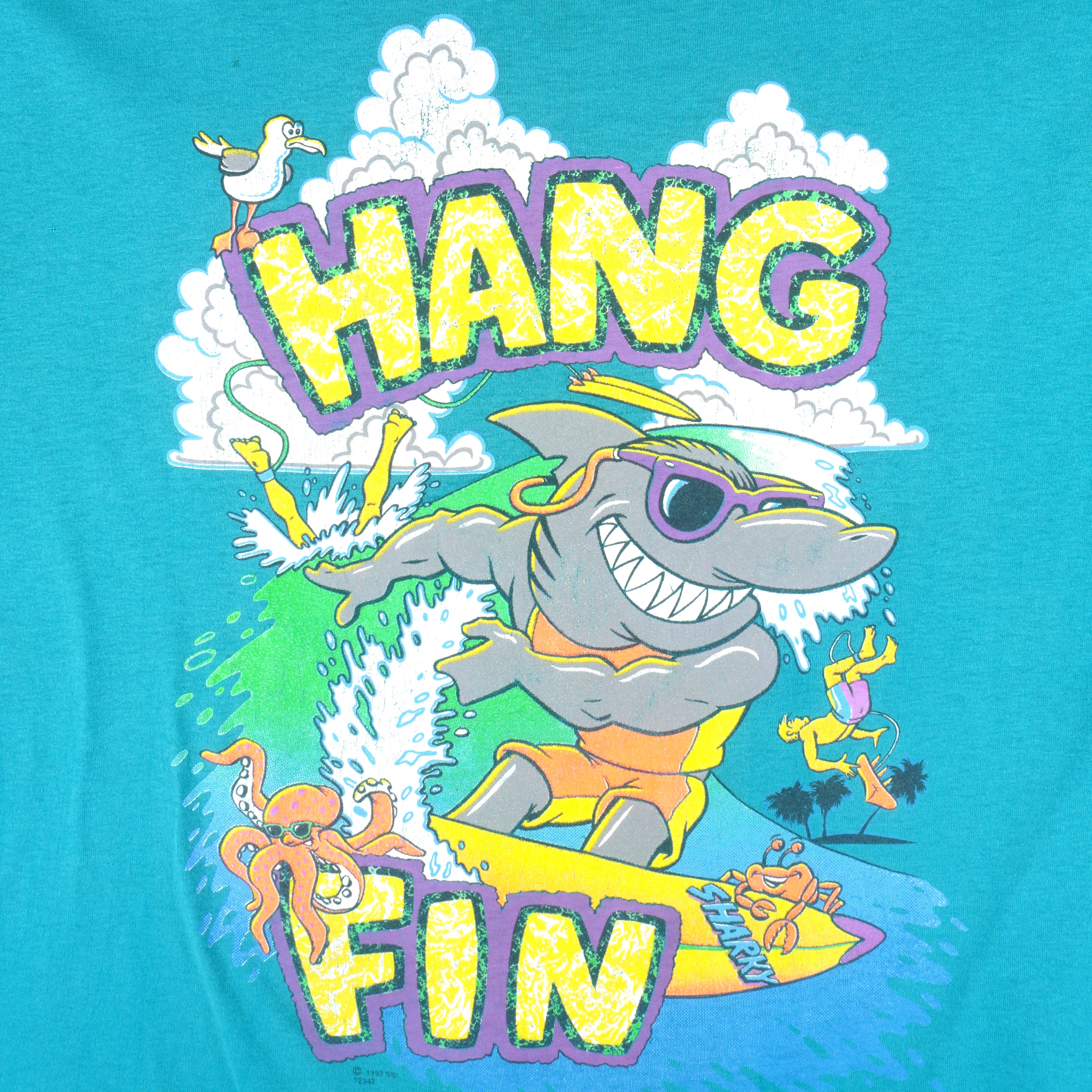 1992 Vintage Hang Fin Sharky Surfing Single Stitch T-Shirt. Baby blue in color, fits large size and is in excellent condition.