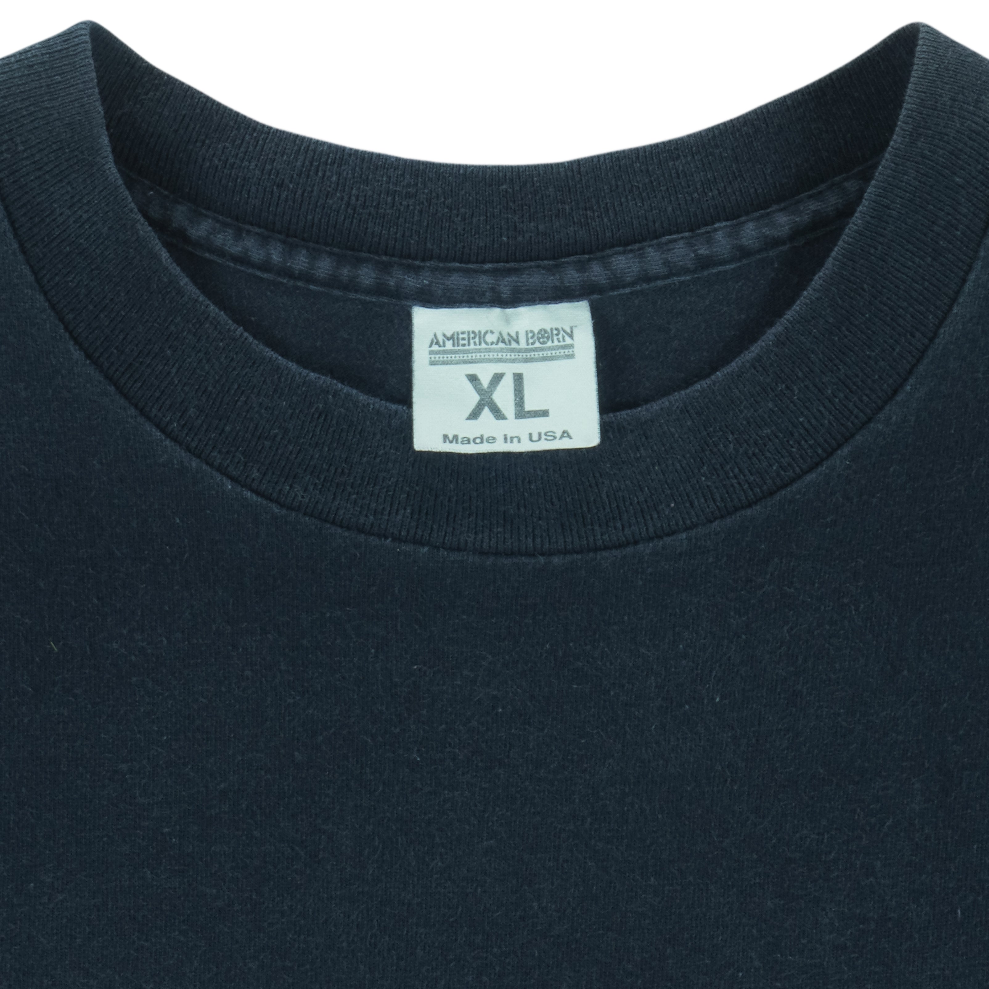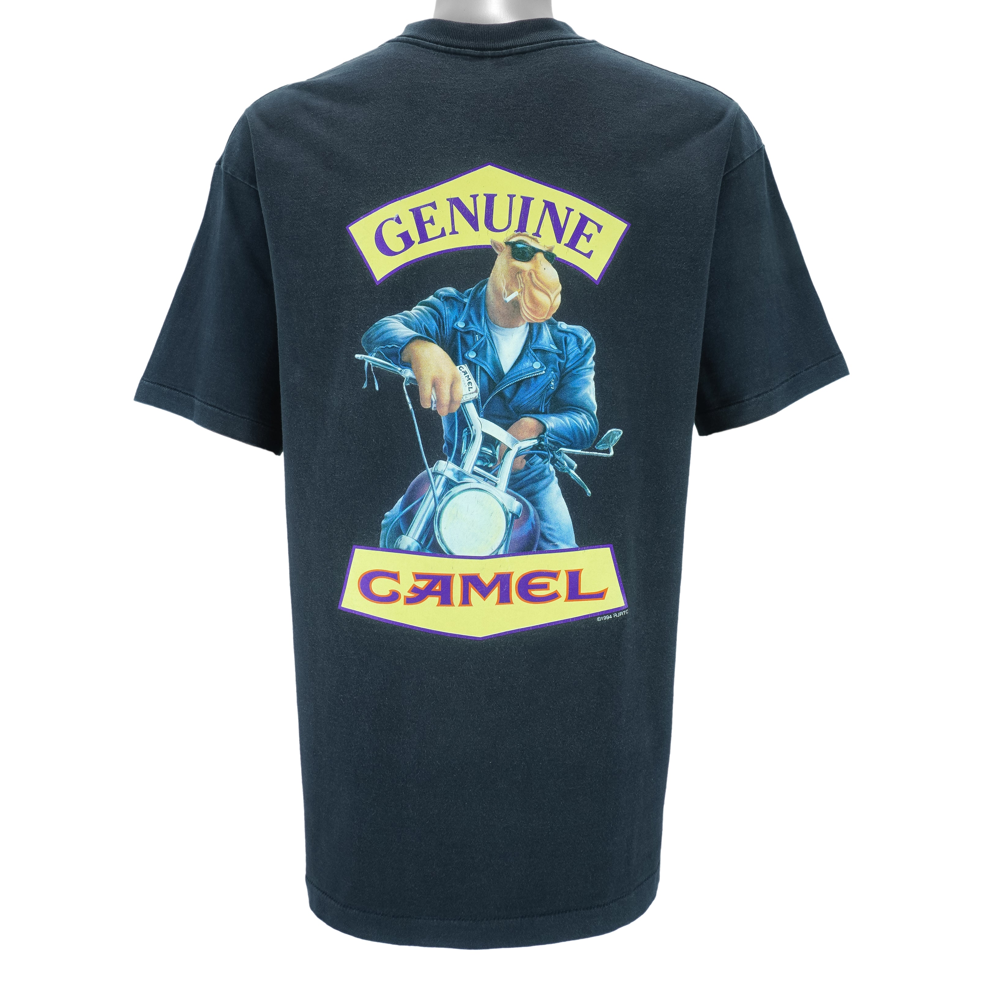1993 Vintage Camel Joe on Motorbike Genuine Taste Single Stitch T-Shirt by American Born. Black in color, fits X-large size and is in very good condition.