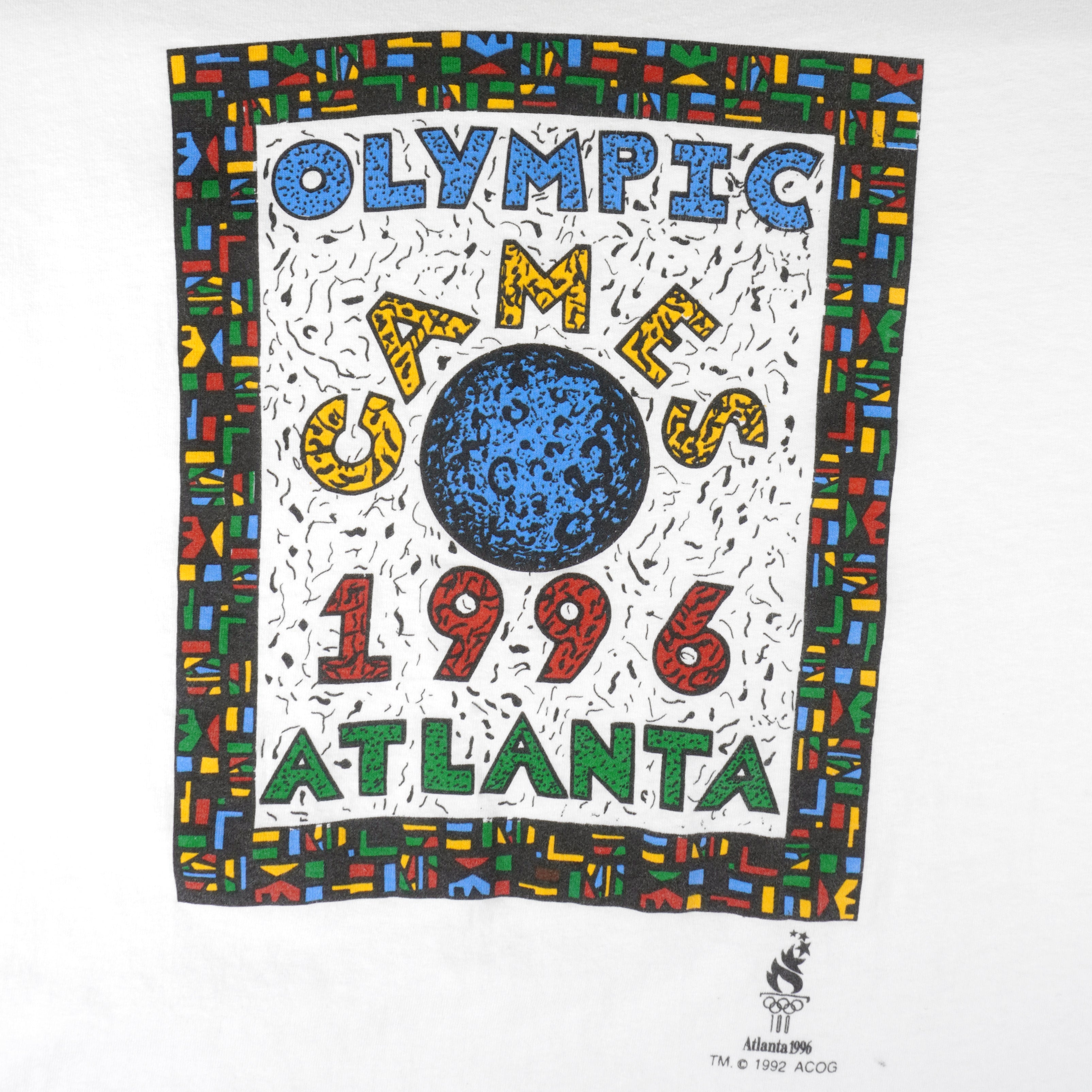 1996 Vintage Atlanta Olympic Single Stitch T-Shirt by Hanes. White in color with big spell-out, fits large size and is in excellent condition.