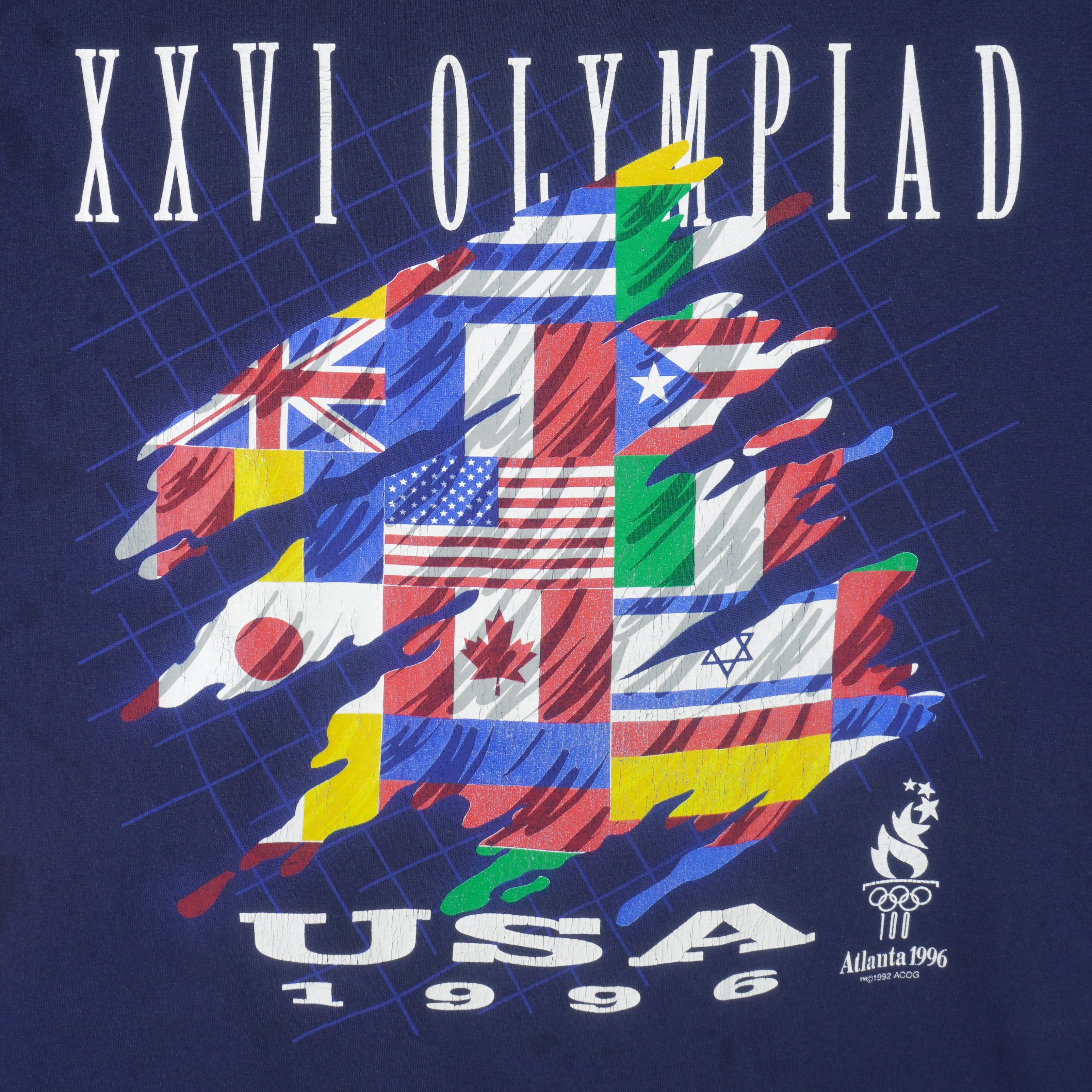 1996 Vintage Atlanta USA Olympic XXVI Olympiad flags T-Shirt by Hanes. Dark blue in color with big spell-out, tag is XX-large but fits like X-large size and is in good condition.