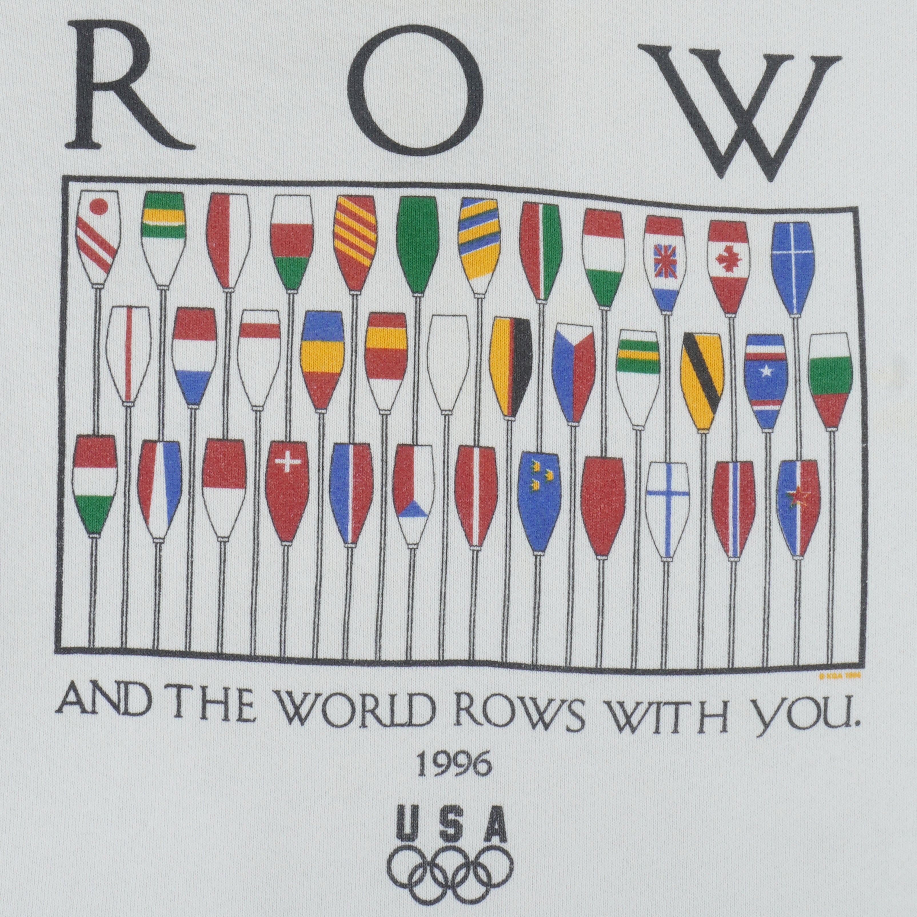 1996 Vintage USA Olympic Games And the World rows with you - Rowing Crew Neck Sweatshirt by Hanes. White in color, fits large size, with some staining around the sleeve cuffs and is otherwise in very good condition.