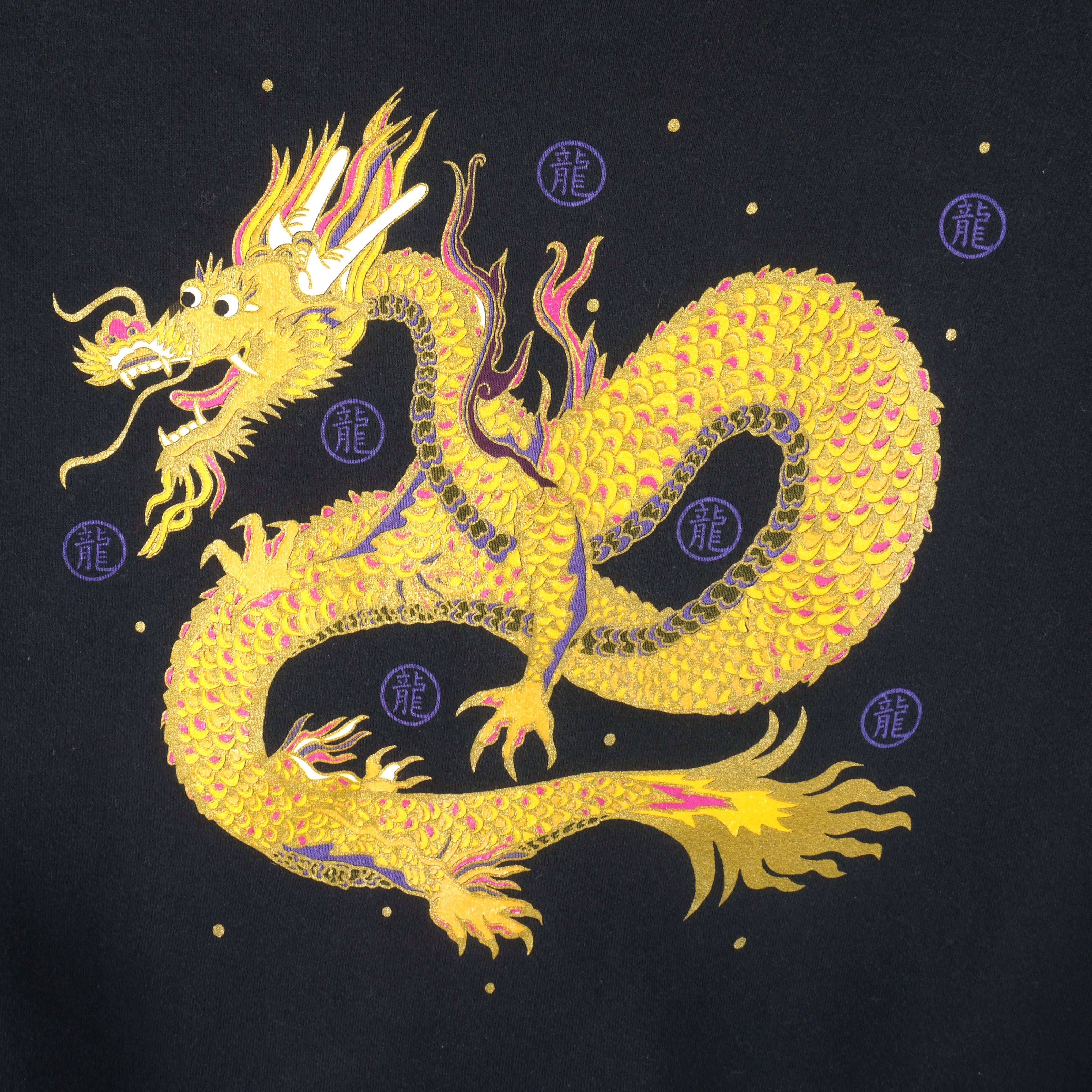 1990s Vintage Golden Chinese Dragons Crew Neck Sweatshirt by Lee. Black in color, fits XX-large size and is in excellent condition. Always symbolize wealth, prosperity, strength, harvest and power.
