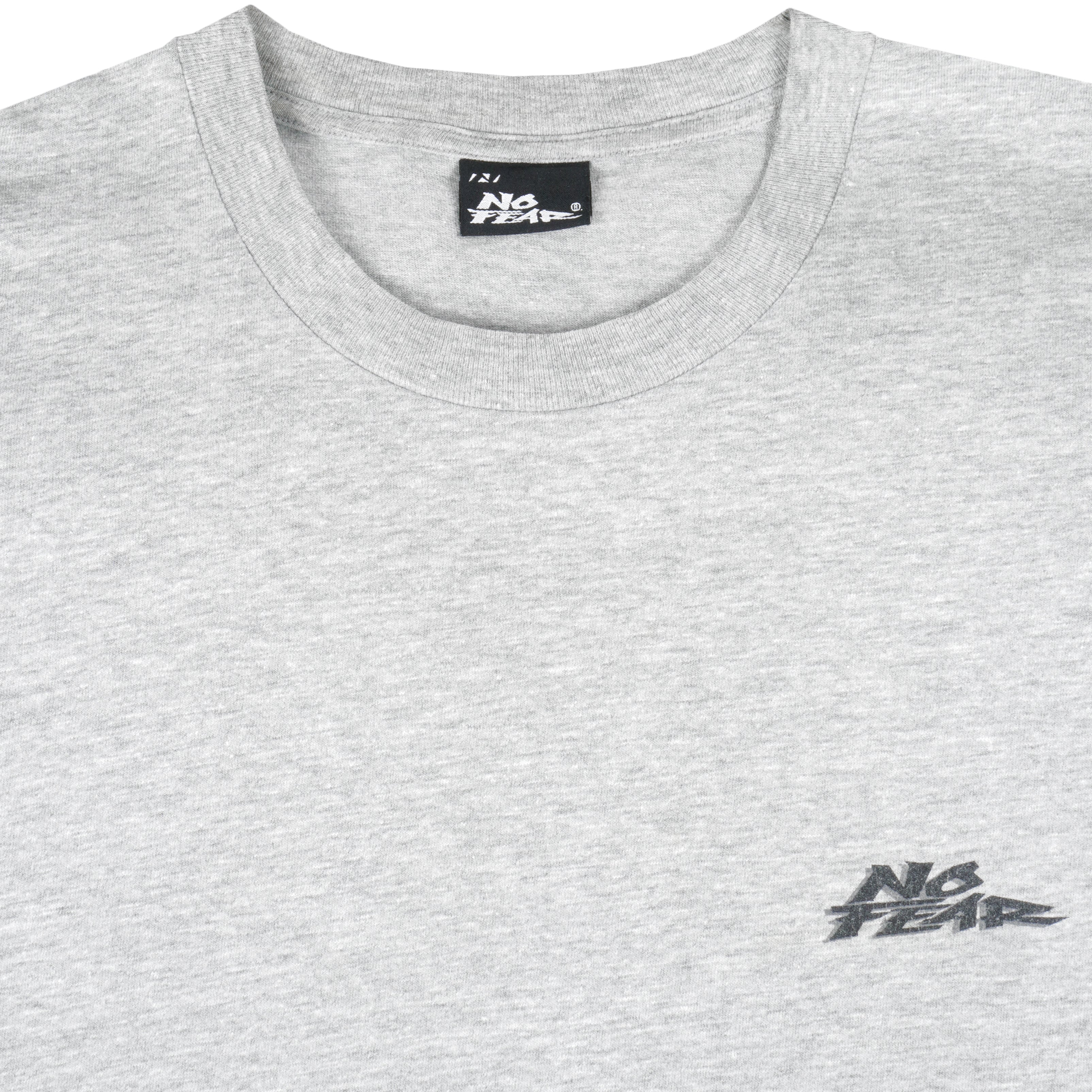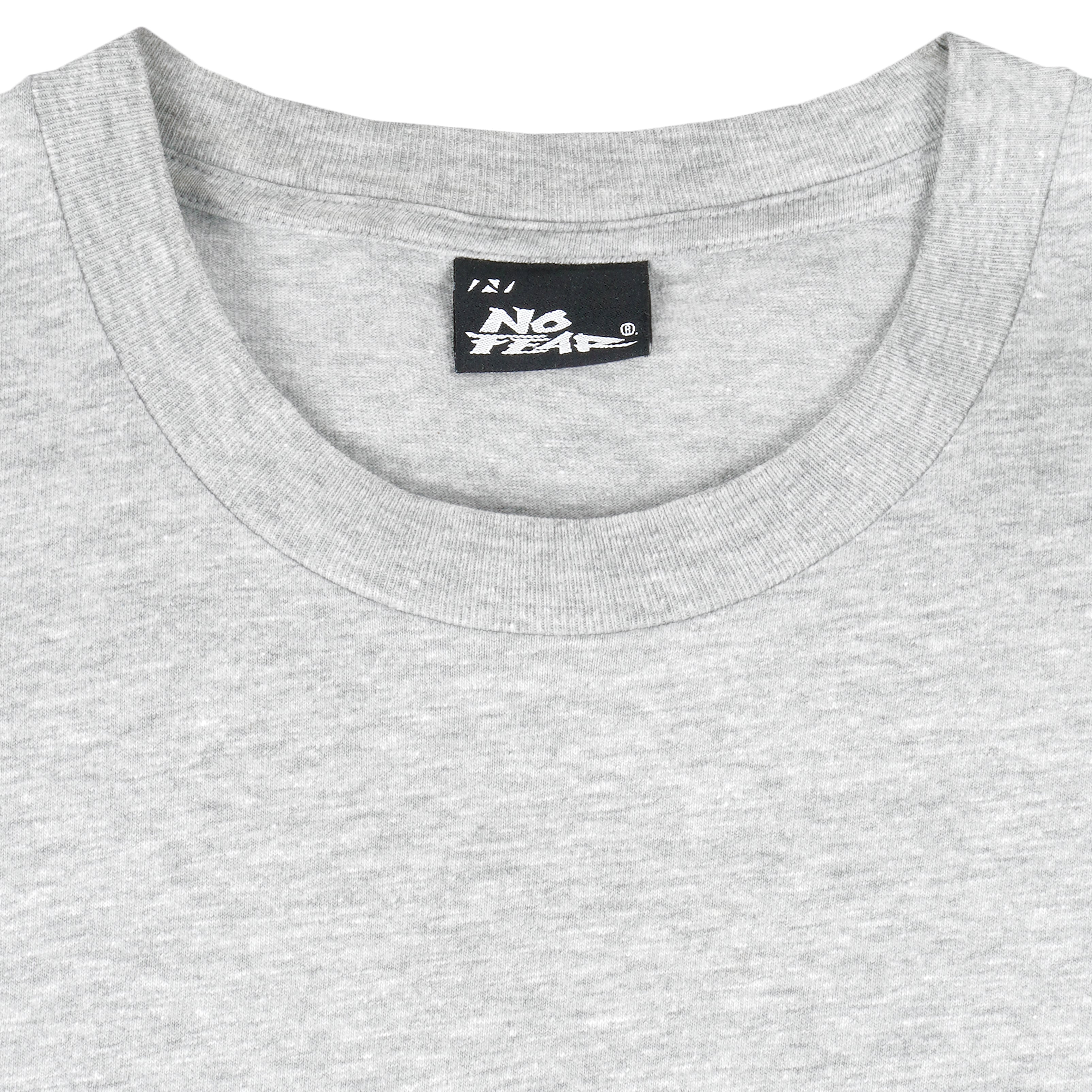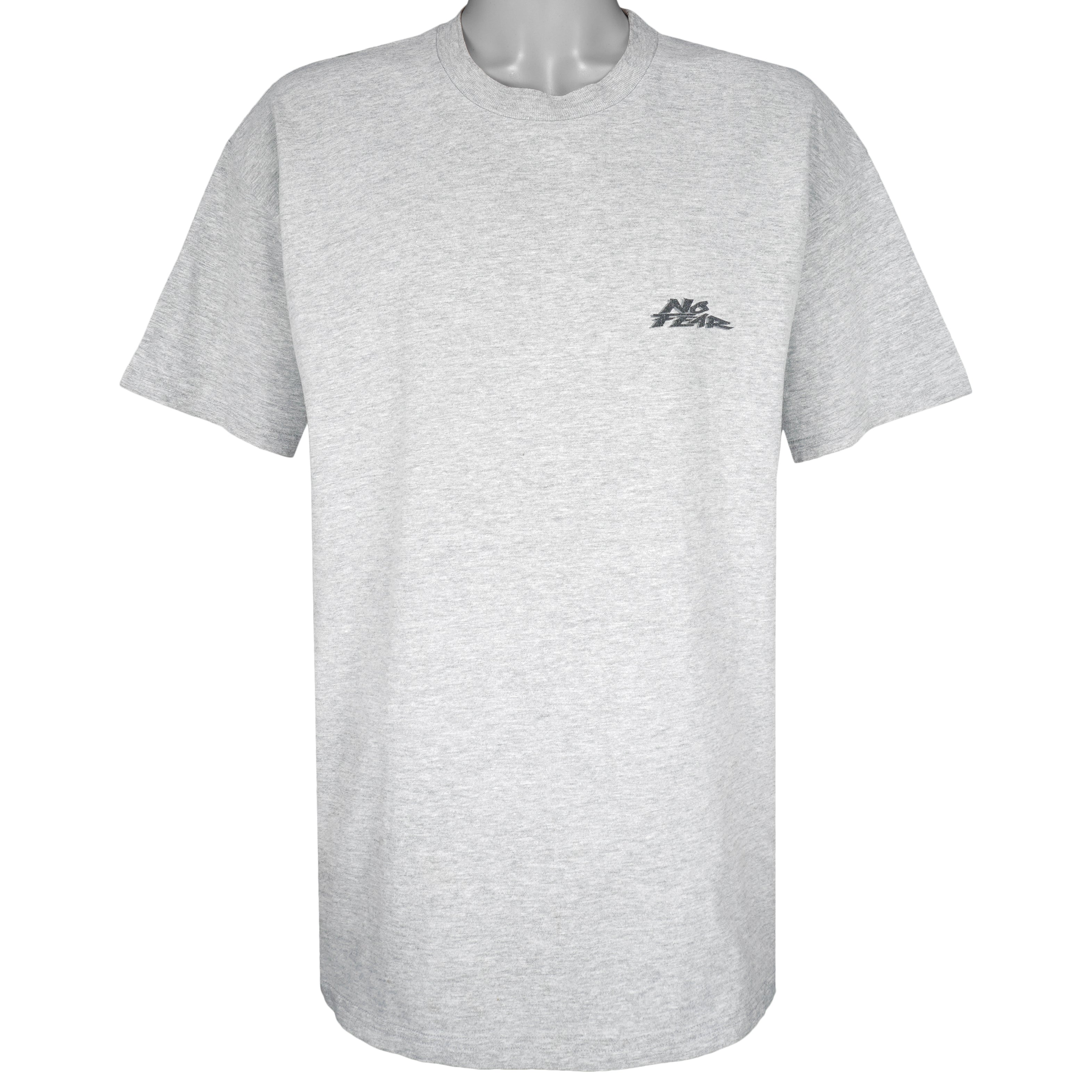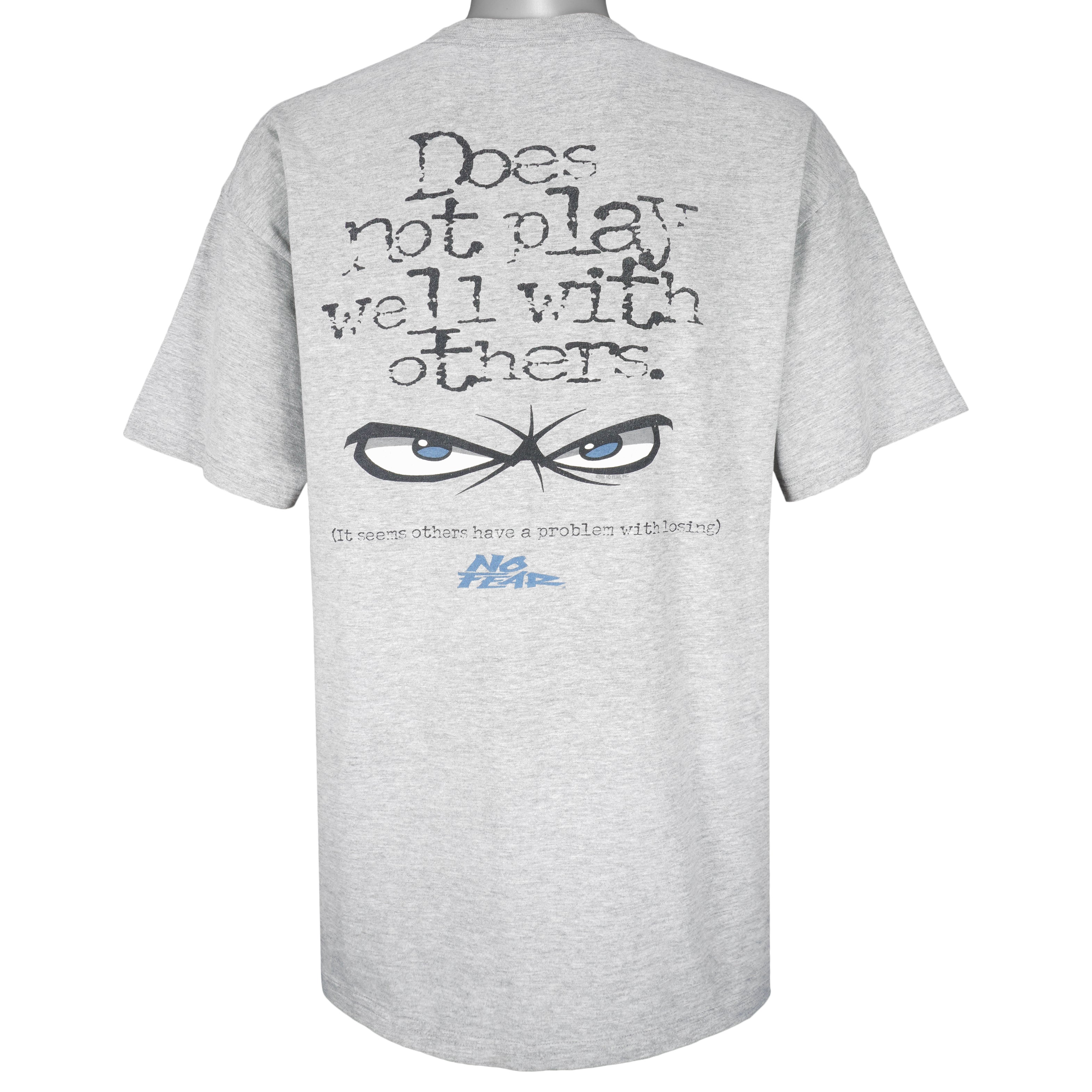 1990s Vintage No Fear Does Not Play Well With Others T-Shirt. Grey in color with big spell-out, fits X-large size and is in excellent condition.