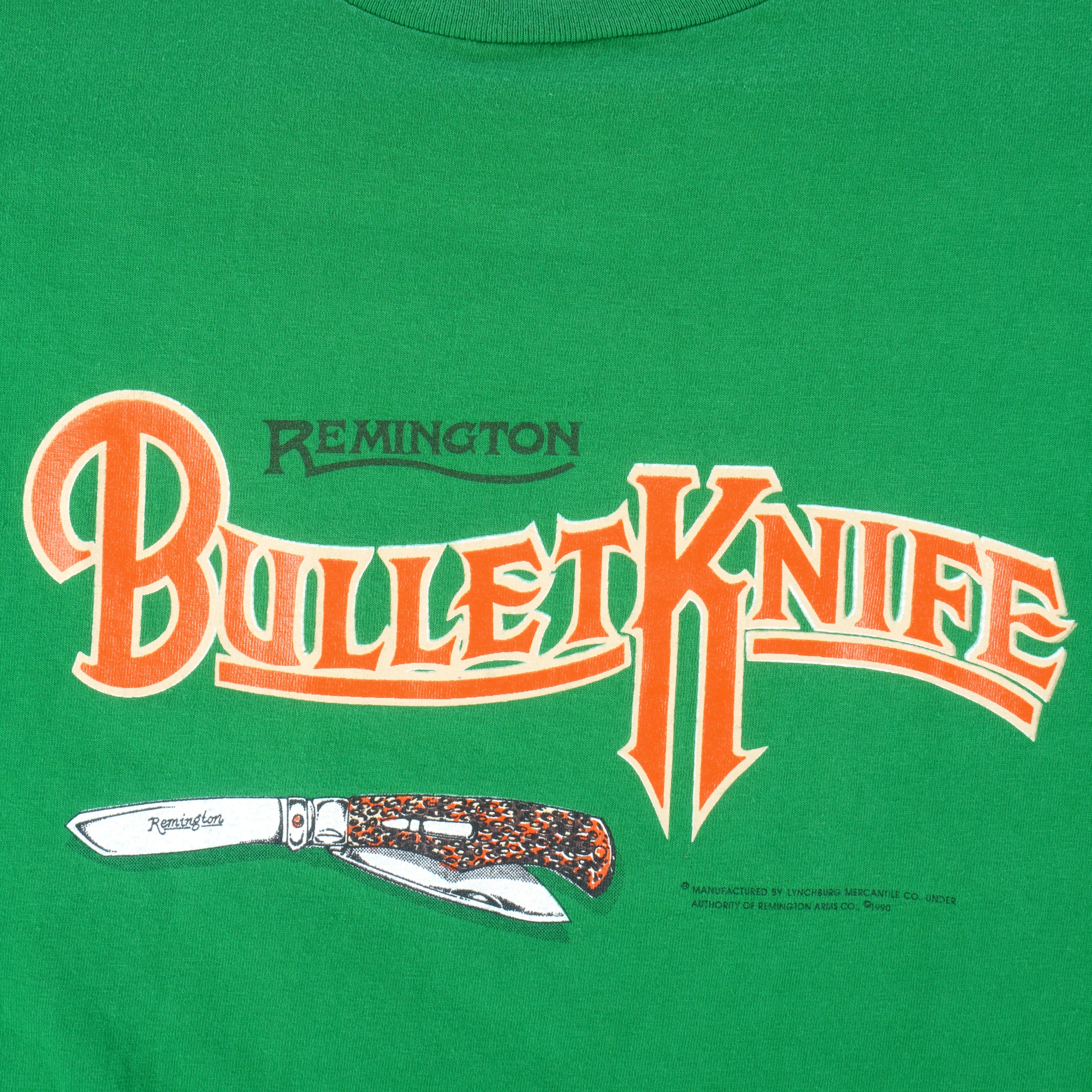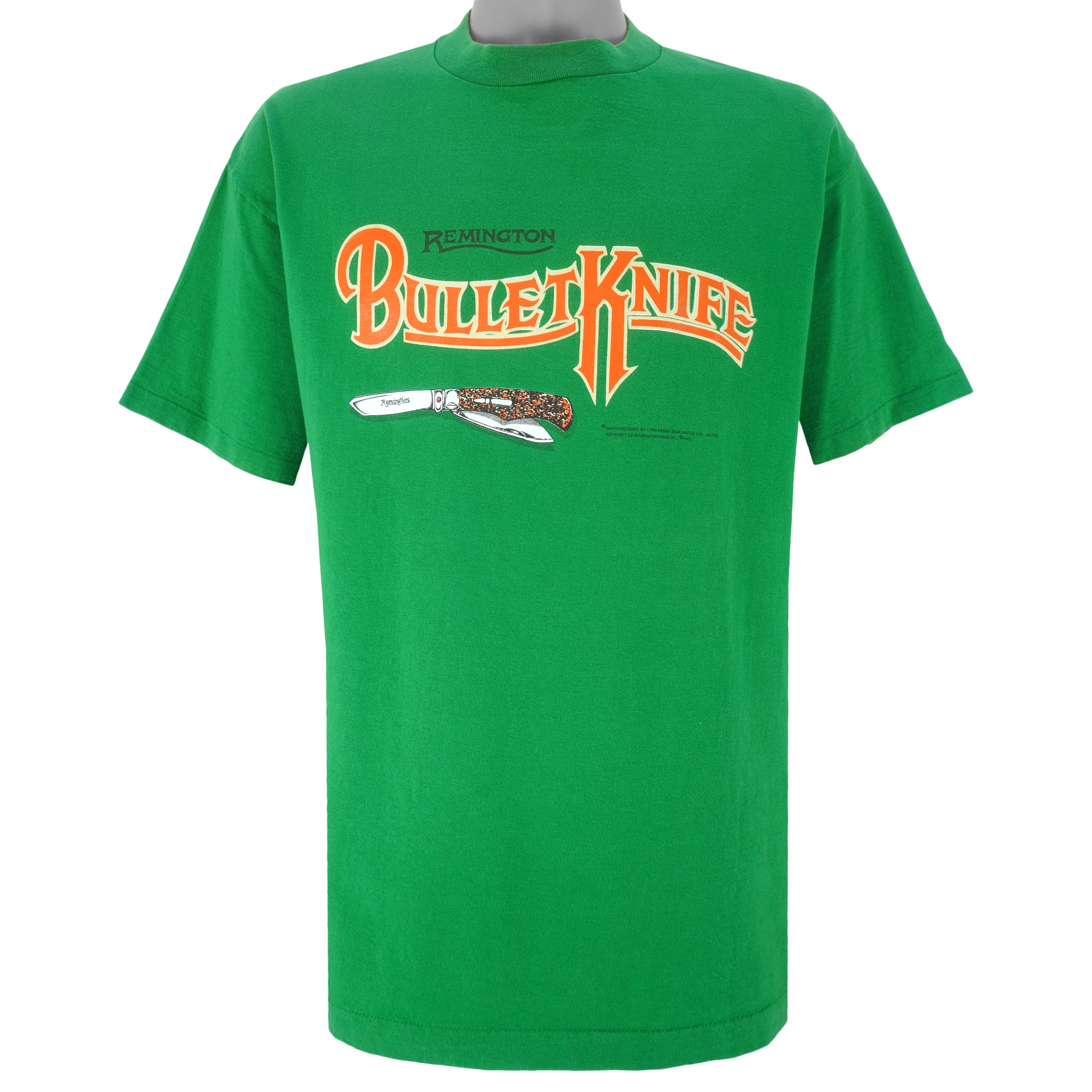 1990 Vintage Remington Bullet Knife Single Stitch T-Shirt by Sof Tee. Green in color, fitting X-large size and is in excellent condition.
