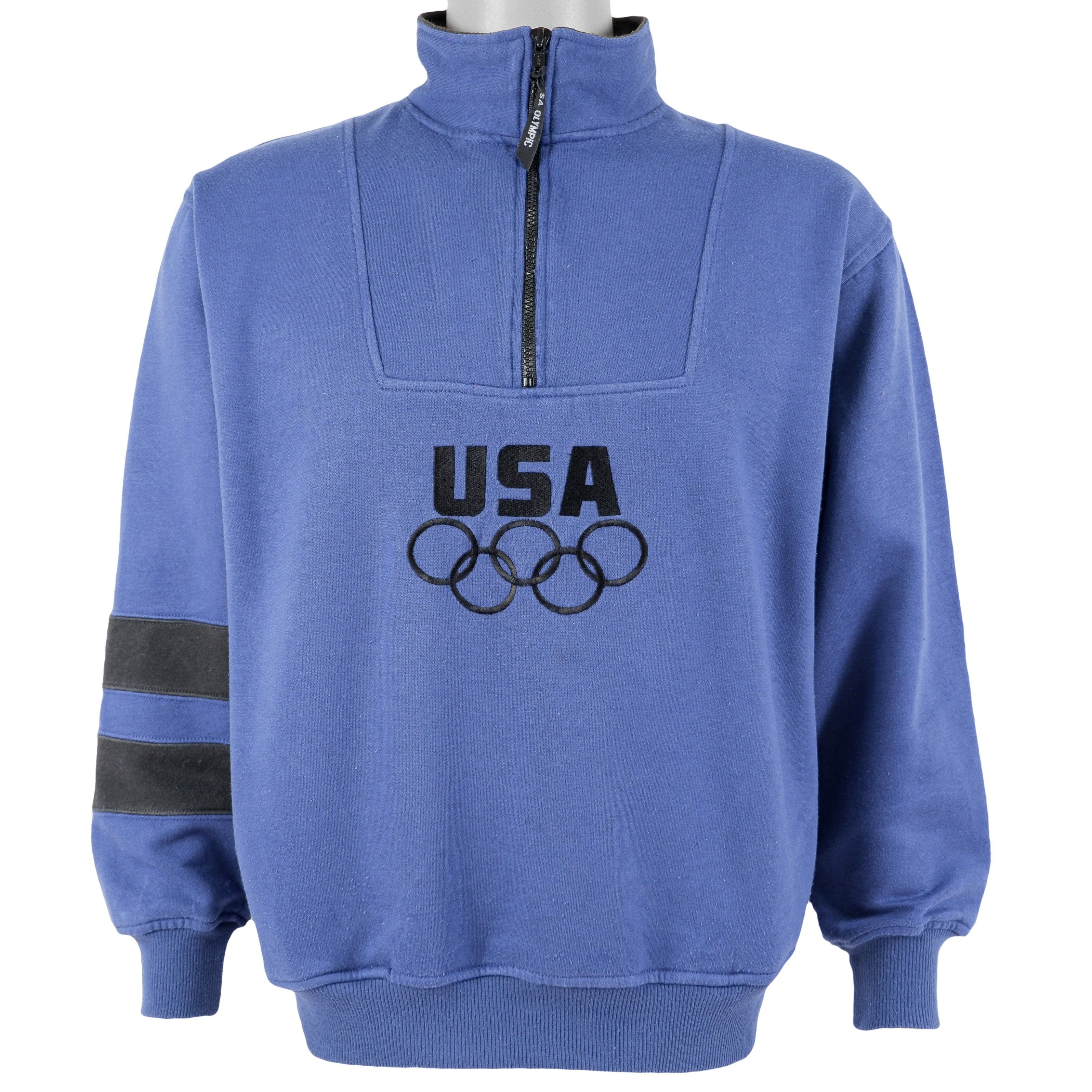 1990s Vintage Team USA Olympic Spell-Out 1/4 Zip Sweatshirt. Blue in color, fits medium size and is in excellent condition.