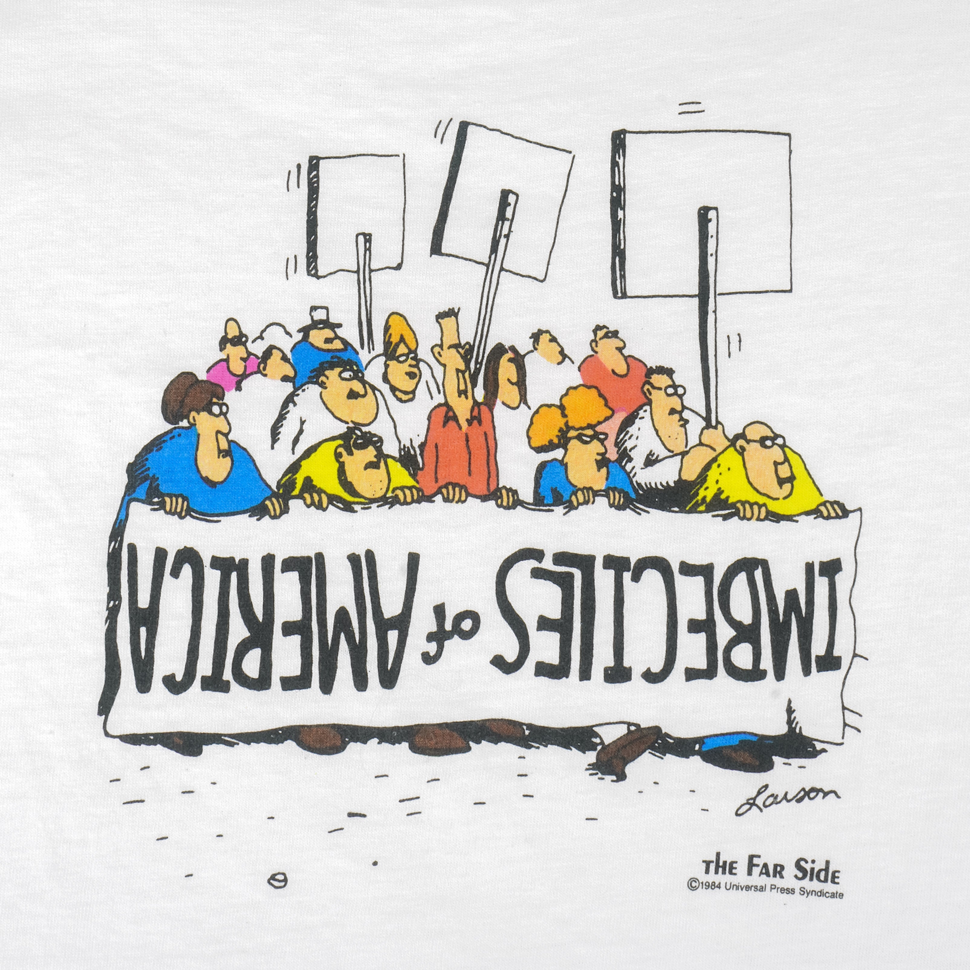 1984 Vintage The Far Side-Imbeciles Of America Funny Sarcastic Quoted T-Shirt. White​ in color, fitting large size and is in excellent condition.