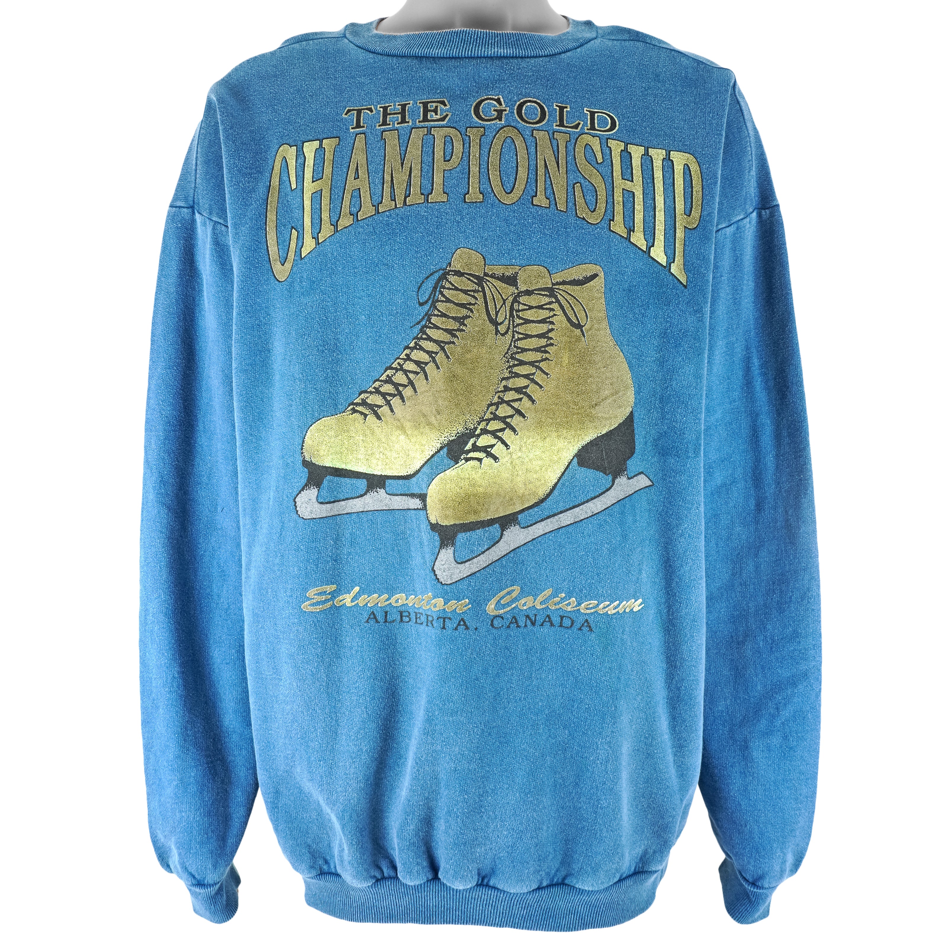 1990s Vintage The Gold Championship Skate Edmonton, Alberta Crew Neck Sweatshirt by Waves. Blue in color and fits like X-large size and is in excellent condition.