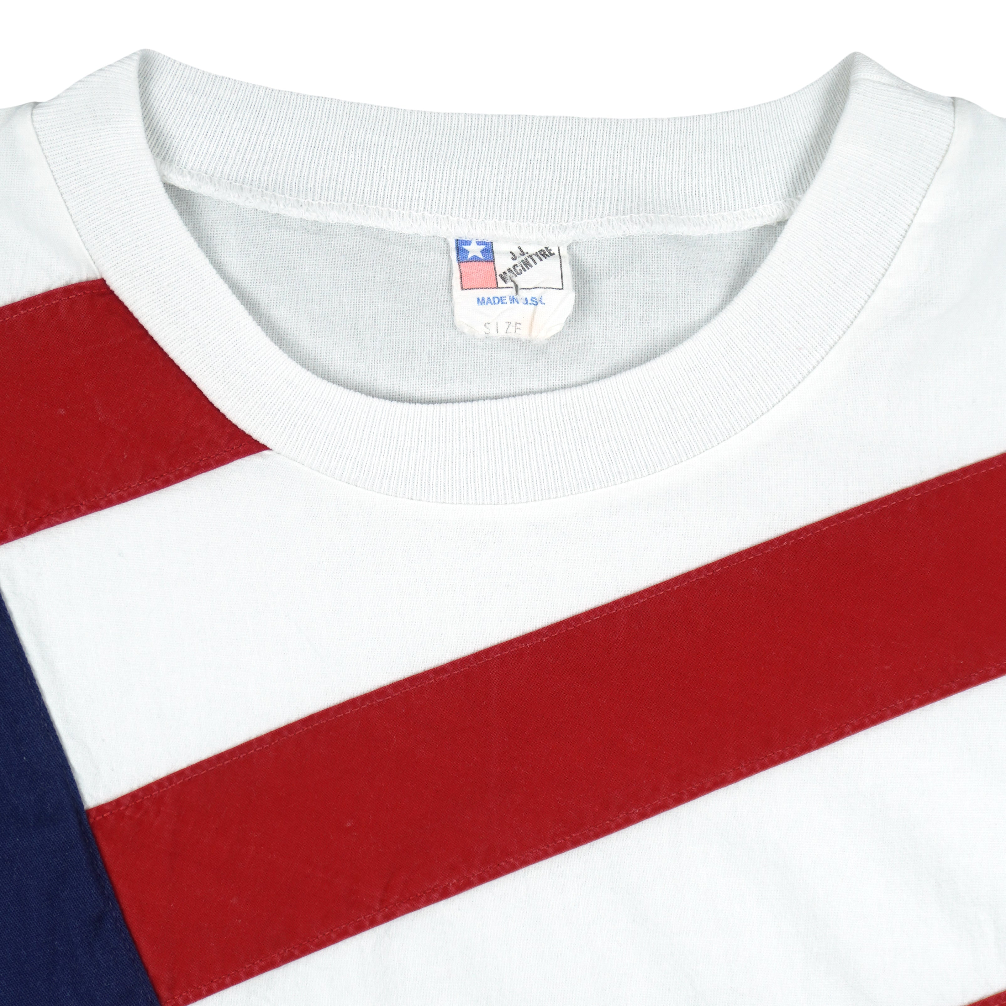 1992 Vintage NBC Barcelona Olympic Games USA Team Crew Neck Sweatshirt. White in color with bold diagonal red and navy applique that mimics the American flag, fits a large size with signs of wear - minor marks and is otherwise in very good condition.