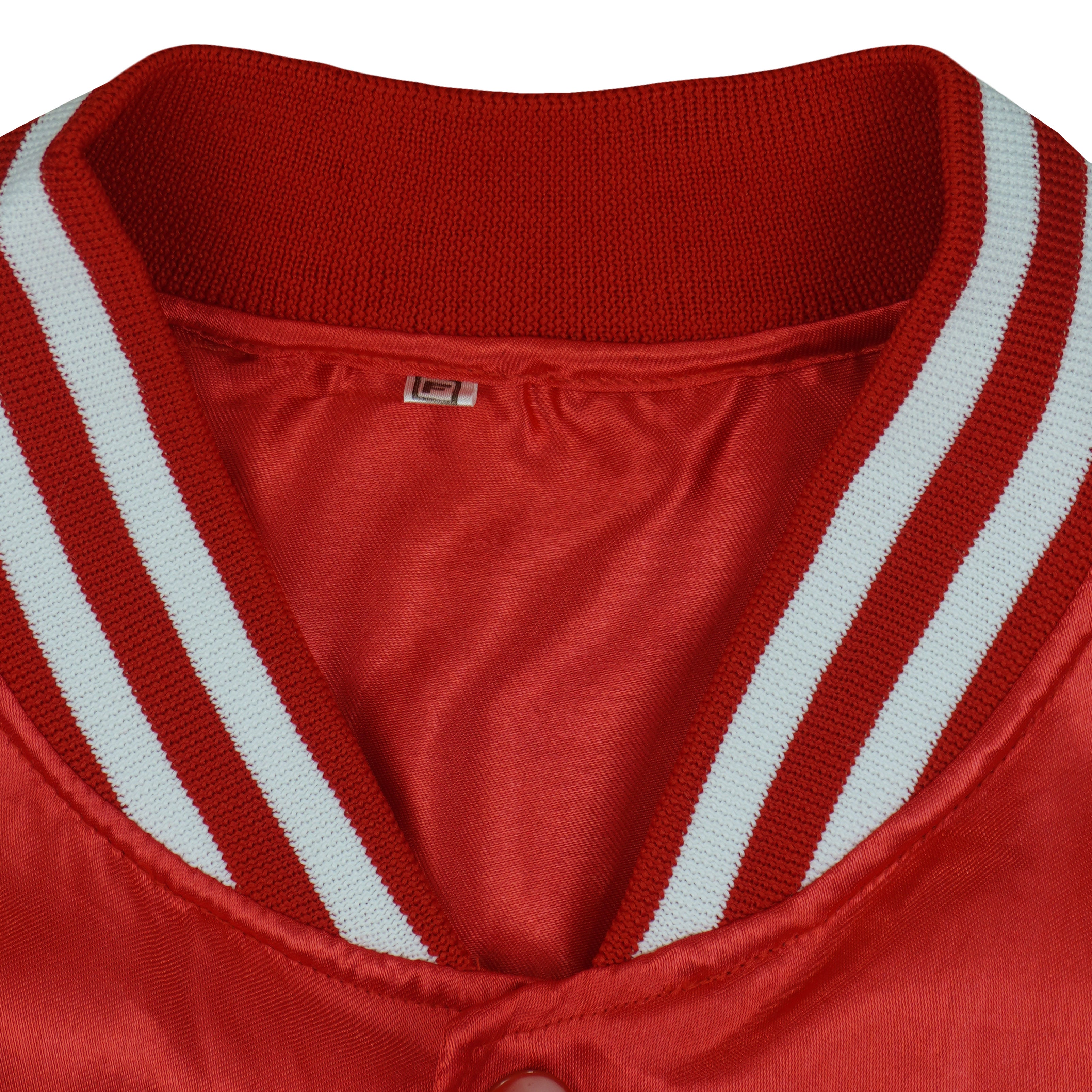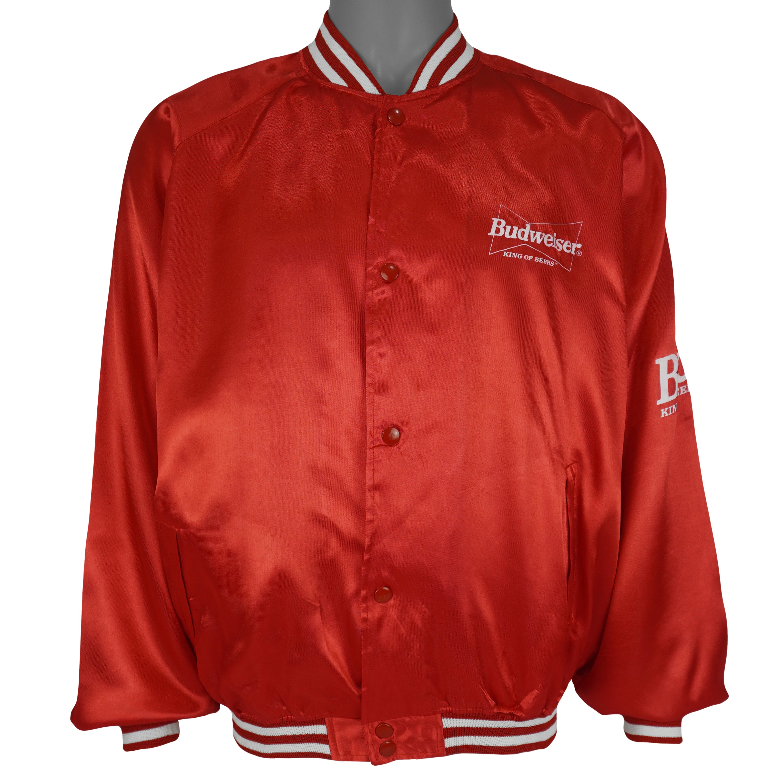 1980s Vintage Budweiser King Of Beers Spell-Out Button-Up Satin Jacket. Red in color, fitting a medium size with signs of wear, fainted on logo and is otherwise in very good condition.