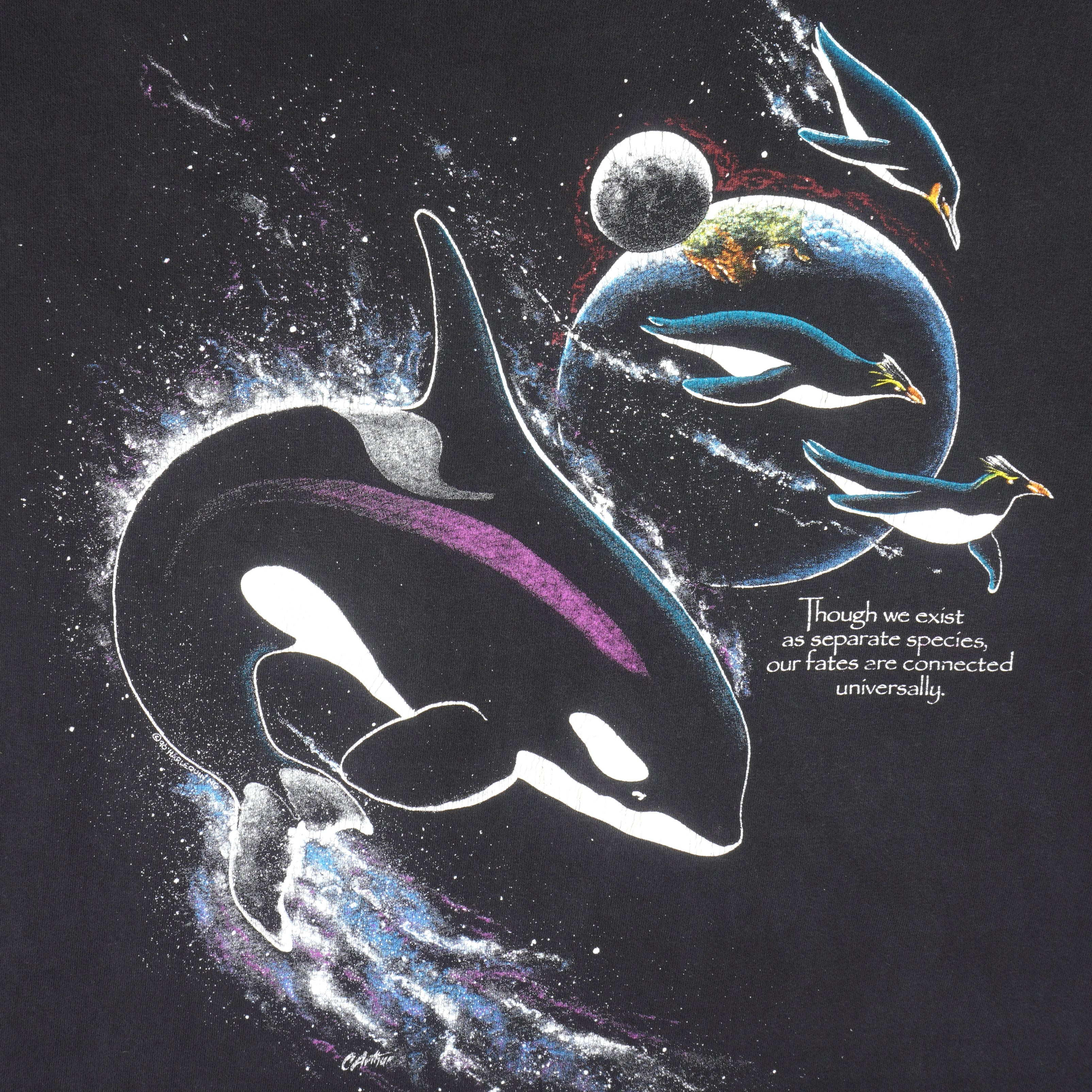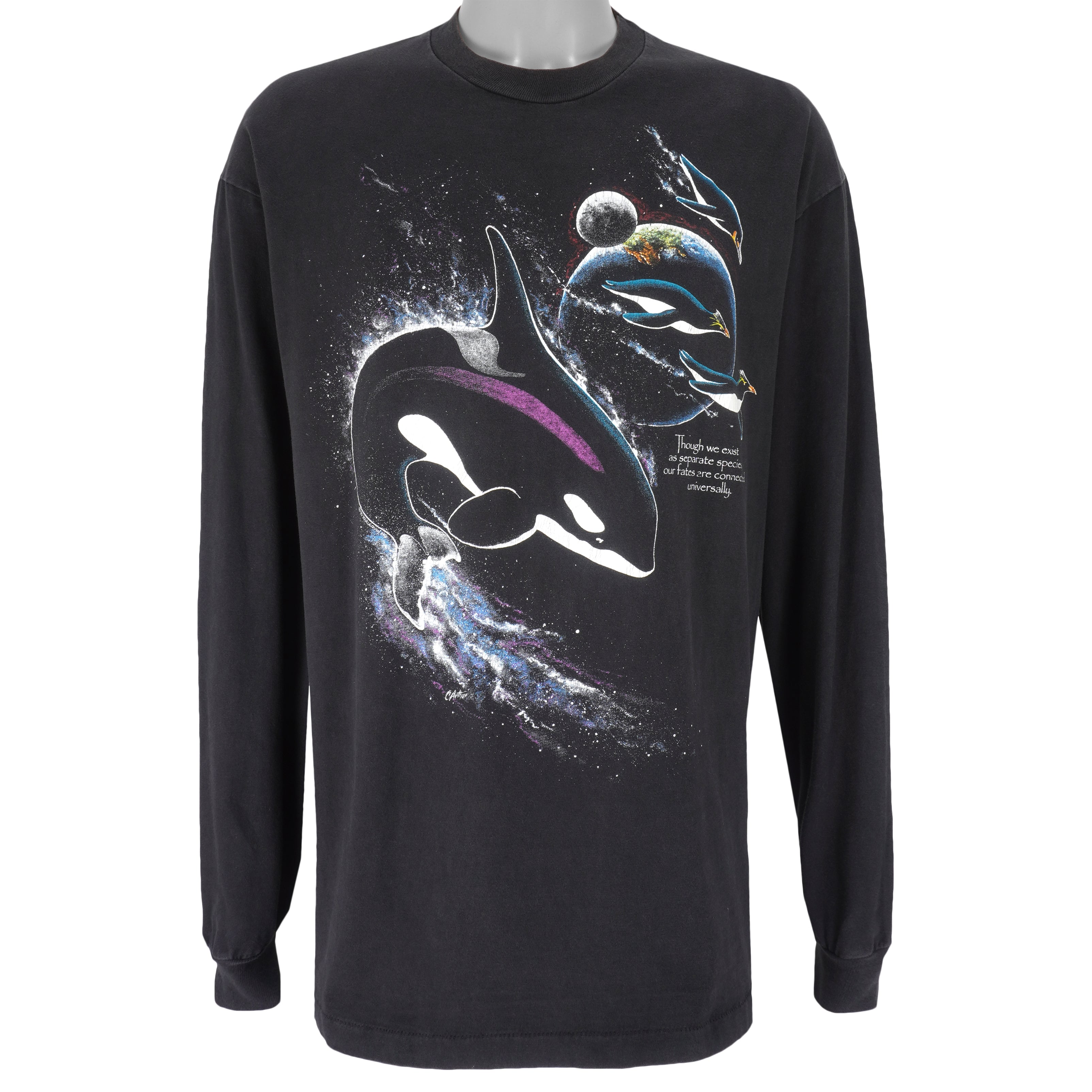 1990s Vintage Though We Exist as Separate Species, Our Fates Are Connected Universally Galaxy Oceanic Killer Whale Long Sleeved Shirt by Hanes. Black in color, fits X-large size and is in excellent condition.