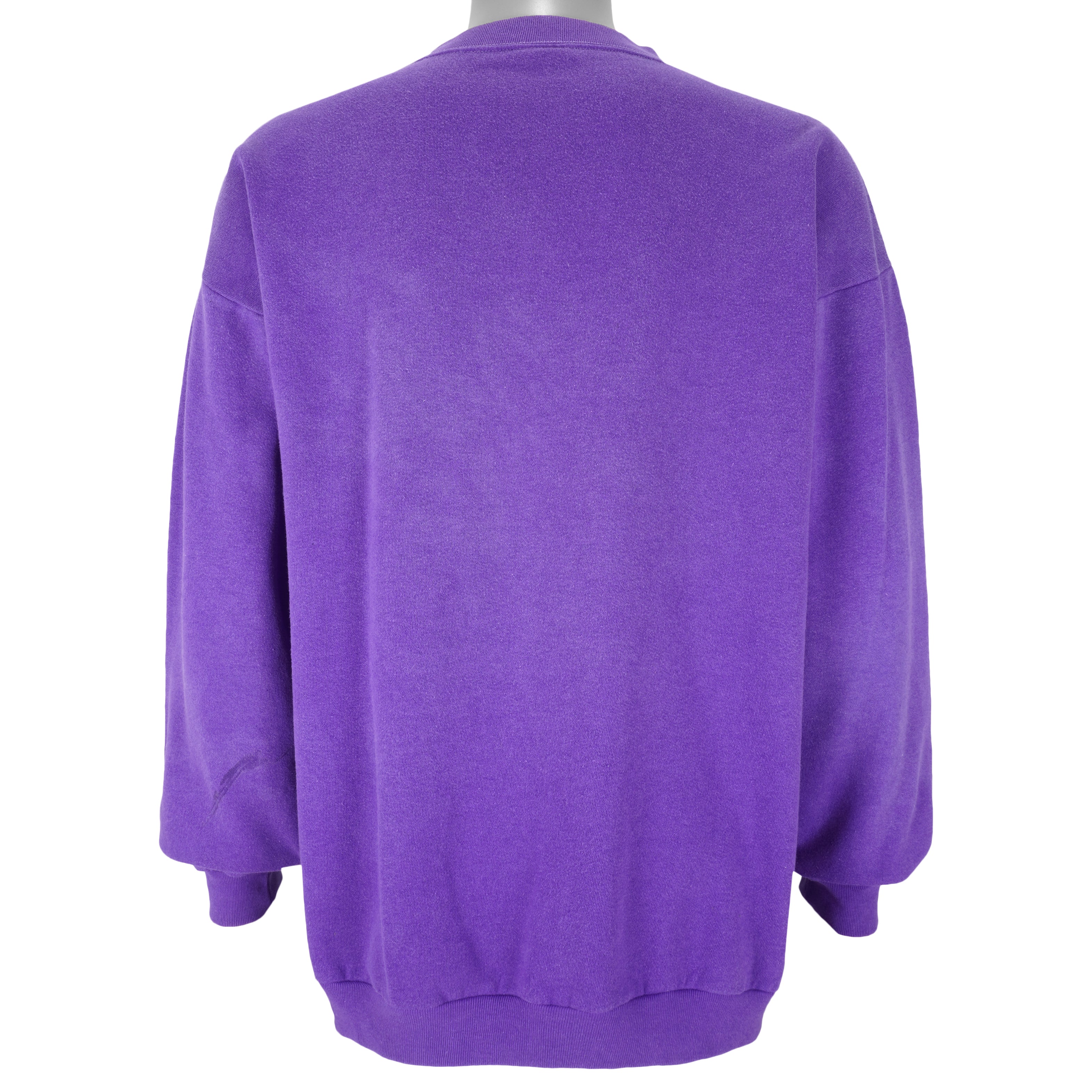 1990s Vintage Whitetail Buck Animal Print Crew Neck Sweatshirt by SUN. Purple in color with spell-out, fits an X-large size with marks on left sleeve and is in excellent condition.
