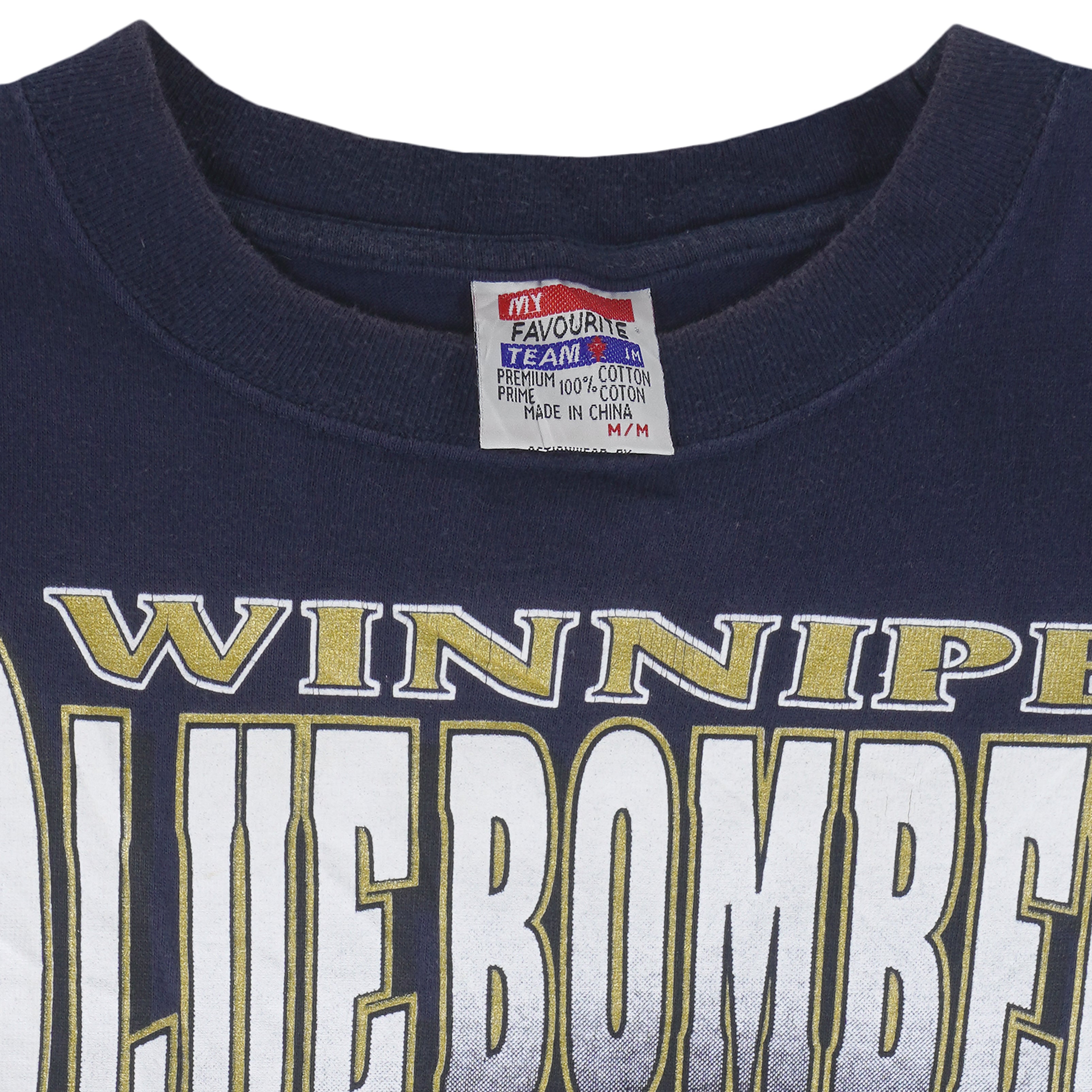1990s vintage CFL Winnipeg Blue Bombers Helmet T-Shirt by My Favourite Team. Navy blue in color, big spell-out and helmet graphic, tag is medium but fits like large in size and is in excellent condition.
