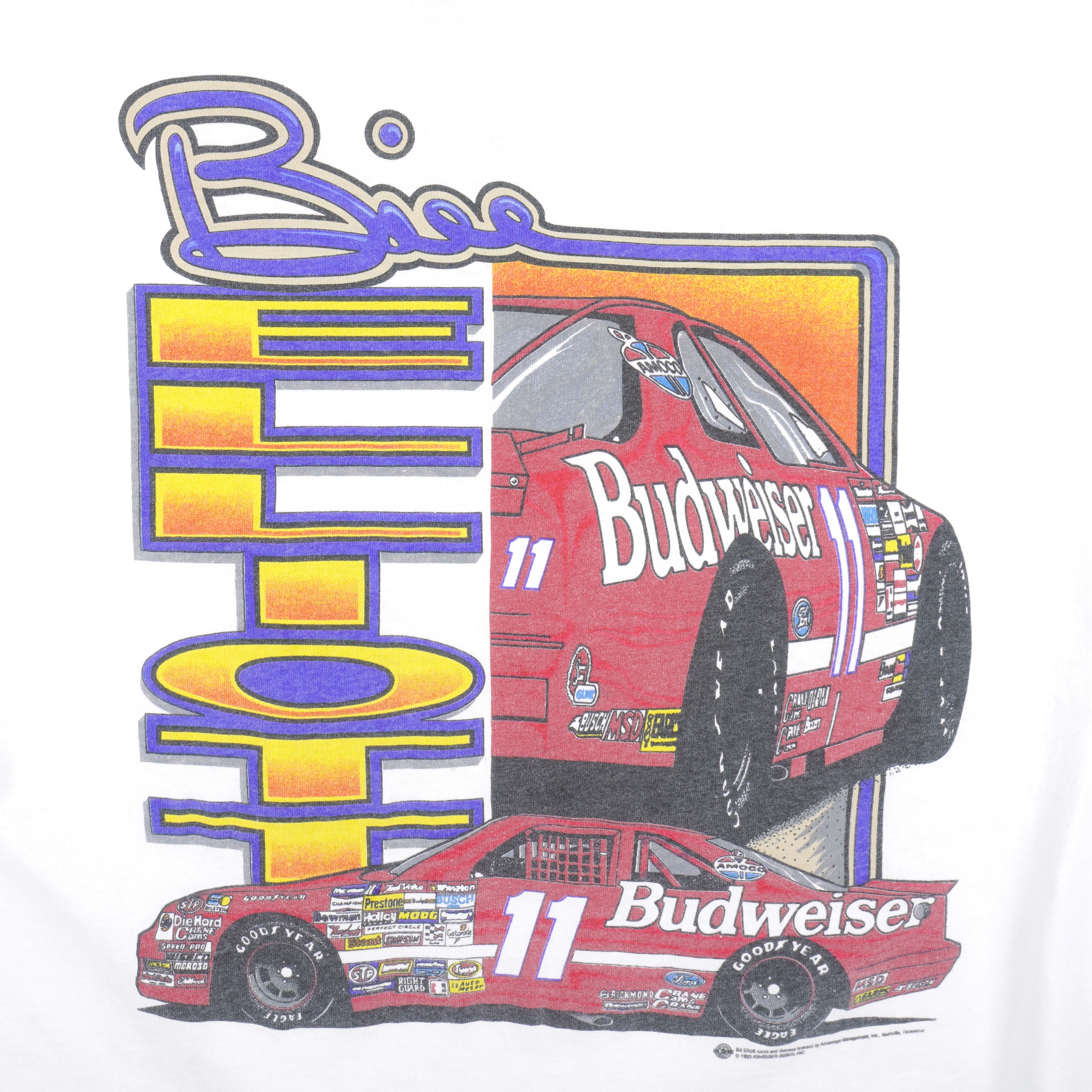 1990s Vintage NASCAR Bill Elliott No.11 Budweiser Single Stitch T-Shirt by Motorsport Tradition. White in color with big spell-out, fitting X-large size and is in excellent condition.