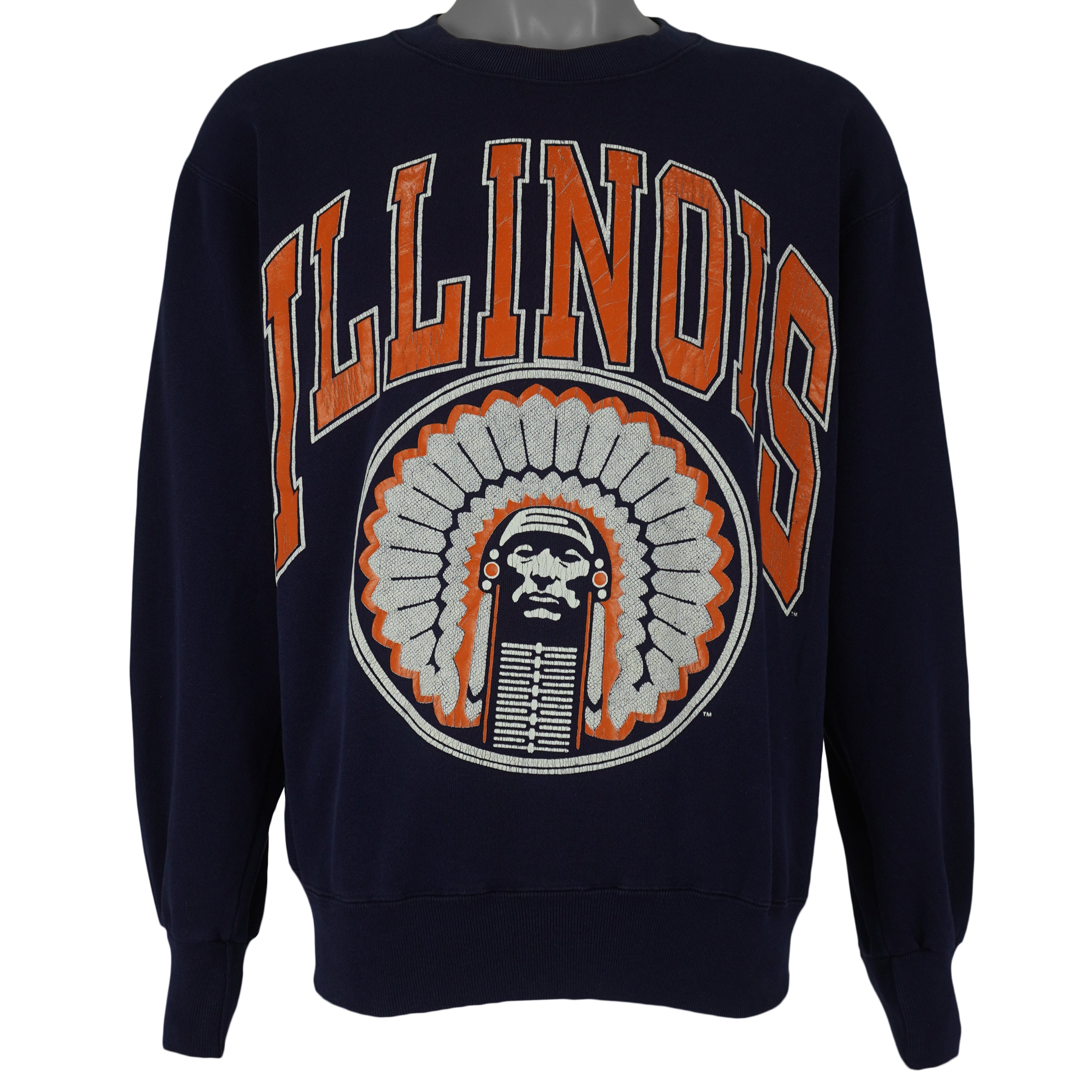 1990s Vintage NCAA Illinois Crew Neck Sweatshirt by Nutmeg. Blue with orange in color, big logo and spell-out, fits a medium size with signs of wear and is otherwise in very good  condition.
