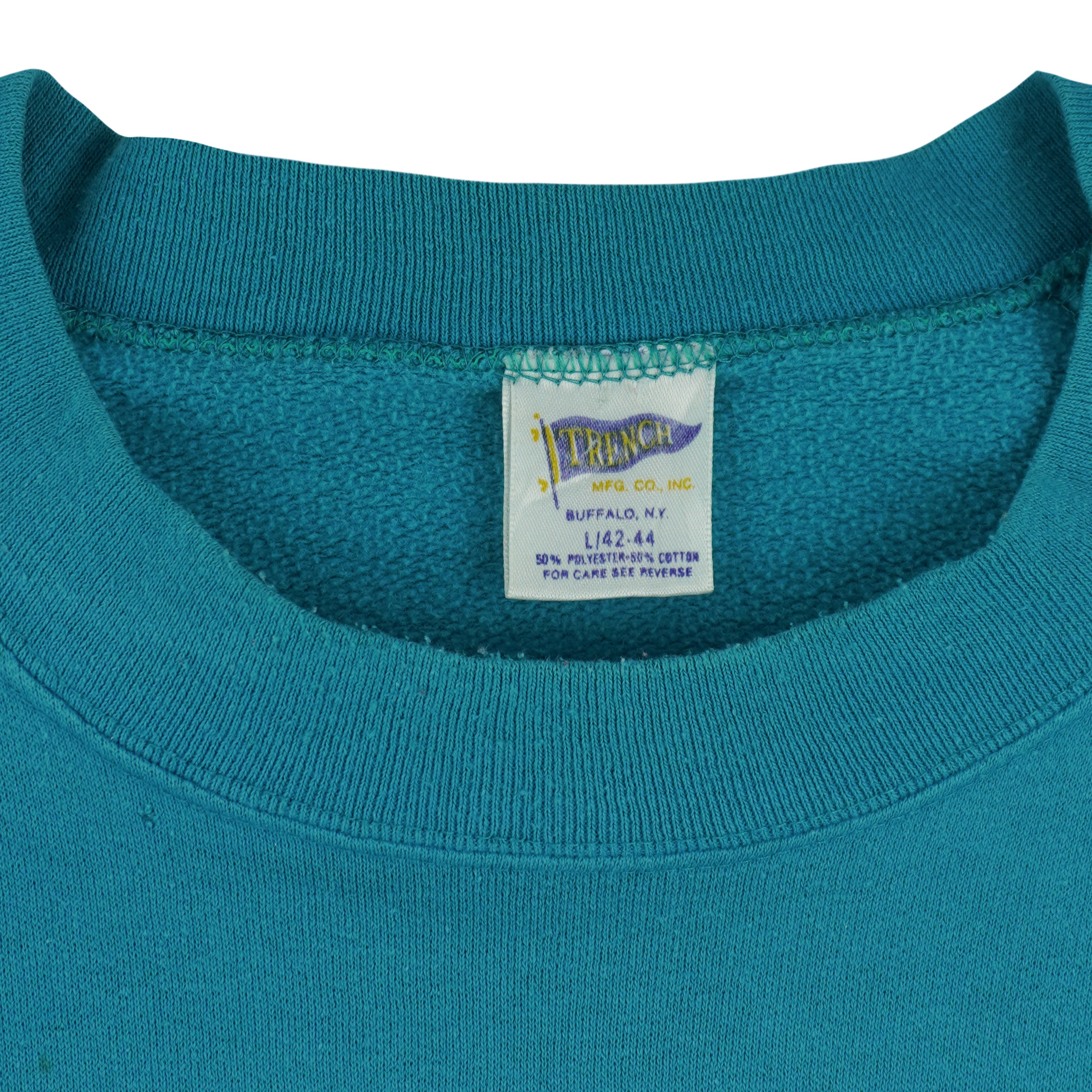 1990s Vintage NBA Charlotte Hornets Big Logo Crew Neck Sweatshirt by Trench. Blue in color, tag shows a large size, shows signs of wear, minor marks and a small hole near collar and is otherwise in very good condition.