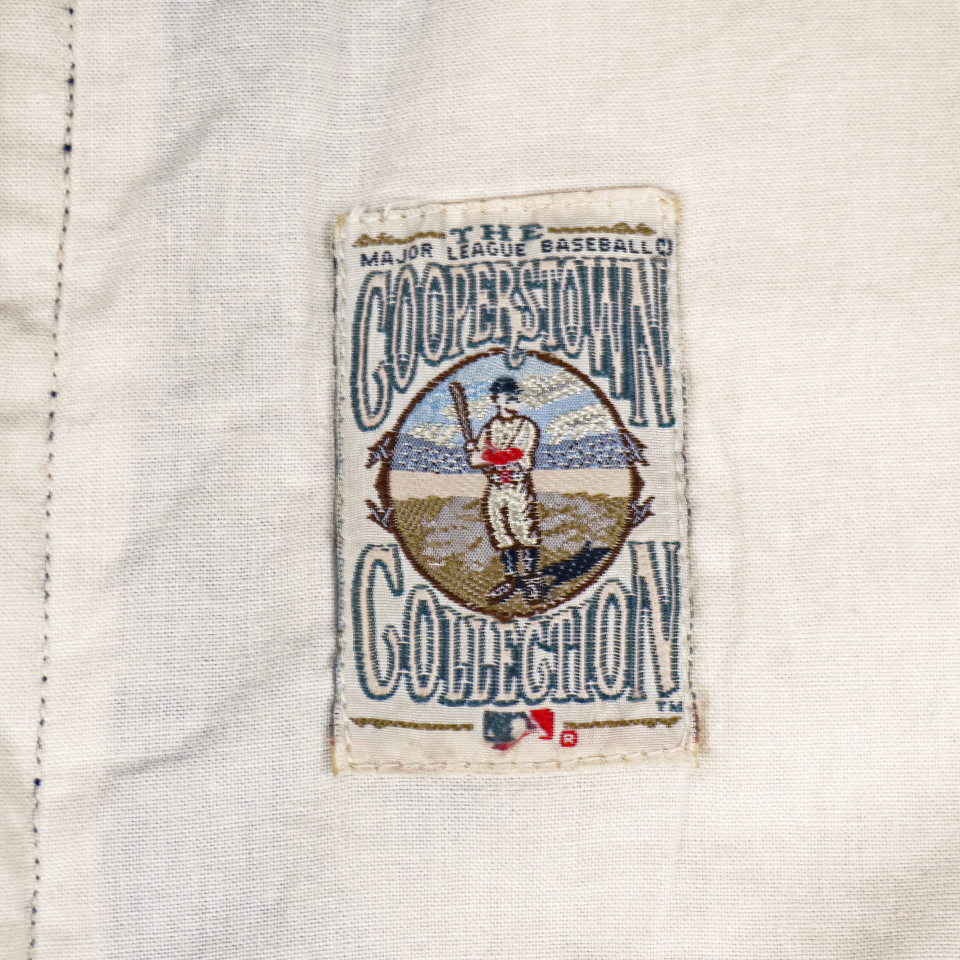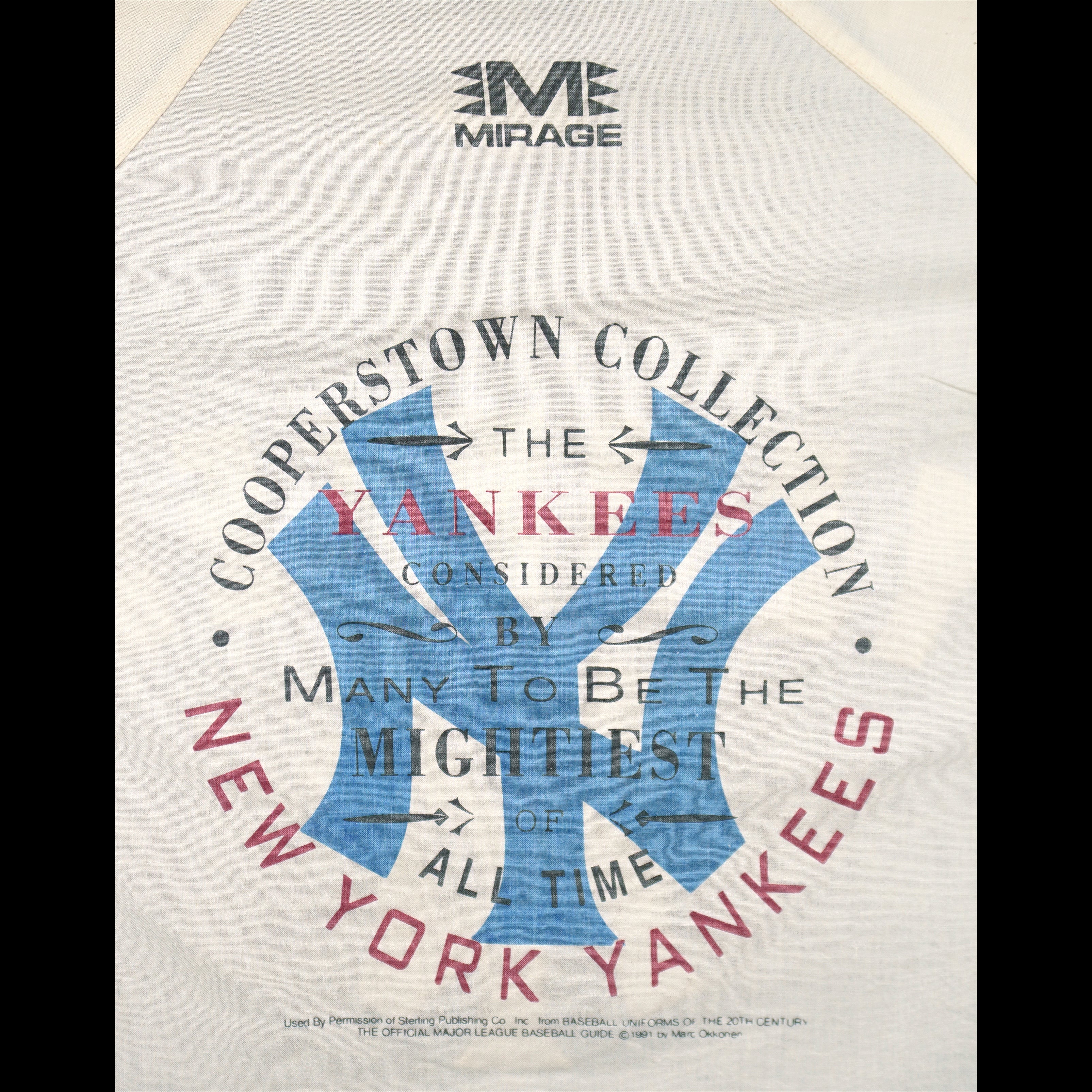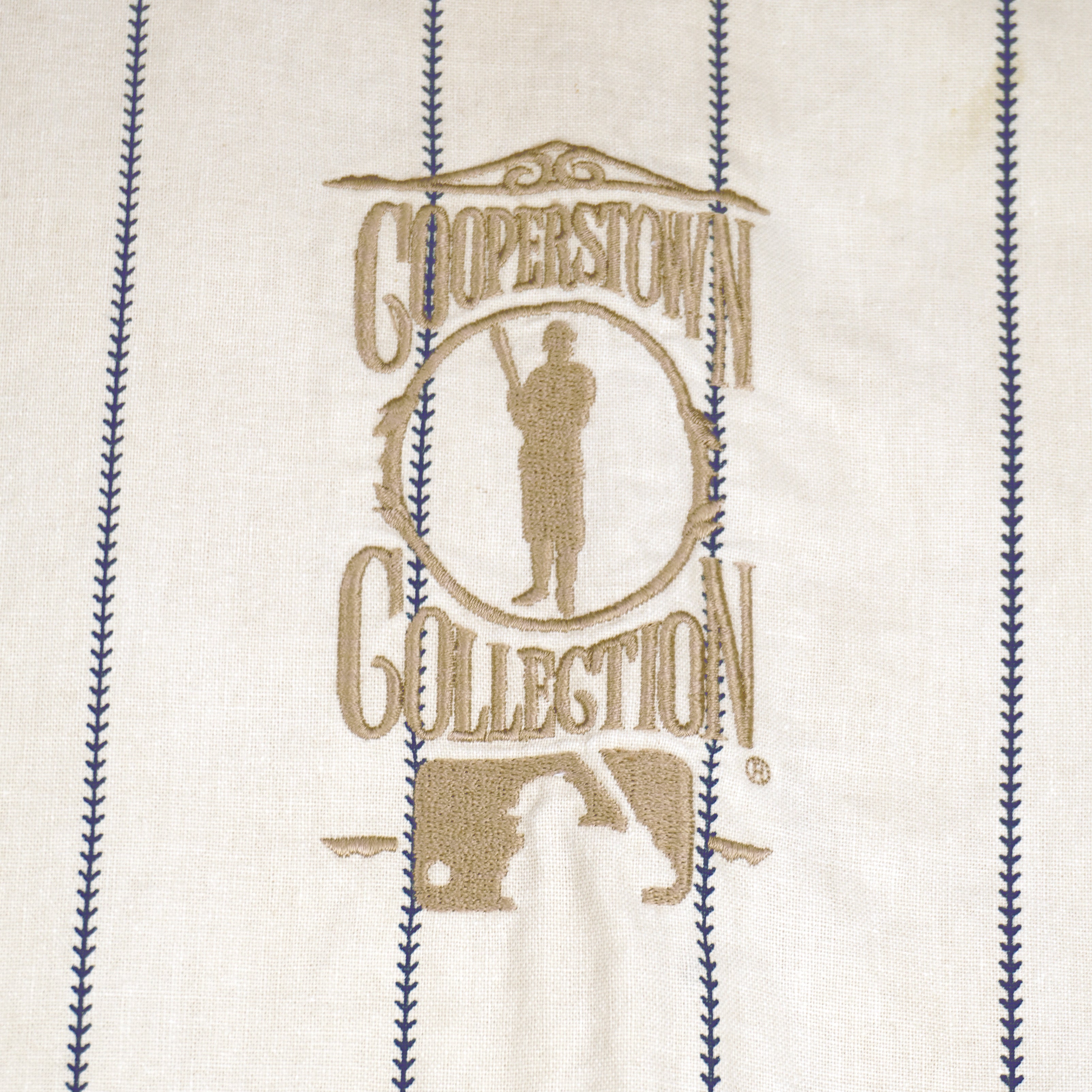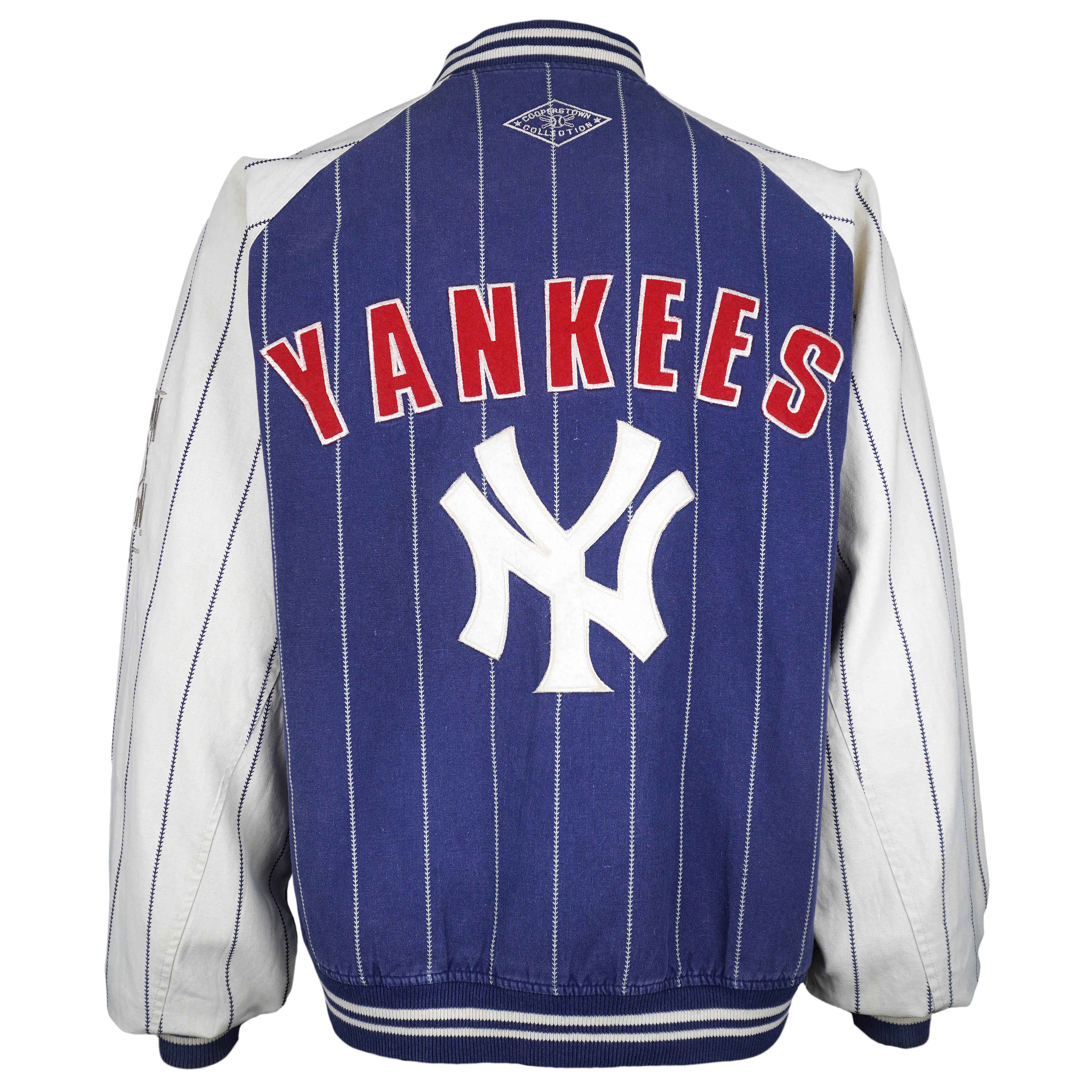 1990s Vintage MLB Cooperstown Collection New York Yankees Big Logo Zip-Up Pinstripe Reversible Jacket by Mirage. White & blue in color, tag shows medium but fits close to a large size with signs of wear, scuffing surface with minor marks as shown on photos and is otherwise in very good vintage condition.