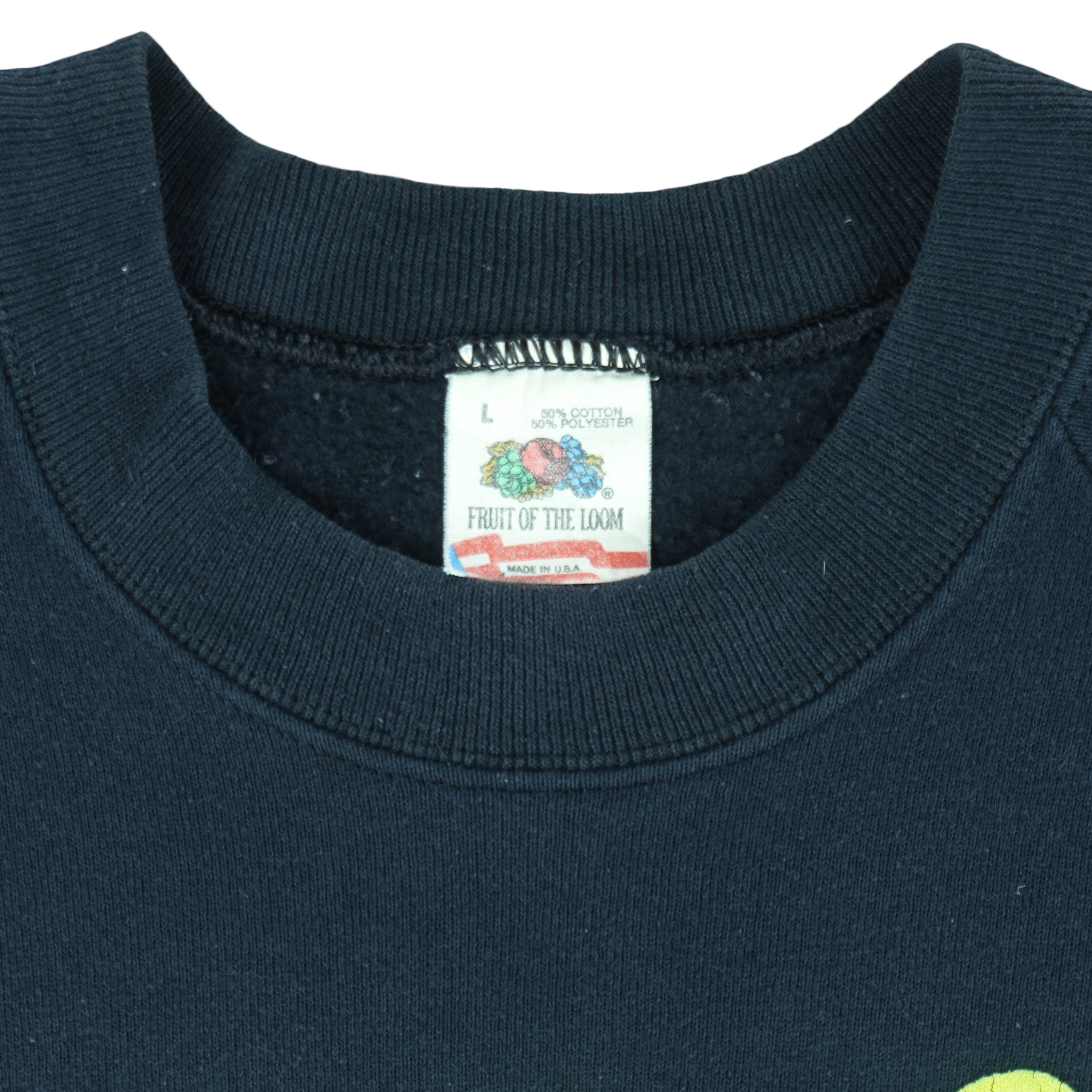 1990s Vintage Florida Flamingo Crew Neck Sweatshirt by Fruit of the loom. Black in color, tag shows large but fits like a medium size with signs of wear, discoloration mark and is otherwise in very good condition.