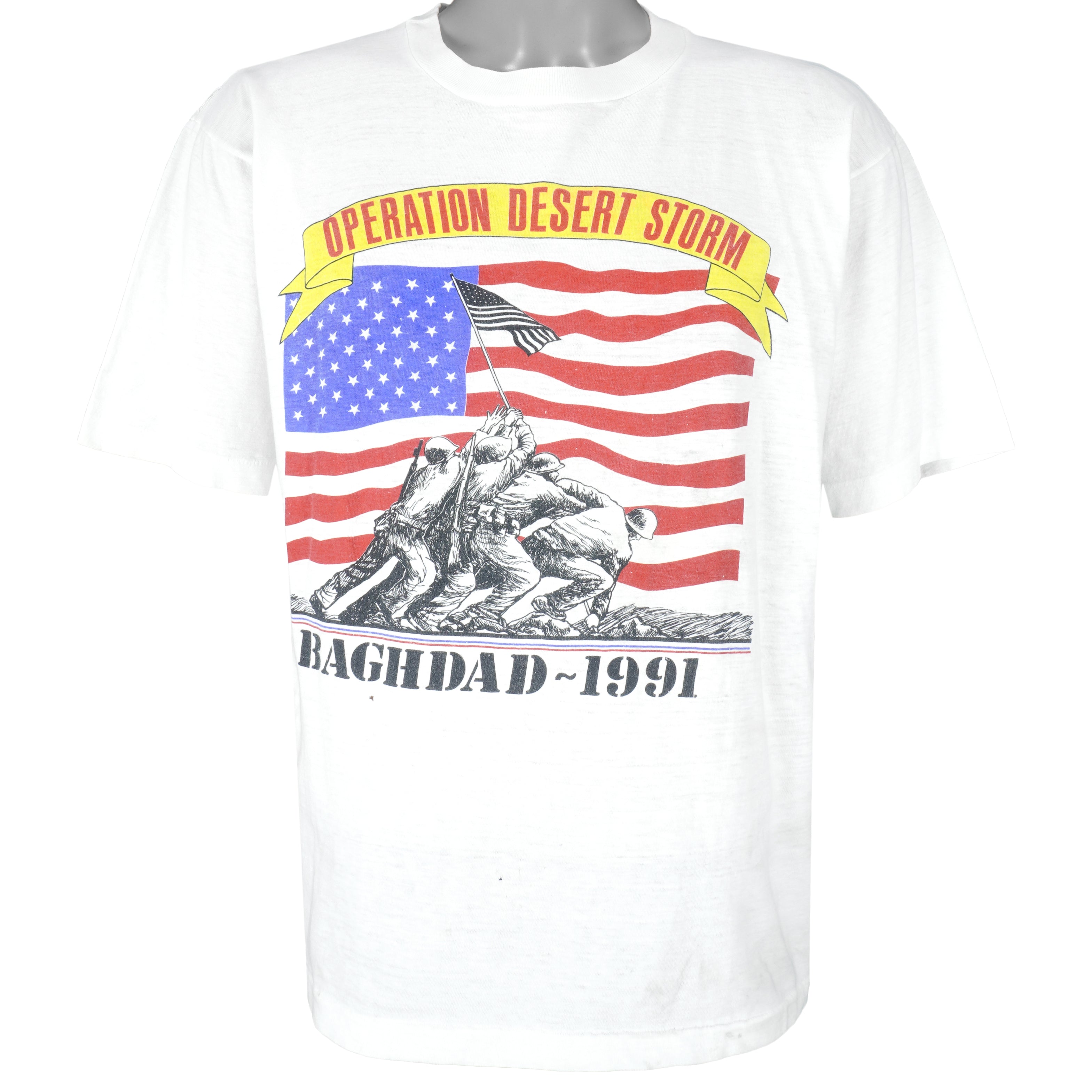 1991 Vintage Operation Desert Storm Baghdad Single Stitch T-Shirt by Proace. White in color, tag shows X-large but fits like a large size with signs of wear and is otherwise in very godo condition.