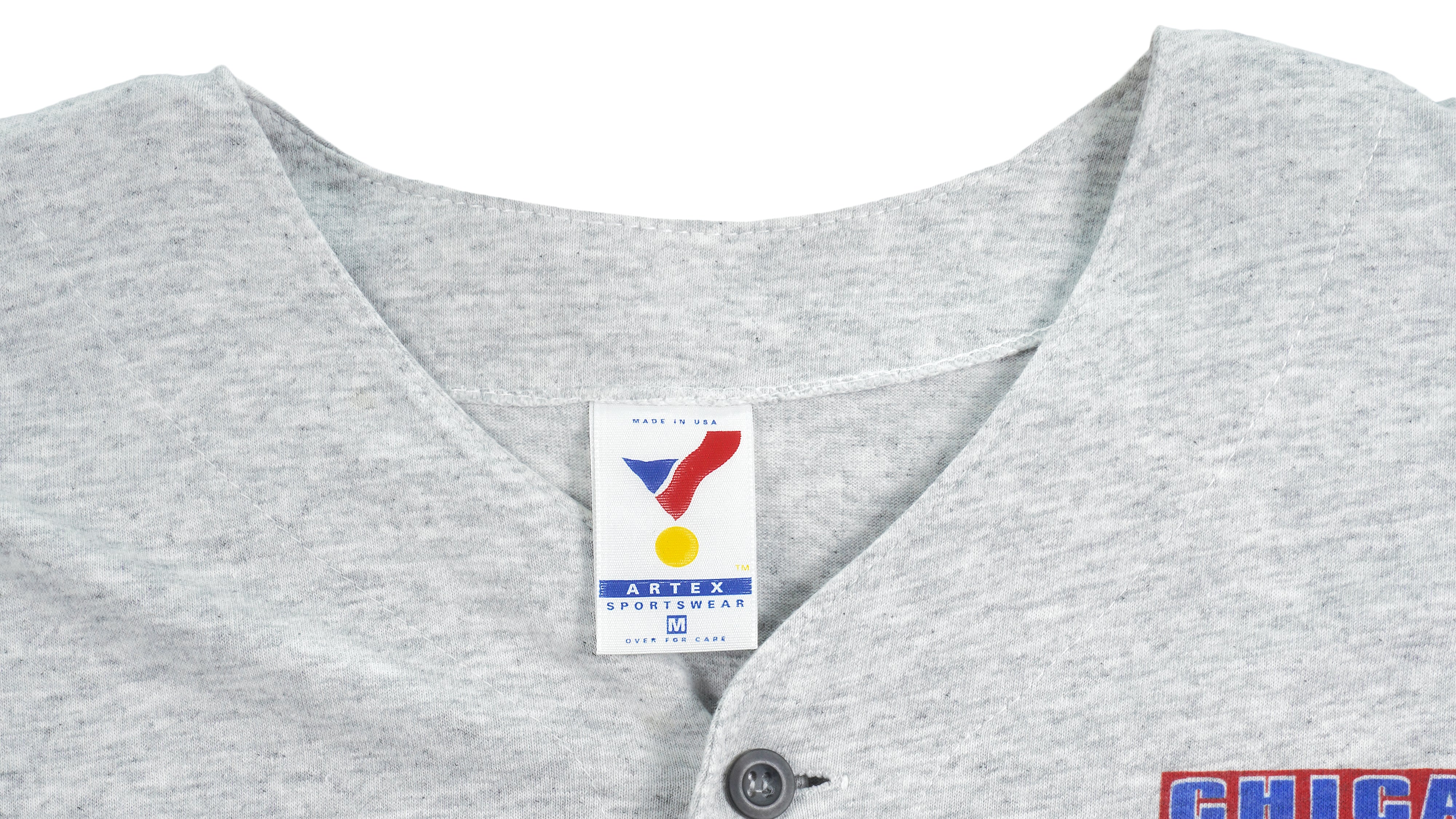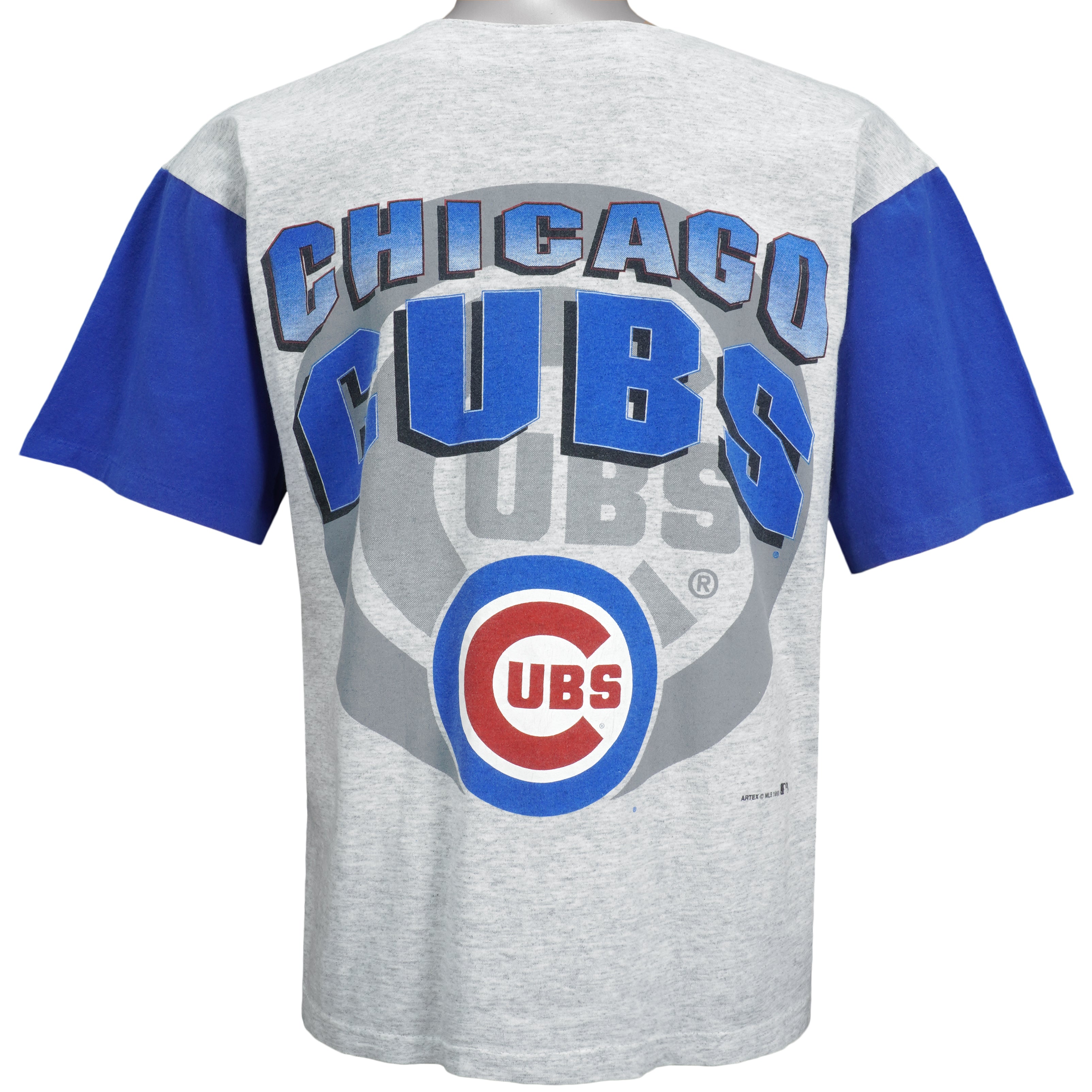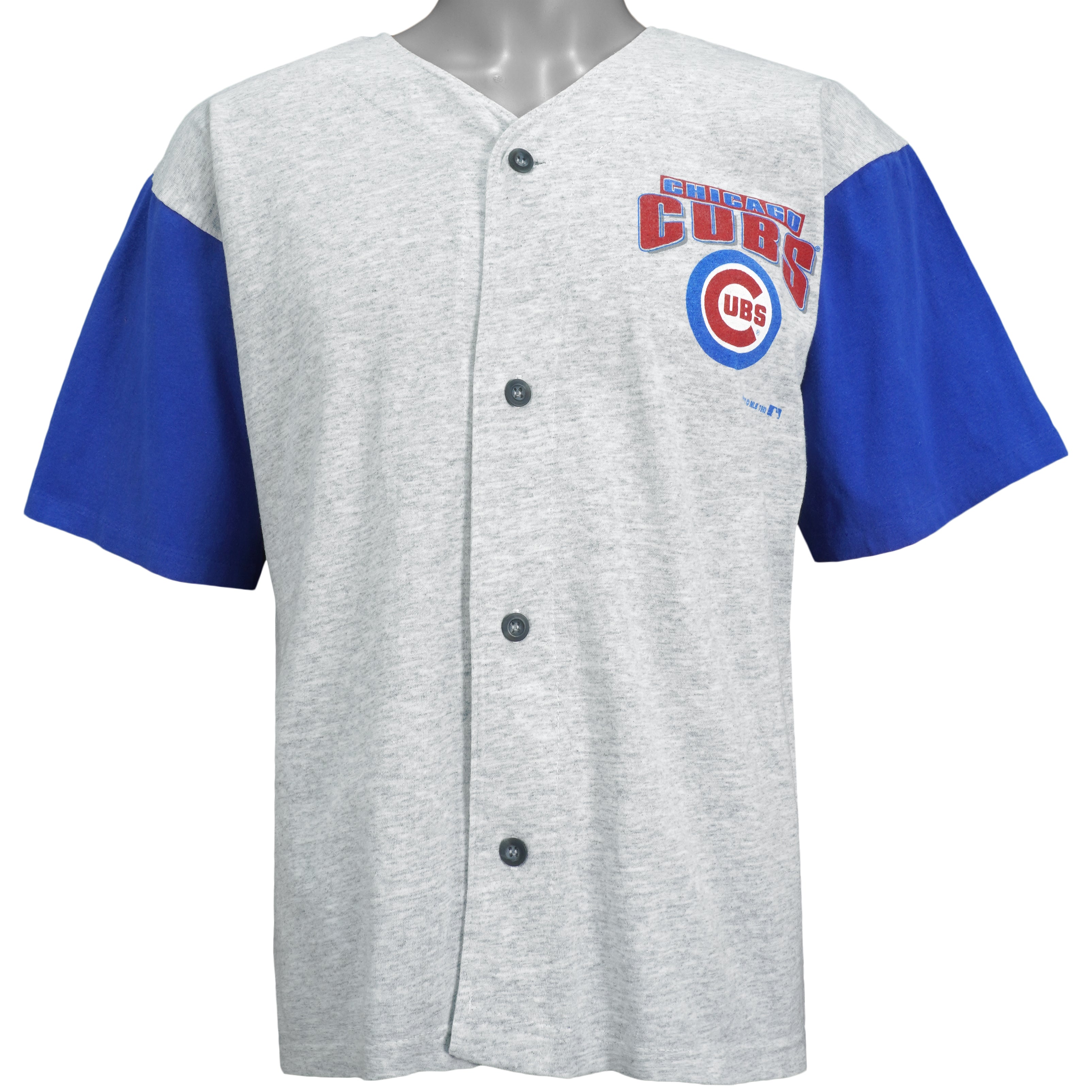 1993 Vintage MLB Chicago Cubs Button Up Single Stitch T-Shirt by Artex. Grey with blue in color, big logo & spell-out, fits medium size and is in excellent condition.