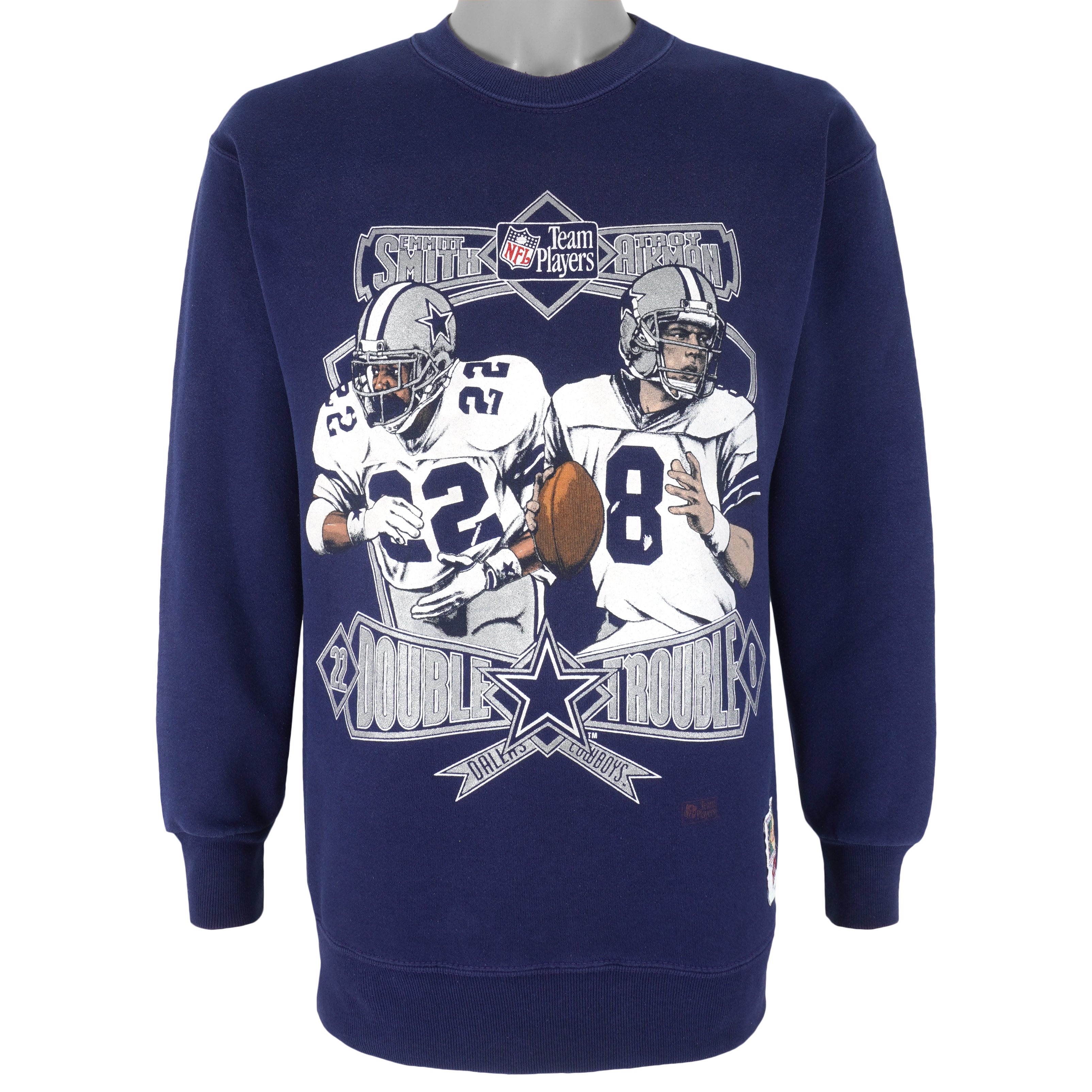 1990s Vintage NFL Dallas Cowboys Smith & Aikman Double Trouble Crew Neck Sweatshirt by Nutmeg. Blue in color with big spell-out and logo, fits medium to large size and is in excellent condition.