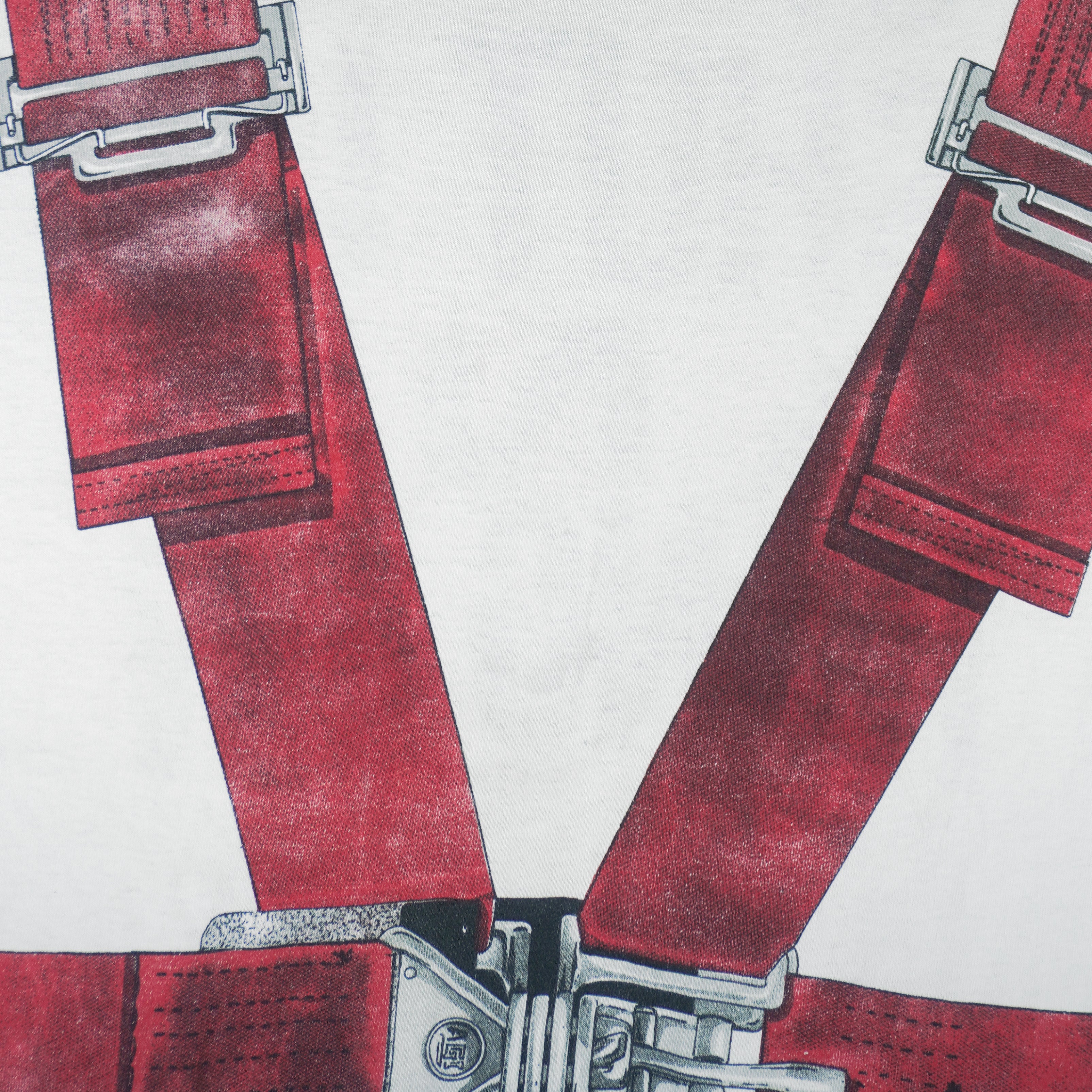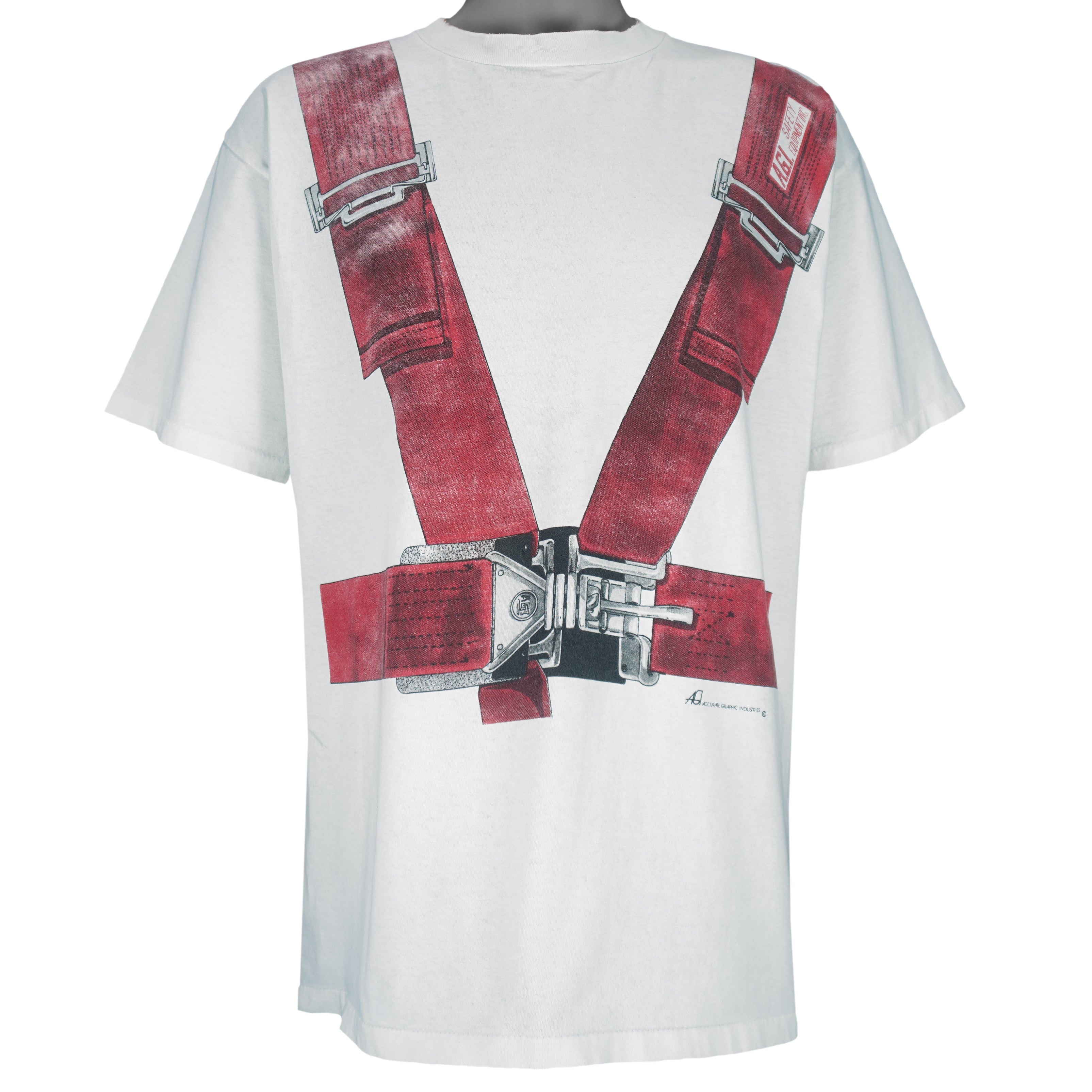 1990s Vintage Strap In And Hang On AGI Safety Equipments T-Shirt by All Sports. White​ in color, fits X-large size with mark and wear signs and is otherwise in very good condition.