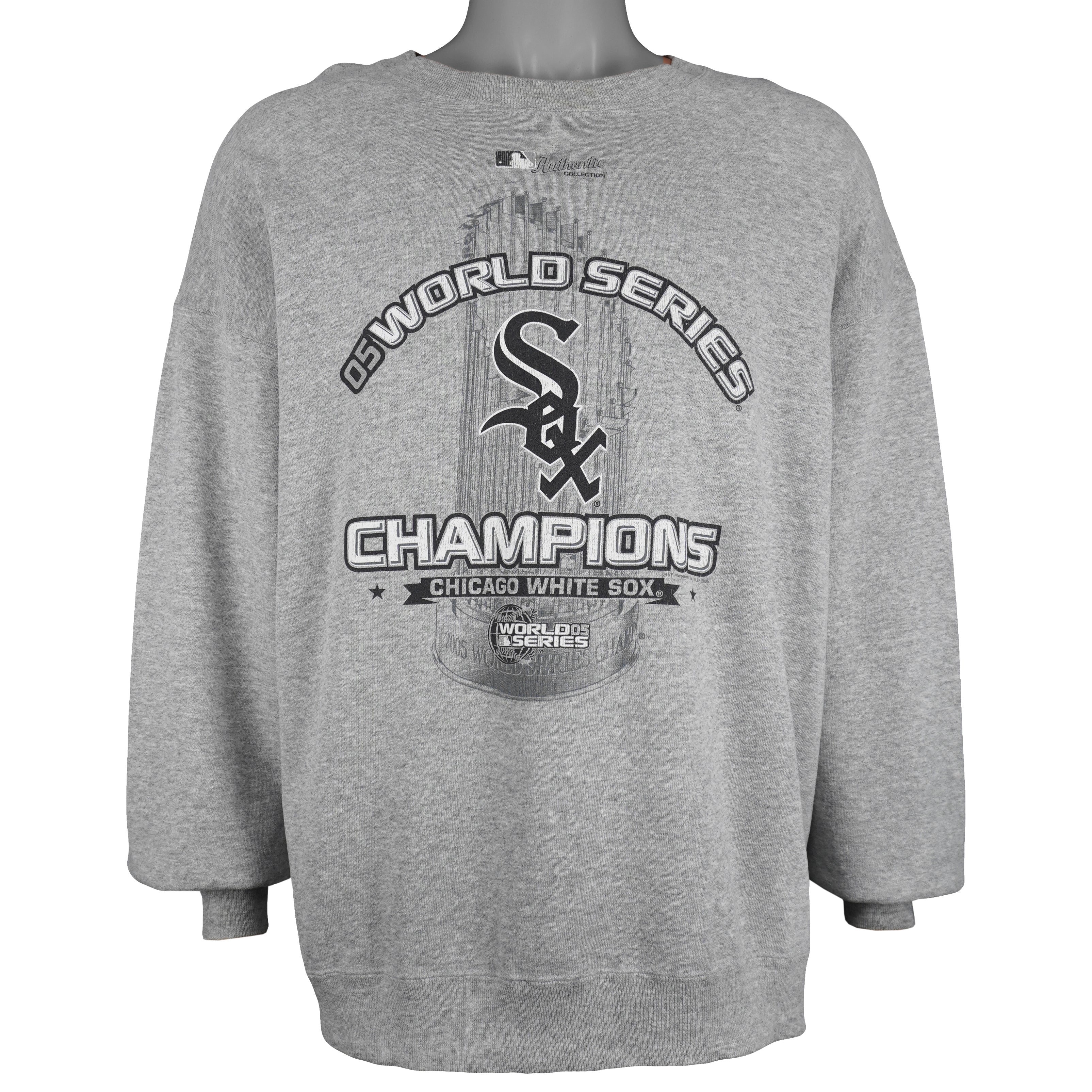 2005 Vintage MLB Authentic Collection Chicago White Sox World Series Trophy Crew Neck Sweatshirt by Lee. Grey in color, fits an XX-large size with signs of wear, minor marks and is in very good condition.