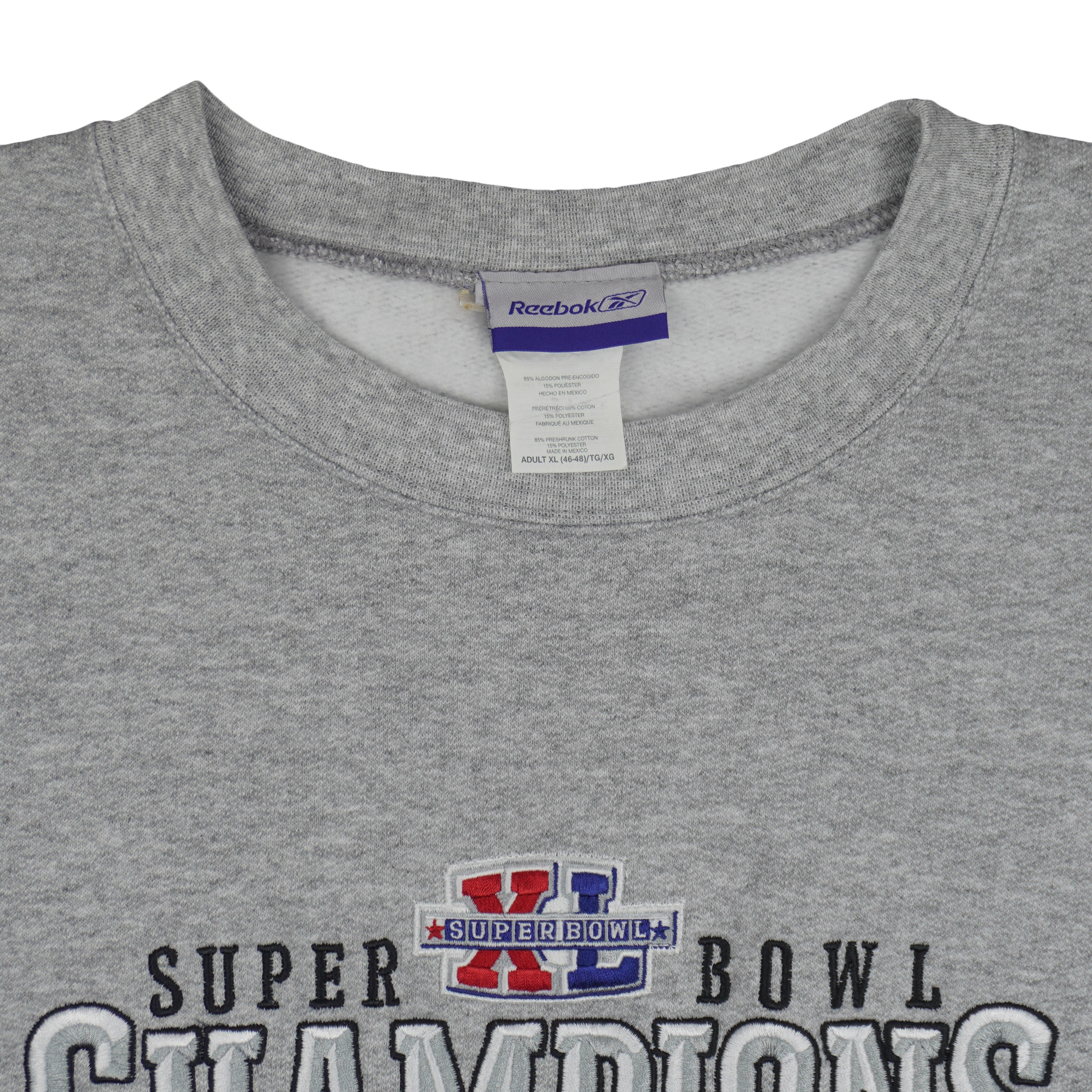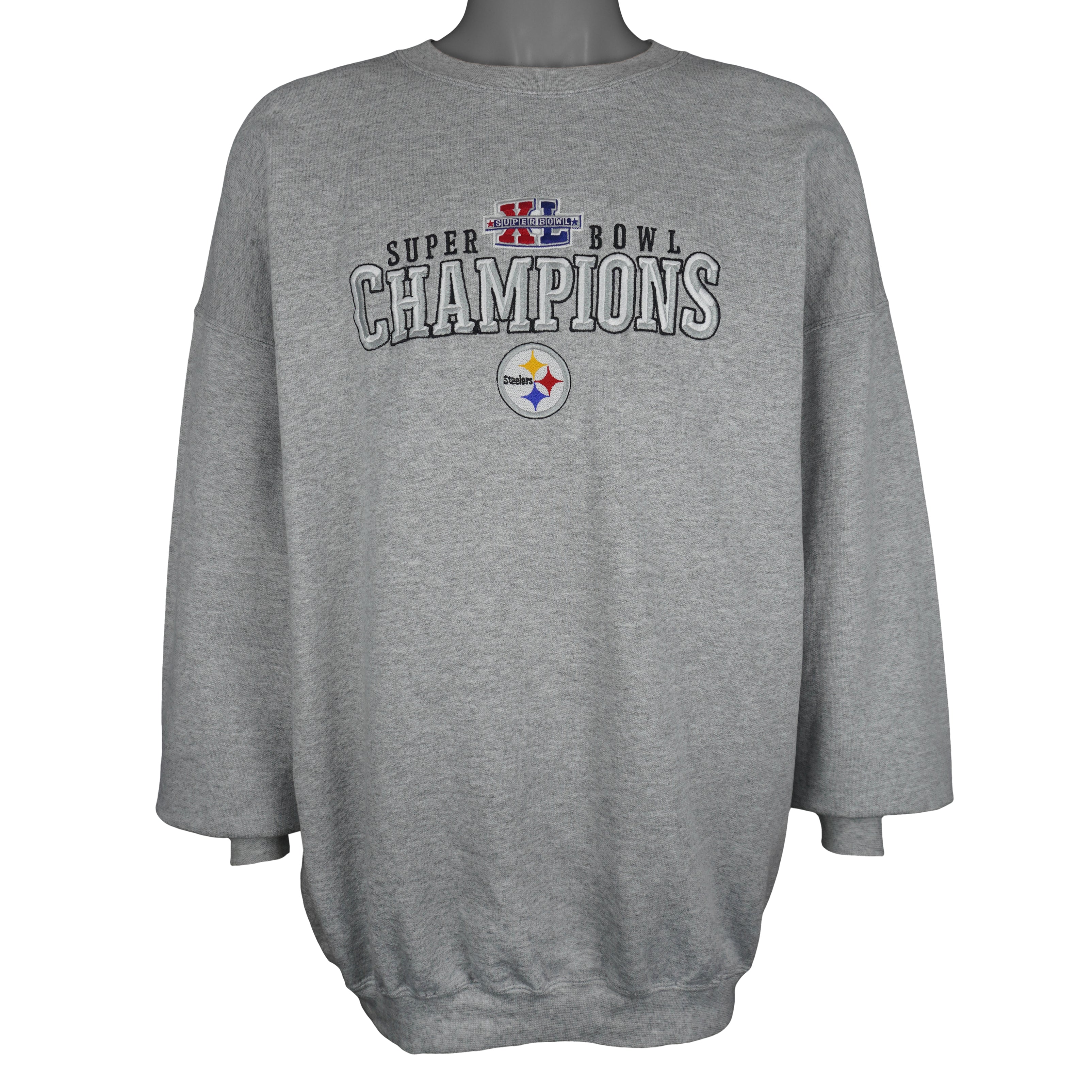 1990s Vintage Reebok NFL Pittsburgh Steelers Super Bowl Champions Crew Neck Sweatshirt. Grey in color, big spell-out embroidered, tag shows X-large but fits like an XX-large size with signs of wear and is otherwise in very good condition.