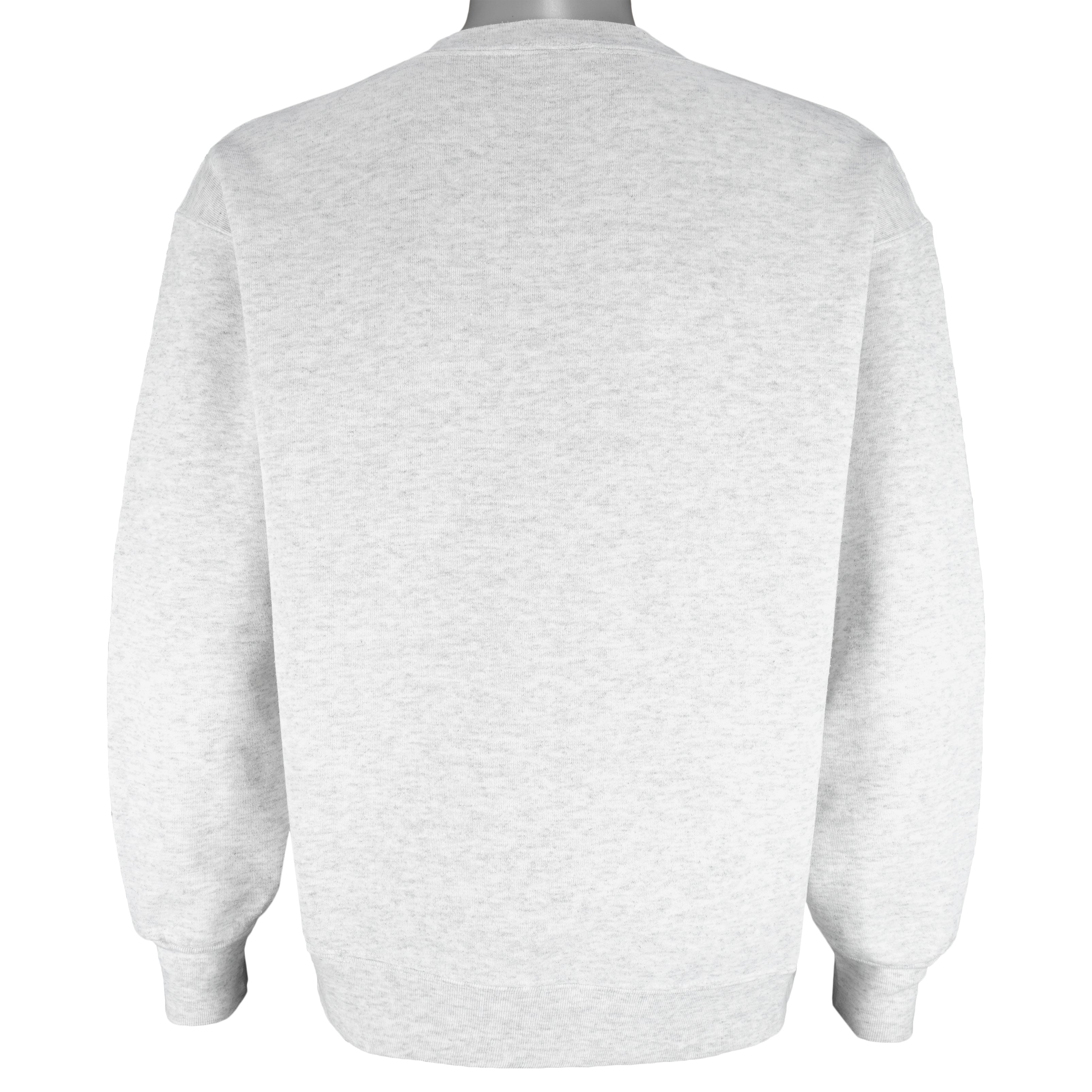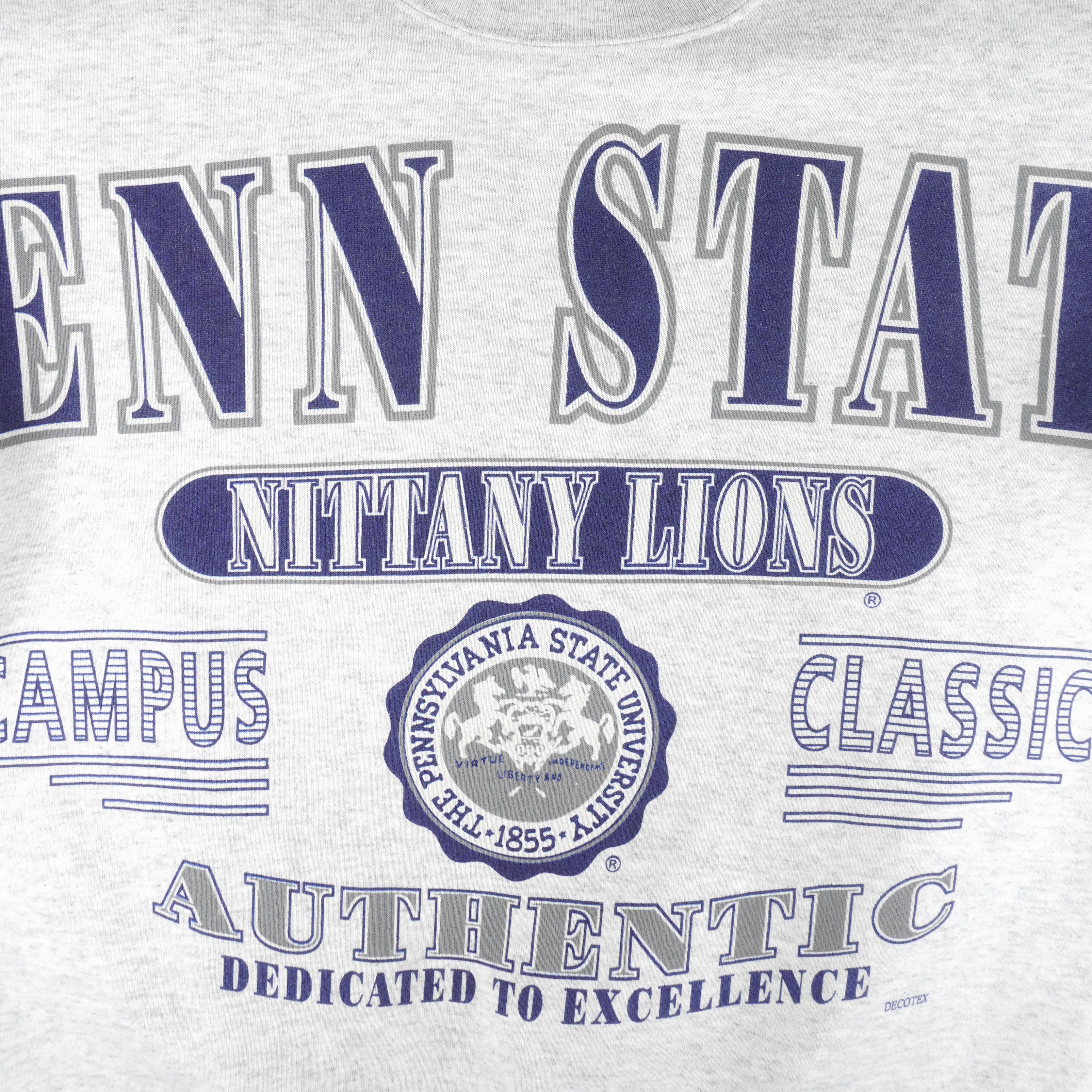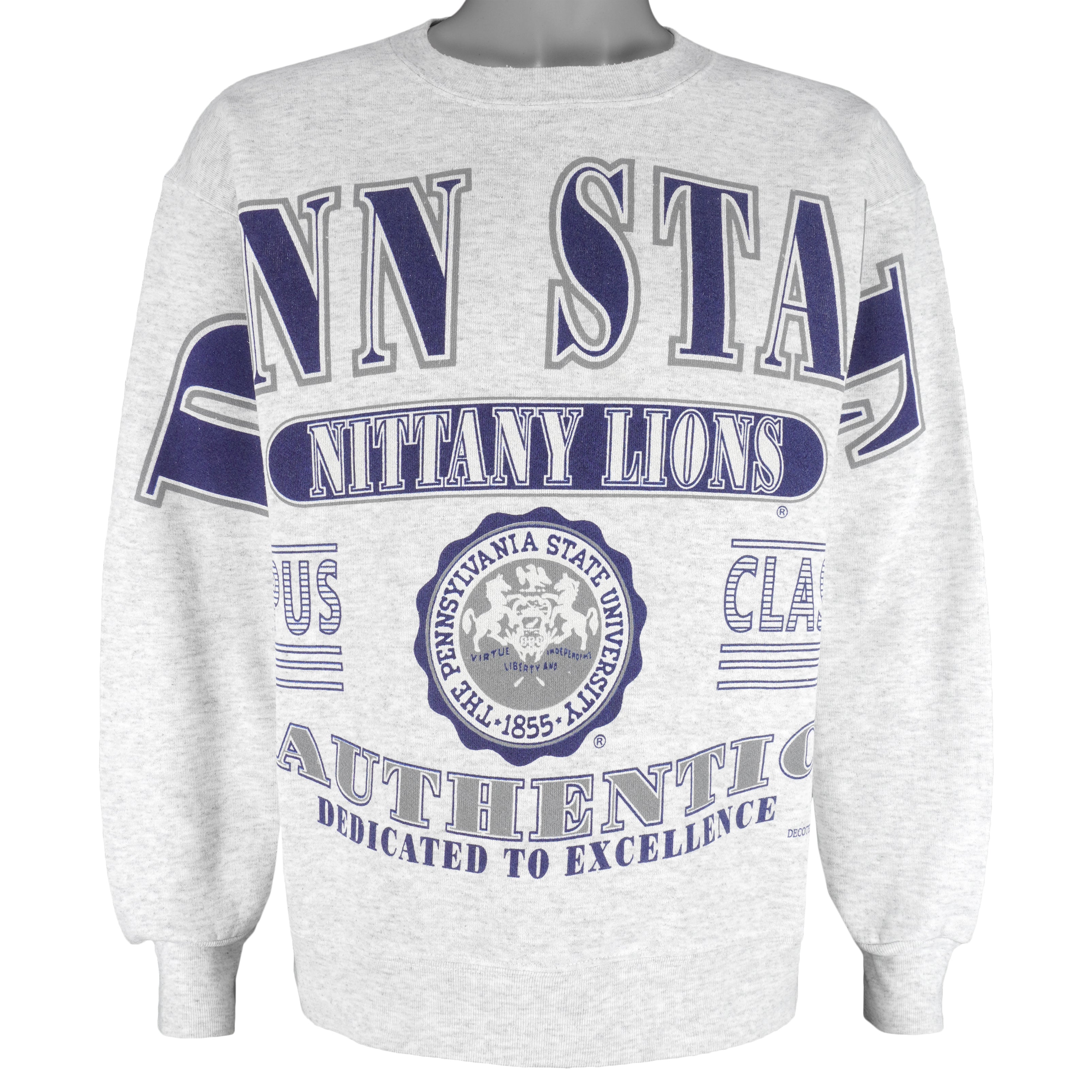 1990s vintage NCAA Penn State University Nittany Lions big spell-Out crew neck sweatshirt by Duck Head. Grey in color, fits large size and in excellent condition.