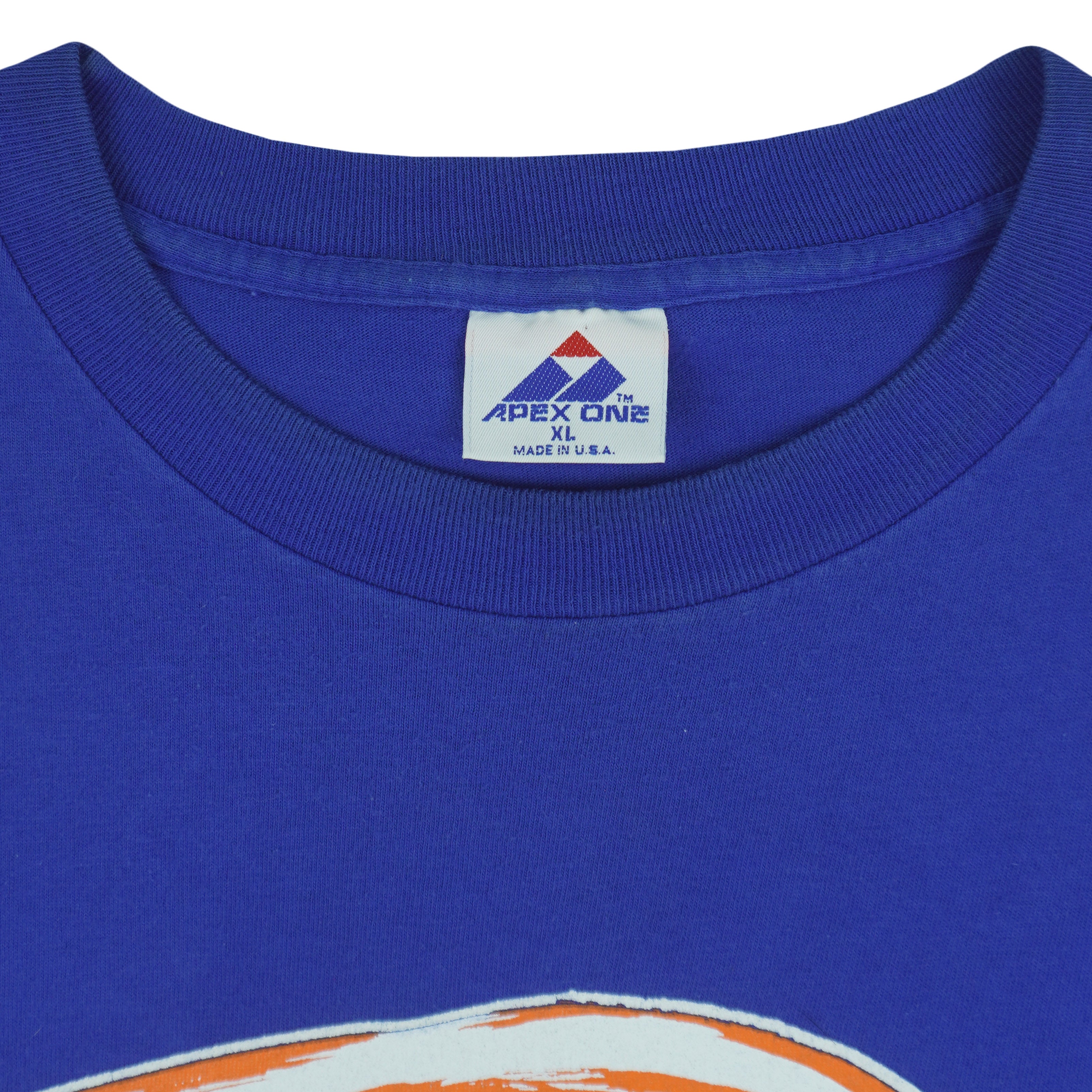 1993 Vintage NFL Denver Broncos Single Stitch T-Shirt by Apex One. Blue in color, big spell-out and logo, fitting a x-large size with signs of wear - visible discoloration marks on back with some minor stains and is otherwise in very good condition.