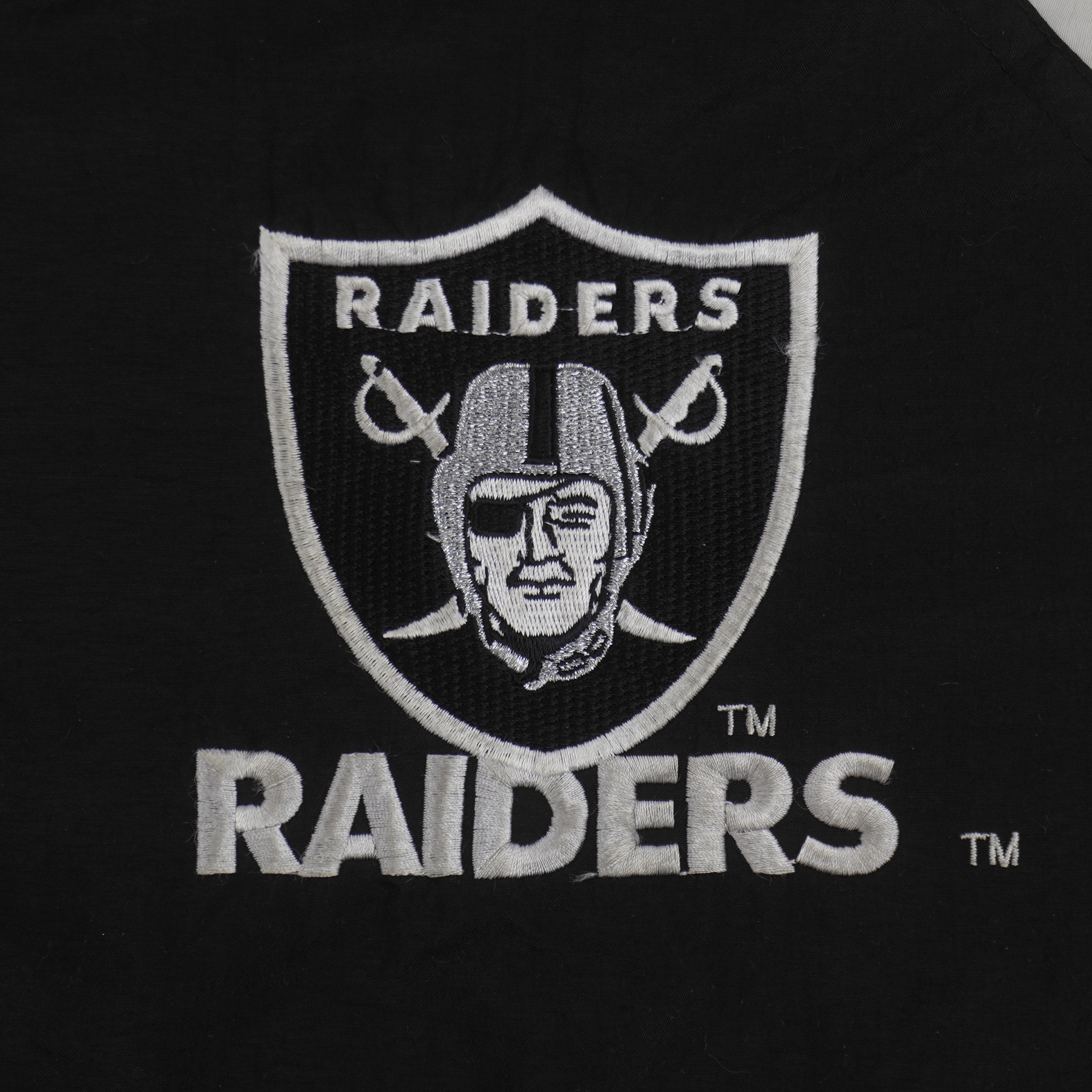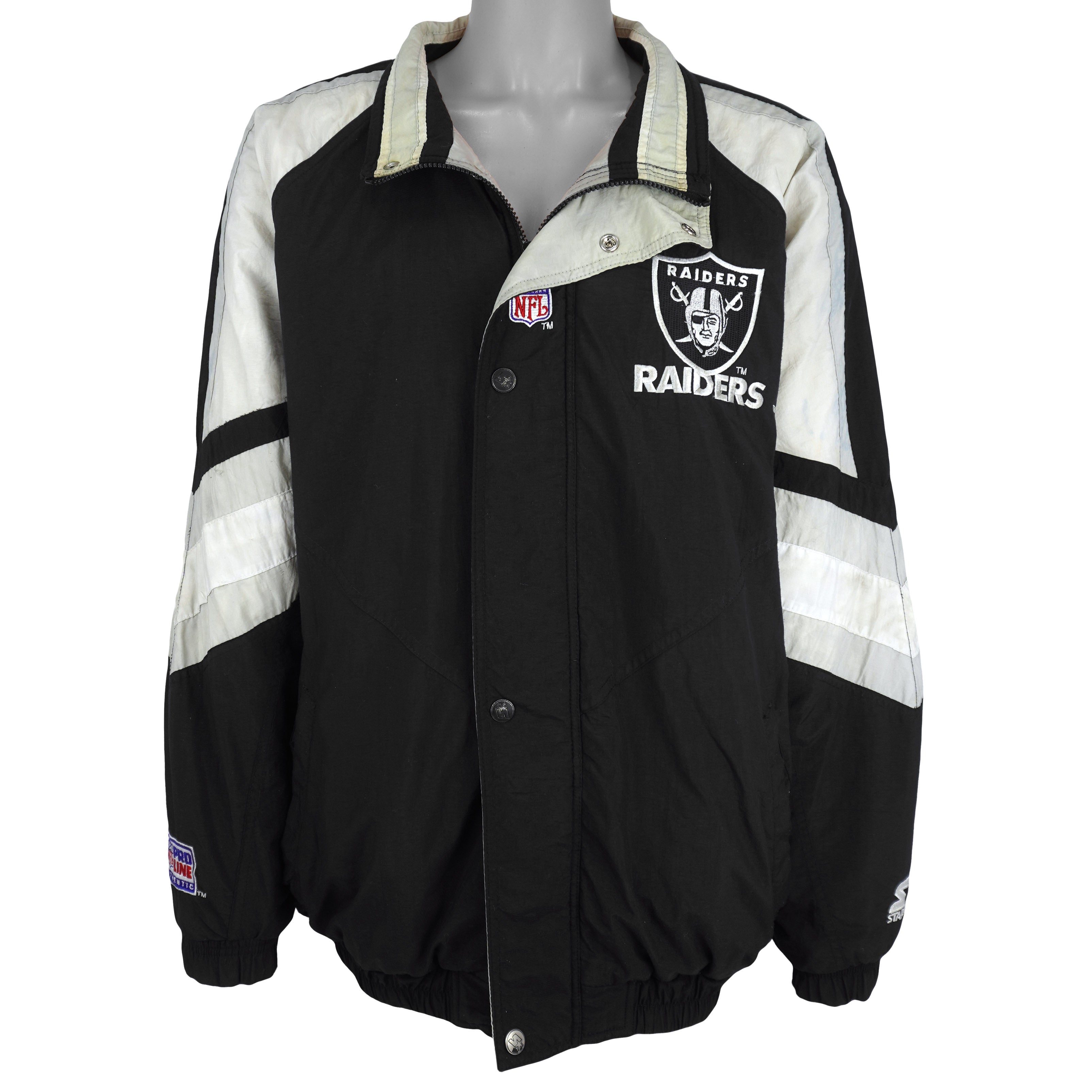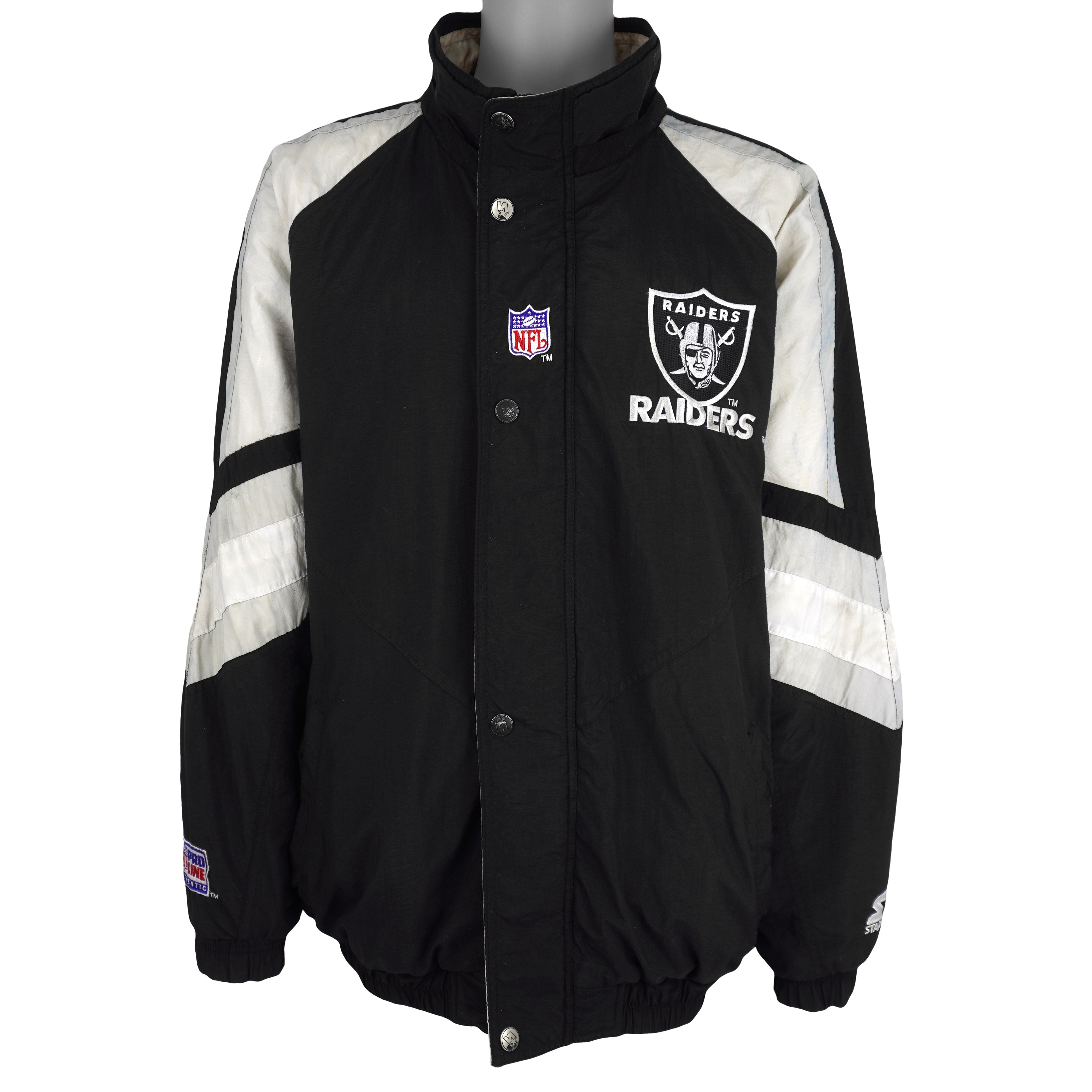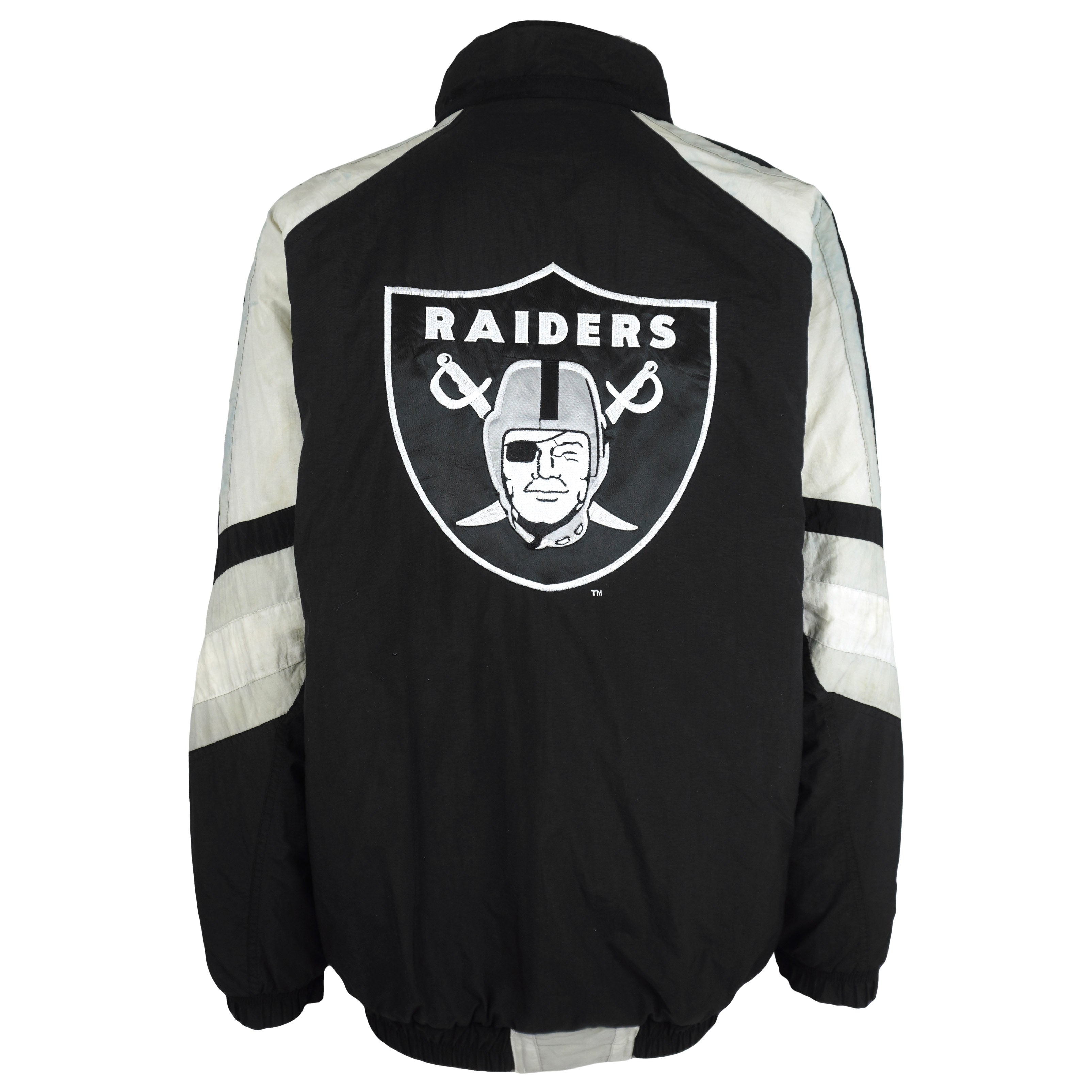 1990s Vintage Starter NFL Pro Line Oakland Raiders Embroidered Puffer Jacket. Black and white in color, big bold logo on back, fits an X-large size with signs of wear, minor marks with some light discoloration and is otherwise in very good vintage condition.