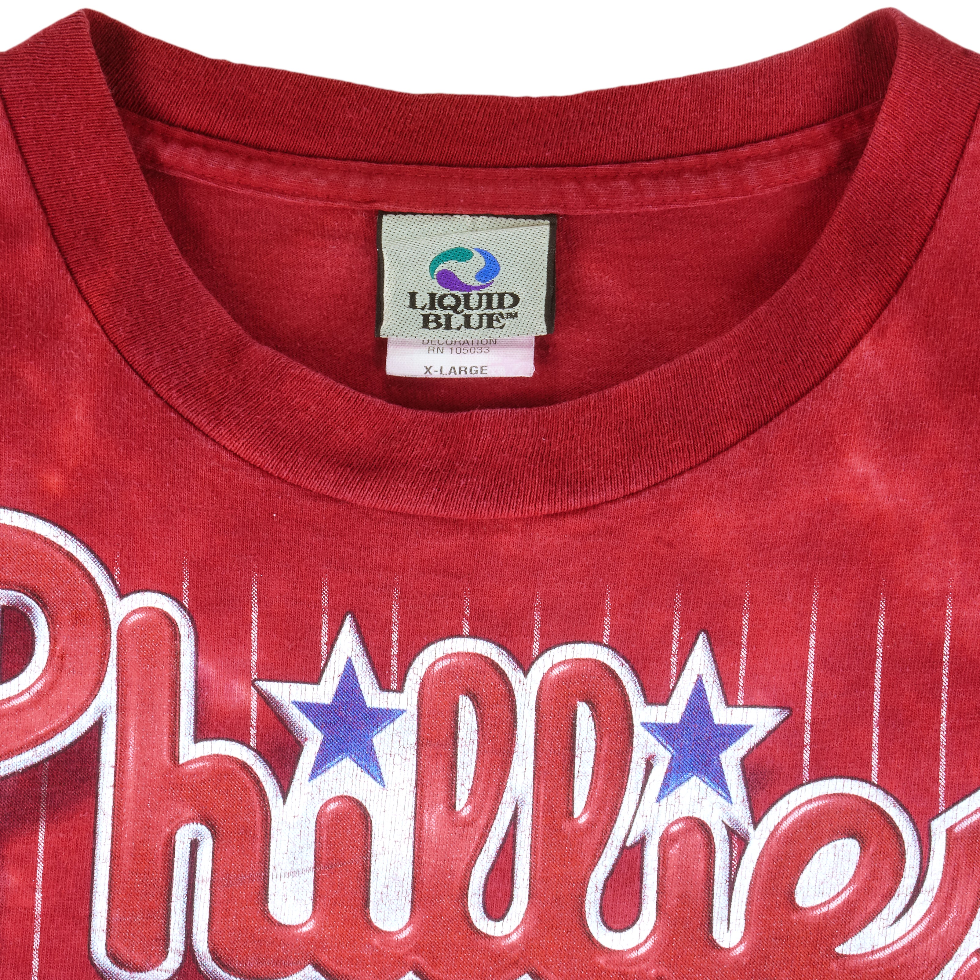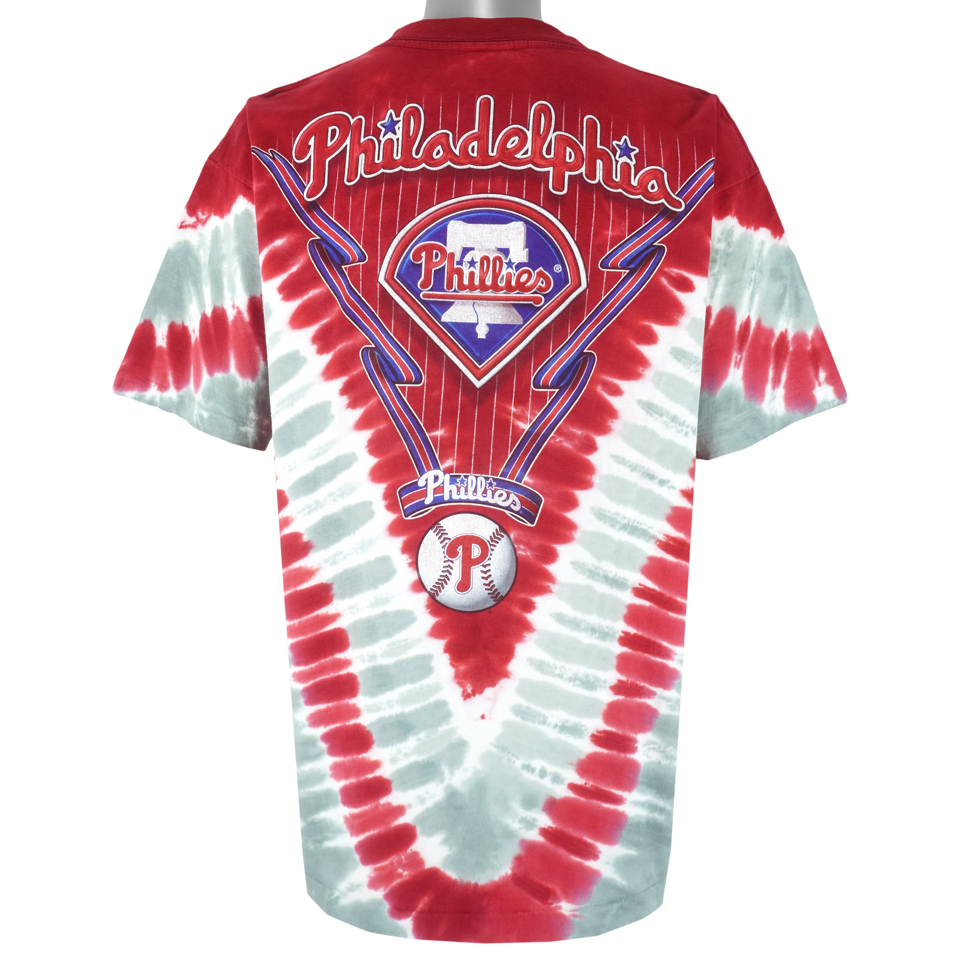 1990s Vintage MLB Philadelphia Phillies Big Spell-Out Tie Dye T-Shirt by Liquid Blue. Red with white in color, fits X-large size and is in excellent condition.