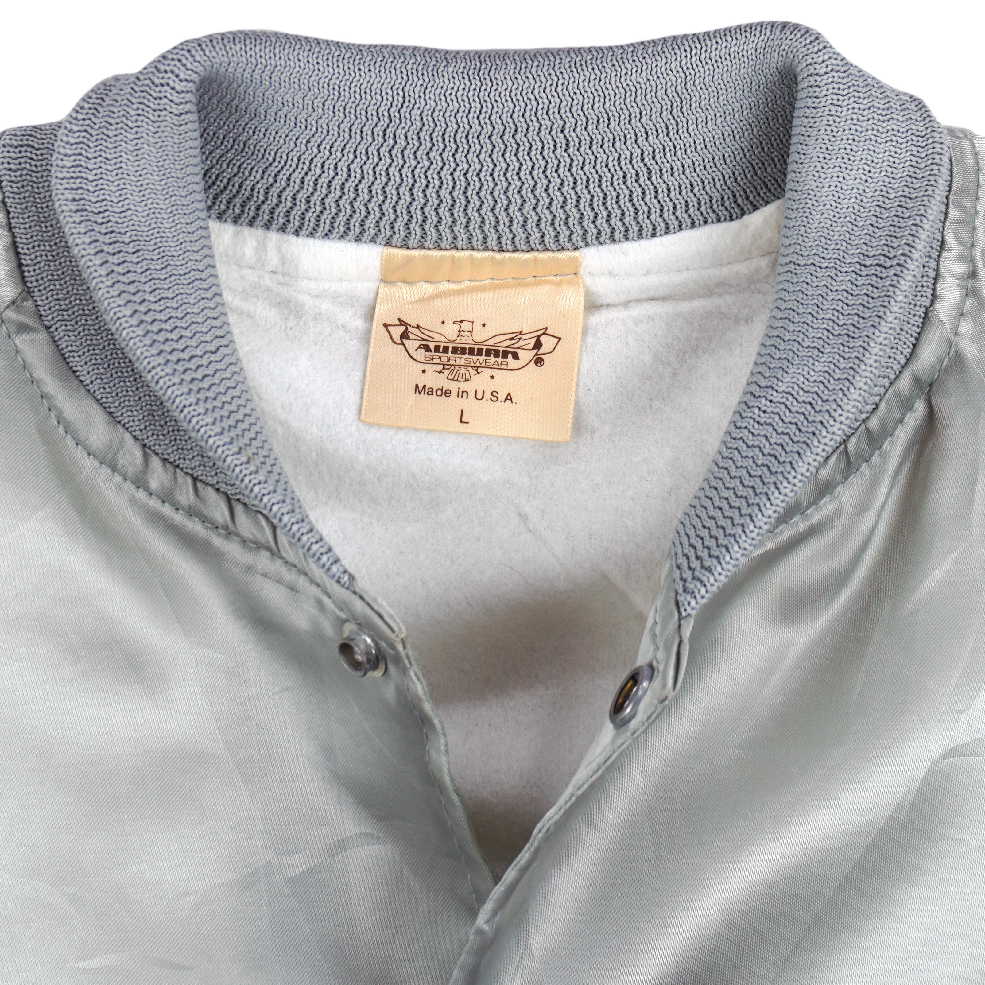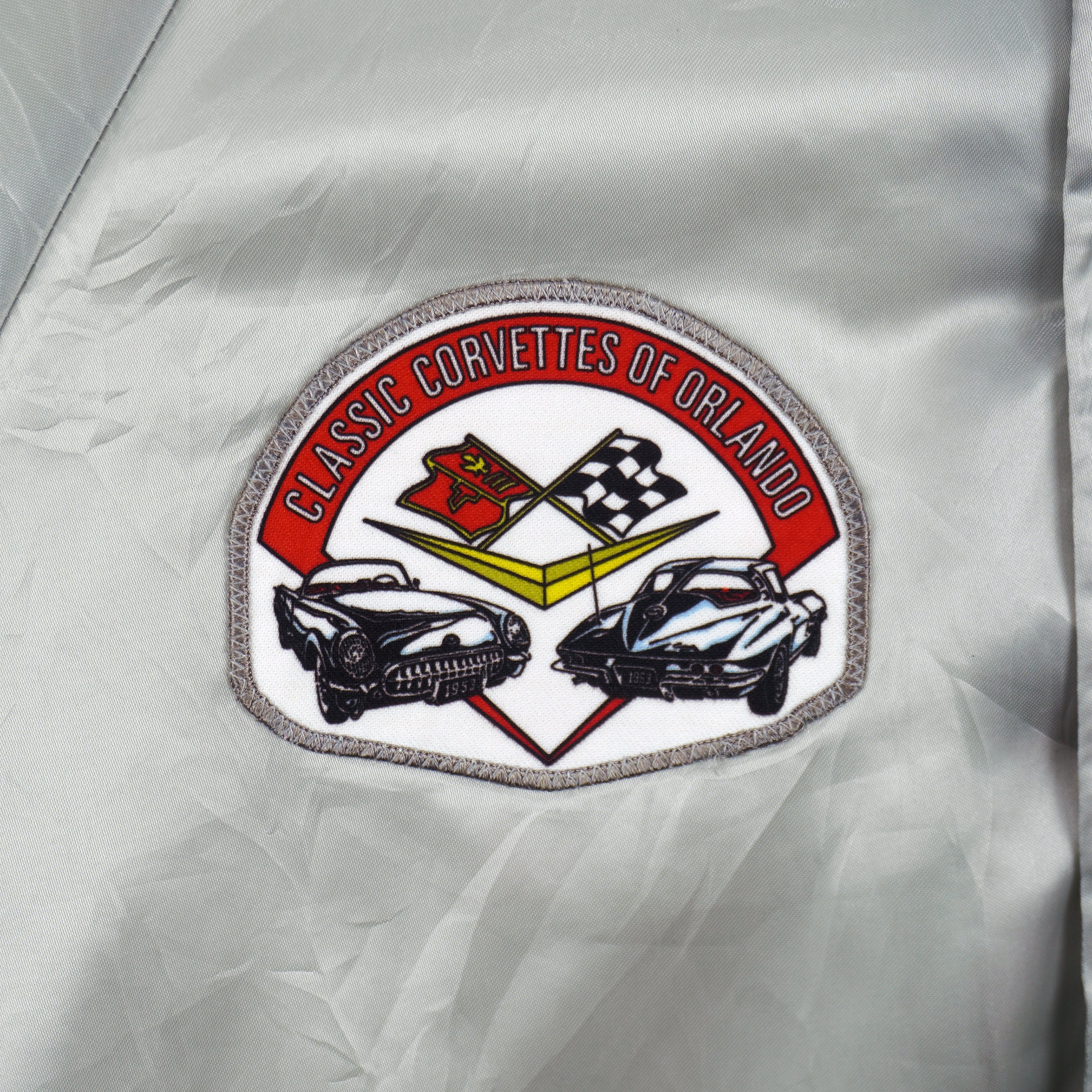 1990s Vintage Classic Corvette Of Orlando Embroidered Button-Up Satin Jacket by Auburn. Grey in color, fitting a large size with signs of wear, discoloration/minor mark and is otherwise in very good condition.